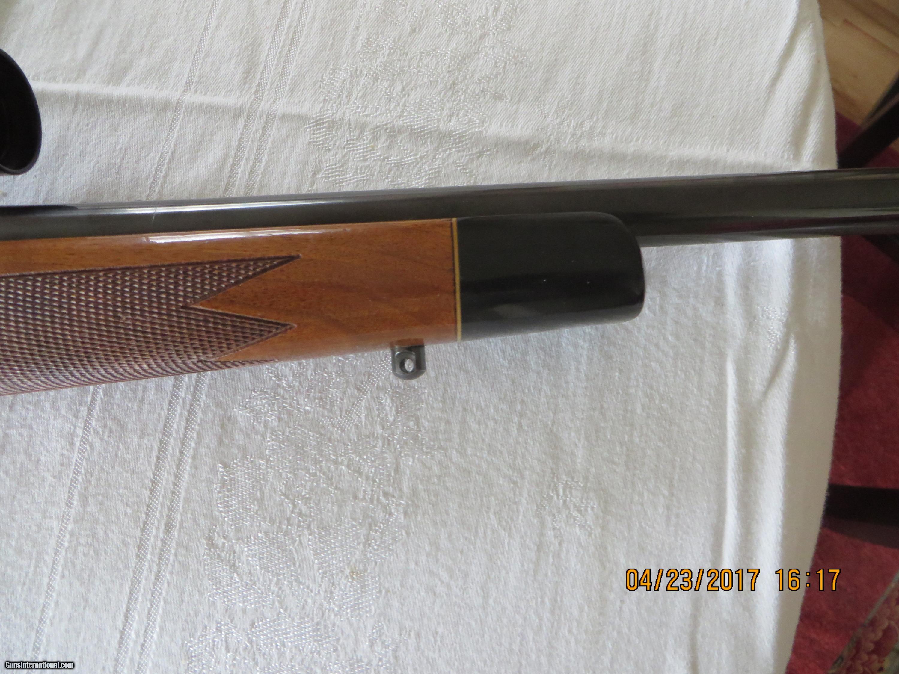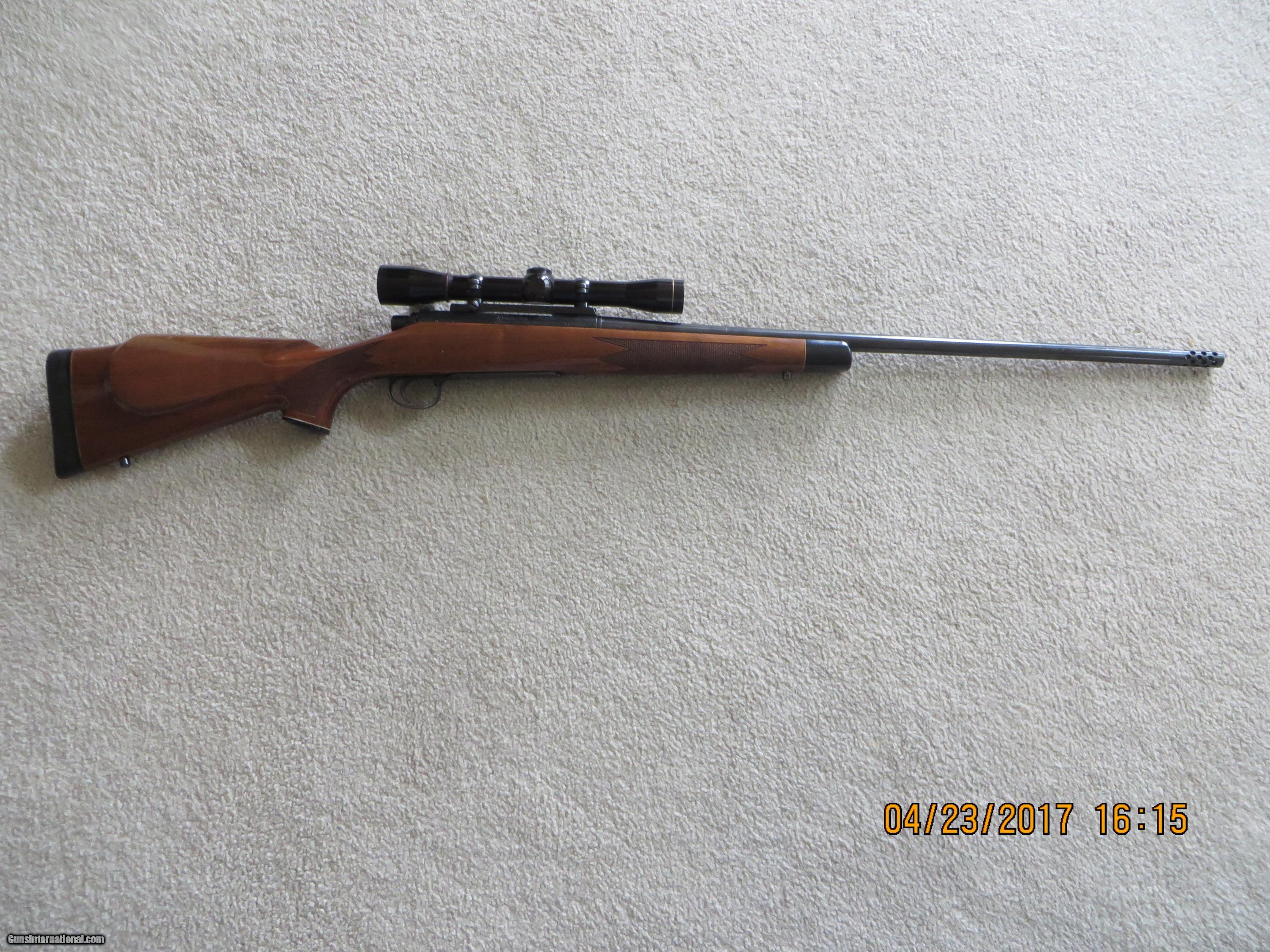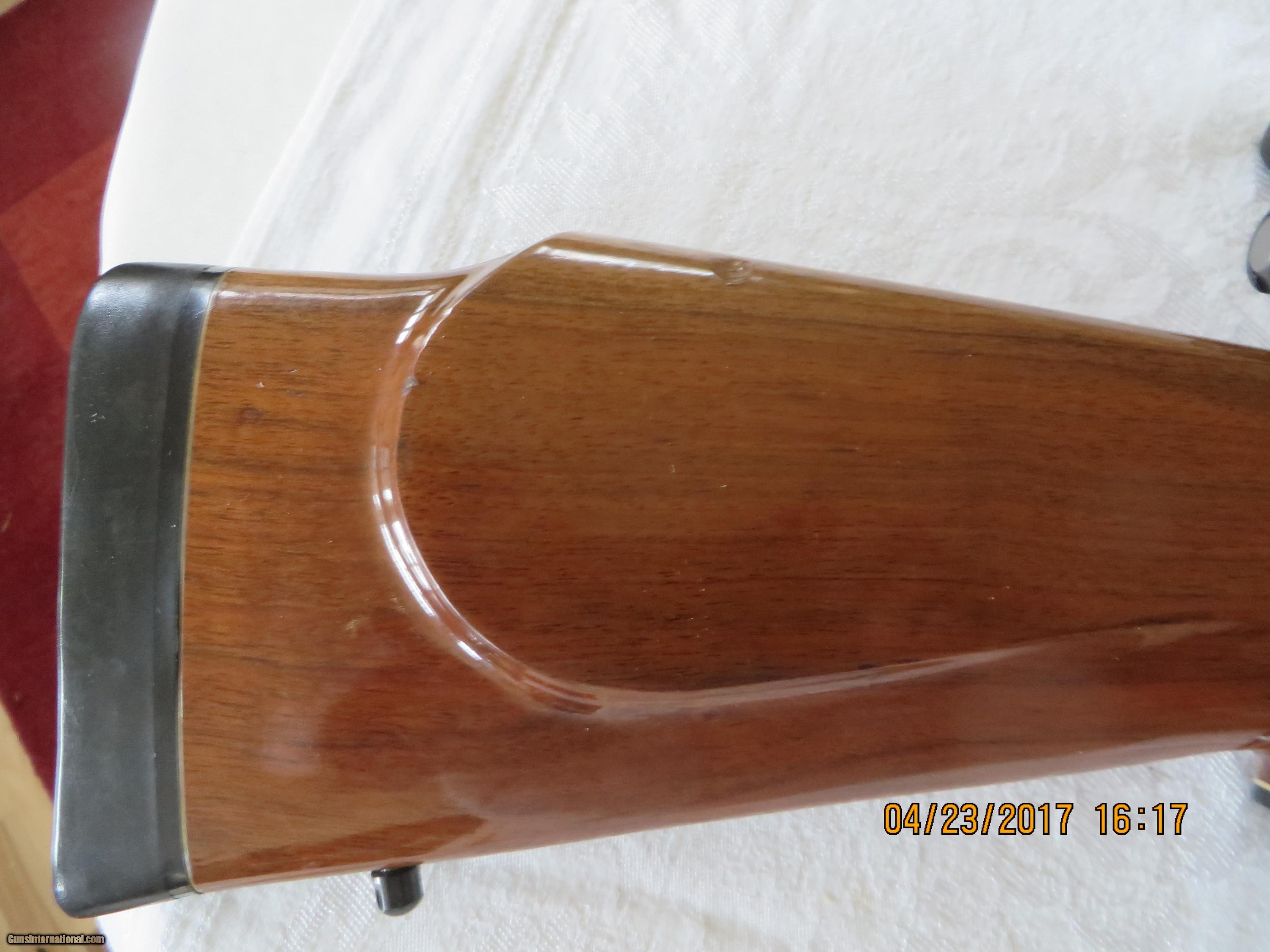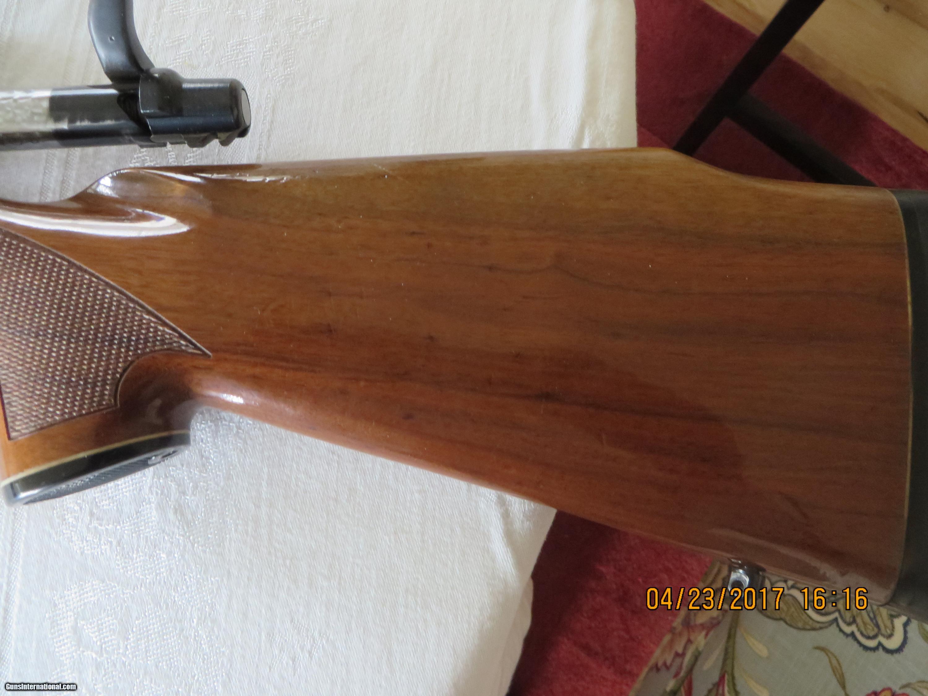 Description: PRICE JUST REDUCED Remington 700 BDL, LEFT HAND, in 7m/m Remington Mag. This rifle is in good condtion with some small scratches on the stock and a small ding that is on the top of the cheek piece. Blue is in good condition with only a very little wear on the high points. The rifle has a Timmney Trigger, muzzle brake, Leupold MX-8, 4 Power scope with a duplex reticle, and Leupold mounts and rings. This is a terrific cartridge for North American Game with a wide varity of bullets available for it. Overall the gun is in Good condition with about a 93-94% wood rating and about a 95-96% rating for the metal, the bore is in very good condition with sharp rifling easily seen. This is an older BDL with pressed checkering. We offer a 3 day NON-FIRING inspection period. This rifle, as with all used guns, should be inspected by a trusted gunsmith before firing. No California sales, Sorry. Shipping, packing, and insurance will be at actual cost. Shipping will be to a U.S. FFL holder, only. This rifle is ready to hunt. SOLD |