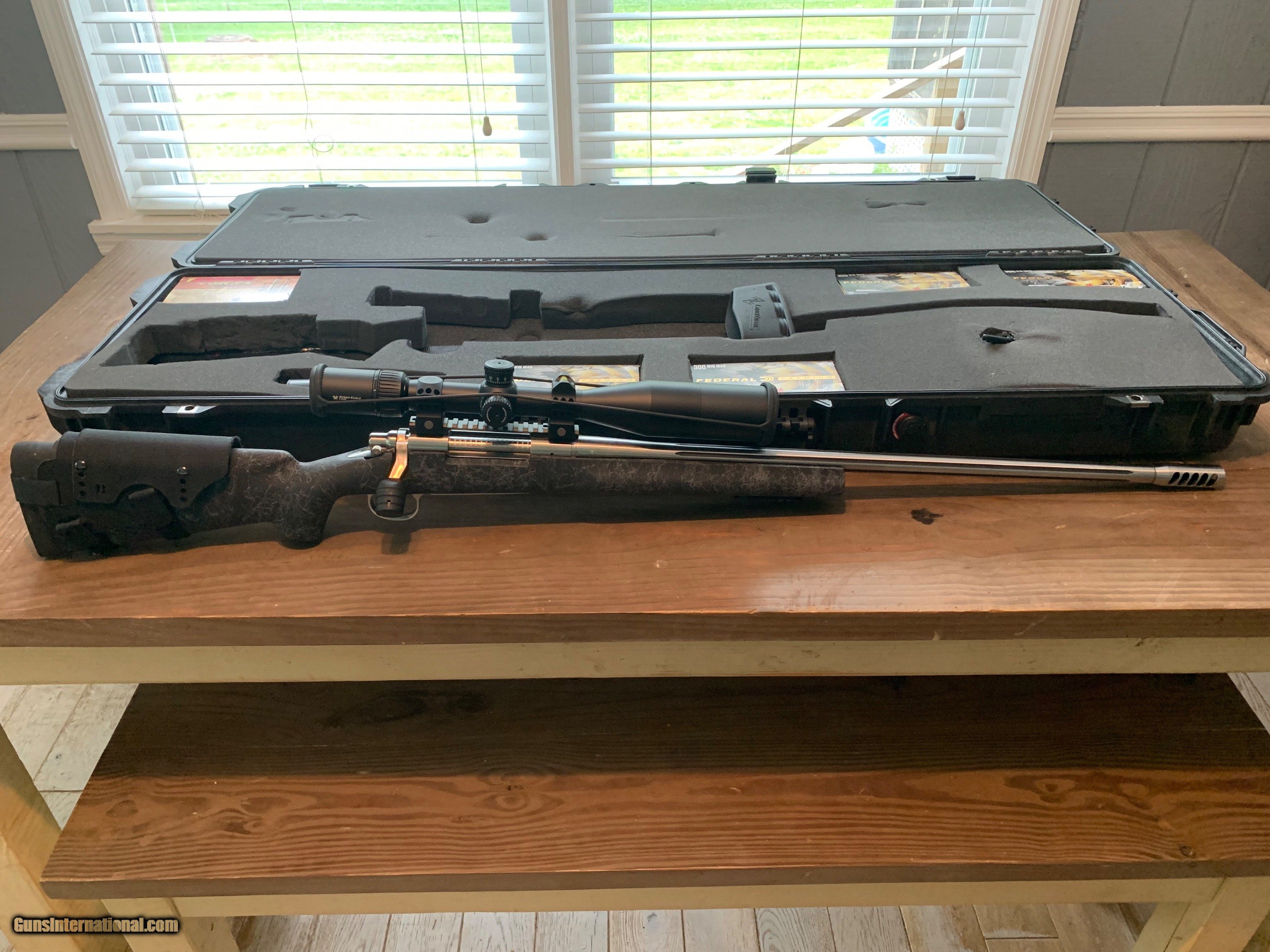 Description: Remington 700 Sendero SF II with custom bed job. Timney Elite Hunter straight trigger set at 2 lbs. Threaded 5/8-24 with 5 port Beast muzzle brake, Bradley adjustable cheek rest, Leupold Mark 4 20 MOA base, Night Force six screw 30mm rings with Night Force front ring level. Vortex Strike Eagle 4-24×50 illuminated scope with EBR-4 MOA reticle. KRG large bolt lift. Accu-Tac FC-5 G2 bipod, Pelican 1750 case. Rifle shoots 1/2” 5 shot groups with Federal 200 grain Terminal Ascent, Hornady 200 grain ELD-X, and Barnes 180 grain TTSX. Everything listed here was bought brand new. Rifle has less than 140 rounds through it. 1,000 yard shots on steel have become fairly easy with this set up using the factory Federal and Hornady rounds listed above. $3,000 SOLD Rifle Caliber: .300 Winchester Magnum Manufacturer: Remington Model: 700 Barrel Length: 26” Condition: Excellent Metal Condition: Excellent Bore Condition: Excellent |