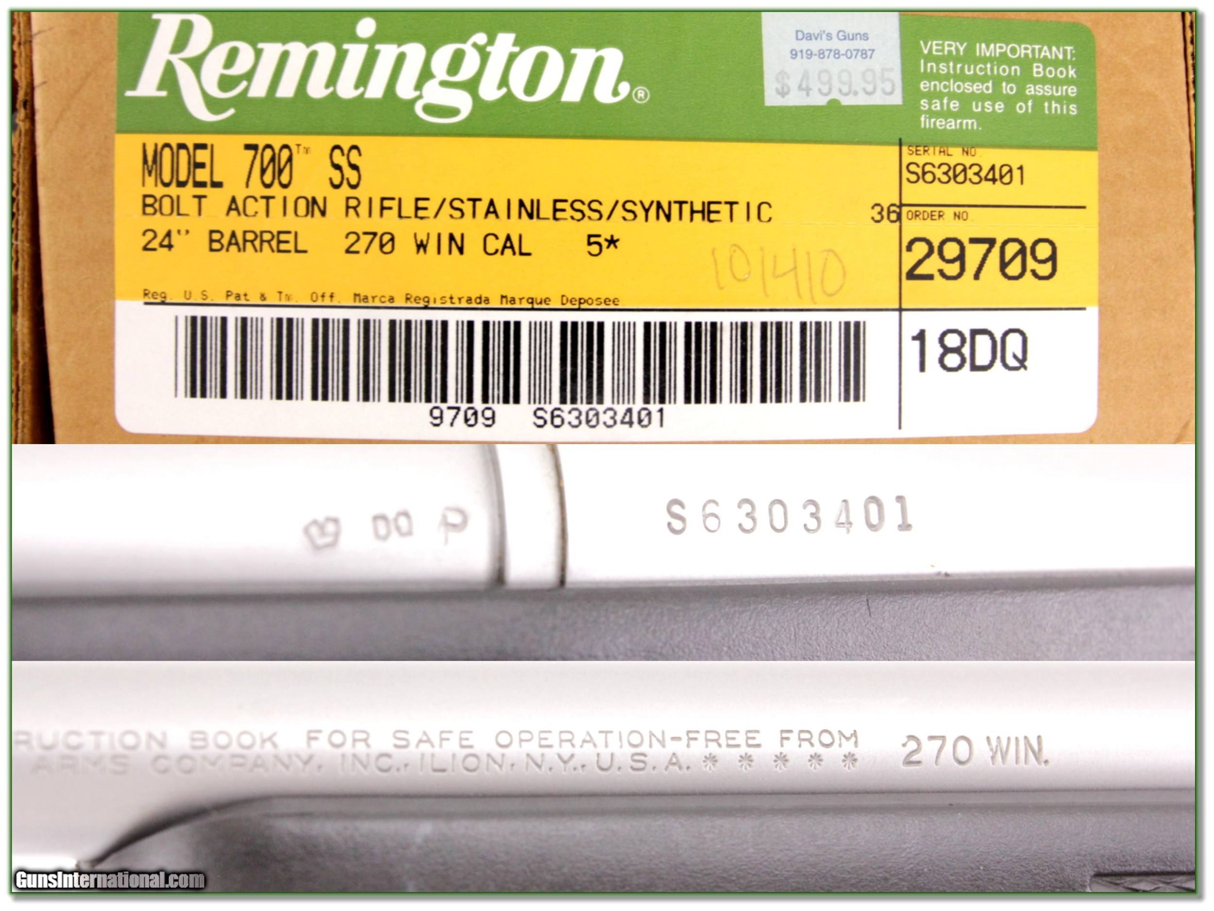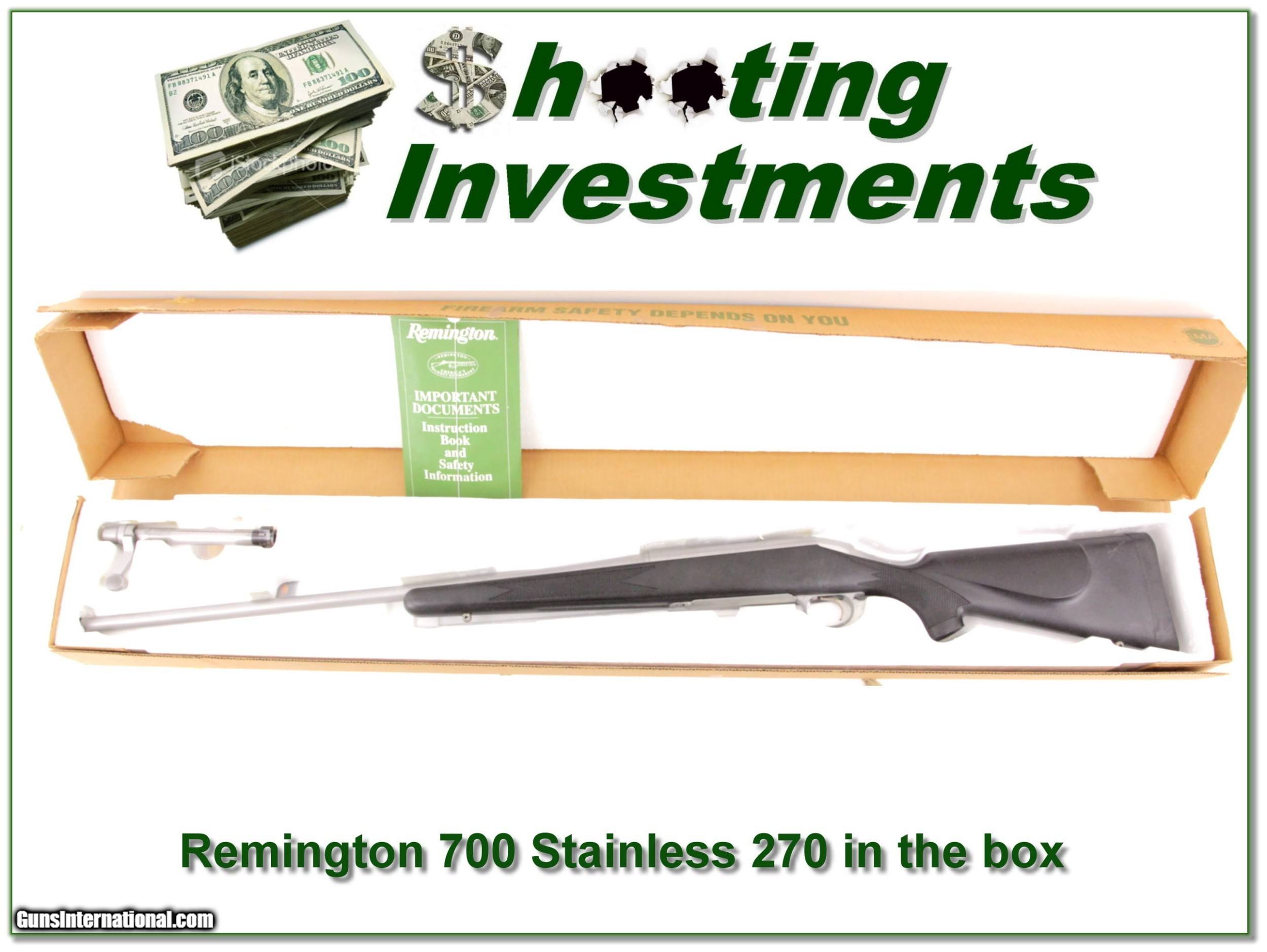 Description: This is a Remington 700 Stainless in 270 Winchester. It was made in 90’s and I’m selling it for its original owner. It has a 24in barrel and comes as seen in original box. It still has the VHS video that Remington shipped with guns back then unopened. This gun was used and has some minor marks as seen but still will make a fantastic all-weather hunting gun and MUCH less than a new one of equal quality. I am selling this one on consignment and as such lay-a-way can’t be used. It does of course have the standard 3-day inspection. Shipping with insurance is $39. Please email me with any questions or larger pictures. (Consign your quality firearms with Shooting Investments for only 12%! Let me know if you have any you would like to sell!) 19-0870 Payment: Payment is by Money Order, Cashiers Check or Personal Check. I can now also accept Credit Cards (MasterCard, Visa, Discover & American Express) with a 3% convenience fee. PayPal can be used for some items but never for firearms. Shipping: The shipping charge will be listed in each description. It is $39 for most firearms. Some heavy guns or those insured for over $2000 will be higher. Shipments to Alaska and Hawaii are higher because air shipment is required. Most firearms are shipped on Tuesday and Thursday and usually in 5 days of receipt of payment. We package all shipments carefully and insure them. Optics are shipped Priority Mail and most other non-firearm shipments are shipped First Class. Returns: Our return policy is simple. If for any reason you are not pleased with your purchase, you may return your item for a full refund of purchase price. Ammunition cannot be returned. It is important to us that you are happy. Guns cannot be fired or dissembled before returning them and they must be returned in the same condition as received. Notification of a return must occur with-in 3 days of receipt at your dealer. Shipping, convenience and dealer fees are not refundable and are the responsibility of the buyer. Lay-a-way: If needed, we offer a 60 day lay-a-way option on most firearms. It is 1/3 now, 1/3 in 30 days and 1/3 in 60 days. Lay-a-way firearm sales are final and if not completed the first payment cannot be returned. Consigning your firearms with Shooting Investments: We will help you get top dollar for your firearms. While most local guns shops charge 20% or more, our fee is only 12% with a minimum of $75. At your local gun shop it might take months to sell. Selling on-line provides instant access to thousands of interested buyers. You won’t find any other on-line dealer willing to sell your firearms for only 12% or listing every gun on 3 separate s. Selling through an House typically costs the seller 15% and the buyer an addition 15% (so 30%) and you have to wait several months to sell and longer to receive funds. If properly priced, we will sell your firearms in a few weeks. Send us an email or give us a call and we’ll explain how easy it is for you to get top dollar. Trading: Trading for use is really just buying your gun to re-sell. If you have a gun you want to trade, please email a picture and we will let you know what we can give or it. You will always get more if we sell it for you on consignment. Help for California Buyers: We are happy to ship to California. It is the buyer’s responsibility to make sure any item you buy is legal in your state. We are also happy to help with your purchase of a firearm from someone other than us. If you see a gun you would like to buy but the seller can’t or won’t ship to California they can ship to use and we’ll then ship it to your California dealer. The cost for this service is only $30 + shipping. Let us know if we can help! SOLD |