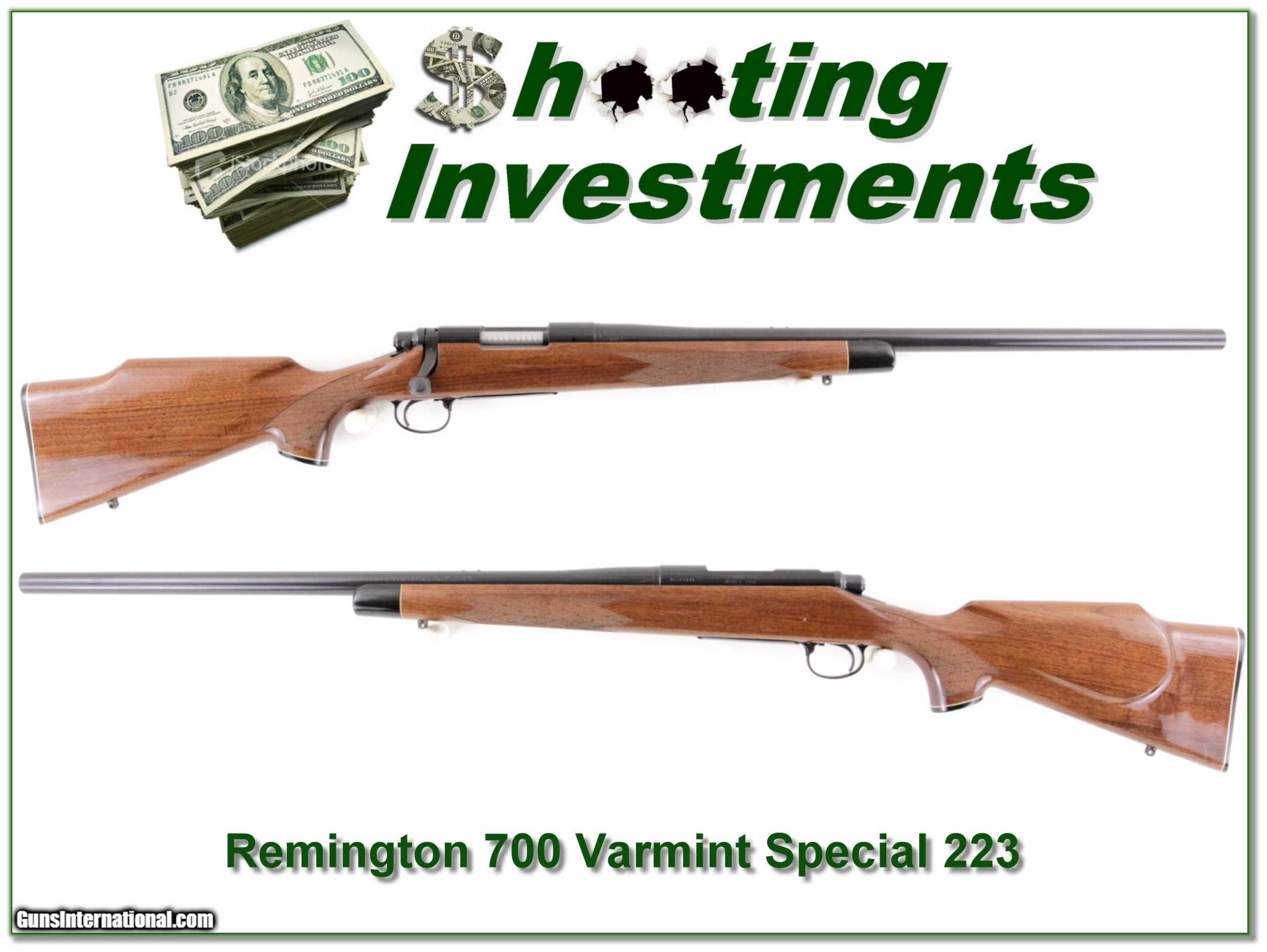 Description: This is a collector condition Remington 700 Varmint Special in 223 Remington! From the bolt I’m sure not many rounds fired. The blue looks new and I see no marks of note on the wood! It will make a classic gun for the range or field or be a fine addition to your collection. Either way, it is a Shooting Investment! Shipping with insurance is $39. Please email me with any questions or larger pictures. (Consign your quality firearms with Shooting Investments for only 12%! Let me know if you have any you would like to sell!) 19-0027 Payment: Payment is by Money Order, Cashiers Check or Personal Check. I can now also accept Credit Cards (MasterCard, Visa, Discover & American Express) with a 3% convenience fee. PayPal can be used for some items but never for firearms. Shipping: The shipping charge will be listed in each description. It is $39 for most firearms. Some heavy guns or those insured for over $2000 will be higher. Shipments to Alaska and Hawaii are higher because air shipment is required. Most firearms are shipped on Tuesday and Thursday and usually in 5 days of receipt of payment. We package all shipments carefully and insure them. Optics are shipped Priority Mail and most other non-firearm shipments are shipped First Class. Returns: Our return policy is simple. If for any reason you are not pleased with your purchase, you may return your item for a full refund of purchase price. Ammunition cannot be returned. It is important to us that you are happy. Guns cannot be fired or dissembled before returning them and they must be returned in the same condition as received. Notification of a return must occur with-in 3 days of receipt at your dealer. Shipping, convenience and dealer fees are not refundable and are the responsibility of the buyer. Lay-a-way: If needed, we offer a 60 day lay-a-way option on most firearms. It is 1/3 now, 1/3 in 30 days and 1/3 in 60 days. Lay-a-way firearm sales are final and if not completed the first payment cannot be returned. Consigning your firearms with Shooting Investments: We will help you get top dollar for your firearms. While most local guns shops charge 20% or more, our fee is only 12% with a minimum of $75. At your local gun shop it might take months to sell. Selling on-line provides instant access to thousands of interested buyers. You won’t find any other on-line dealer willing to sell your firearms for only 12% or listing every gun on 3 separate s. Selling through an House typically costs the seller 15% and the buyer an addition 15% (so 30%) and you have to wait several months to sell and longer to receive funds. If properly priced, we will sell your firearms in a few weeks. Send us an email or give us a call and we’ll explain how easy it is for you to get top dollar. Trading: Trading for use is really just buying your gun to re-sell. If you have a gun you want to trade, please email a picture and we will let you know what we can give or it. You will always get more if we sell it for you on consignment. Help for California Buyers: We are happy to ship to California. It is the buyer’s responsibility to make sure any item you buy is legal in your state. We are also happy to help with your purchase of a firearm from someone other than us. If you see a gun you would like to buy but the seller can’t or won’t ship to California they can ship to use and we’ll then ship it to your California dealer. The cost for this service is only $30 + shipping. Let us know if we can help! SOLD |