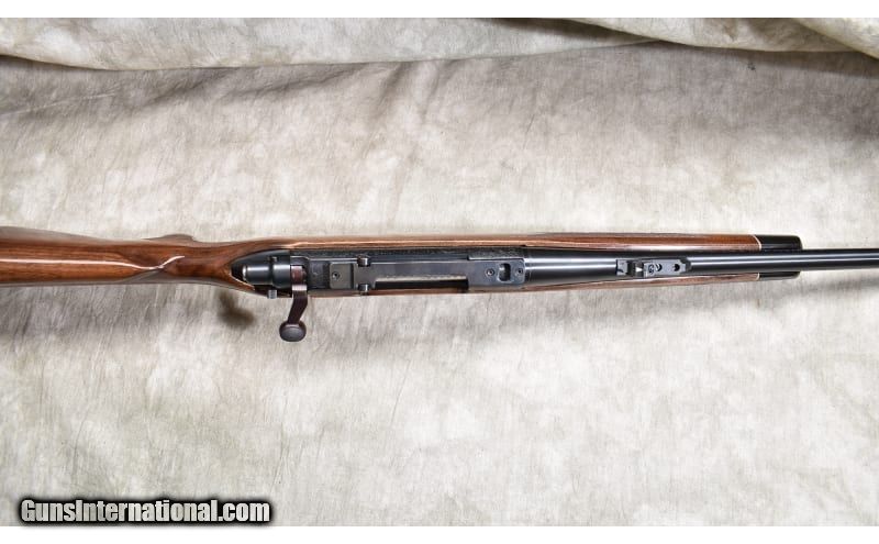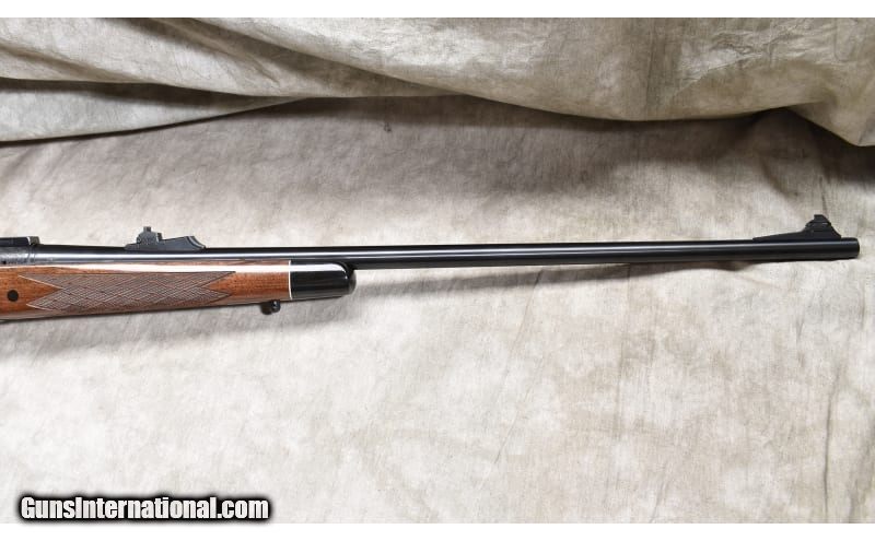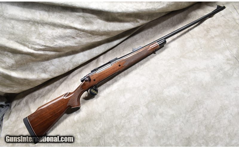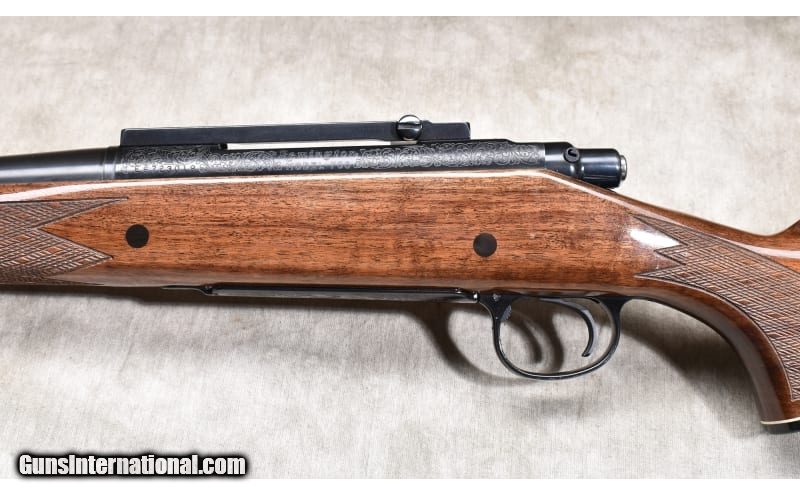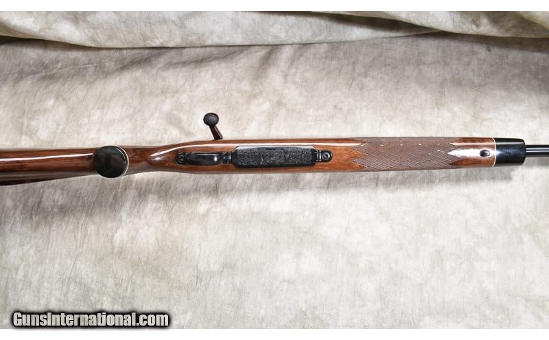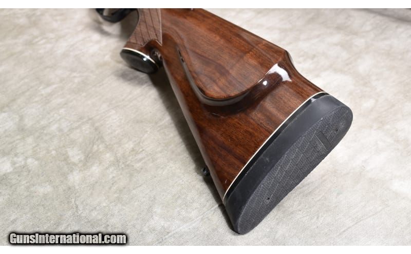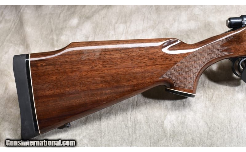 Description: Jeweled bolt, skip-line checkering, engrave floor plate and receiver, and Monte Carlo walnut stock with tip/grip make this an exceptional rifle. Chambered in .375 Rem Ultra Mag it is definitely in the dangerous game class. .375 Magnum SOLD Chambers: 3 Metal Condition: Excellent. Wood Condition: Excellent. Bore Condition: Shiny and bright with good rifling. Barrels: 26-inch Triggers: Factory grooved trigger. Stock Dimensions: 13-1/4 inch LOP. Fore End: Checkered with black tip cap. Butt Pad: Soft and thick rubber pad. Weight: 7 lb - 13 oz Sights: Bead and ramp type open sights. Leupold one-piece base for scope. Item Location: Rogers |