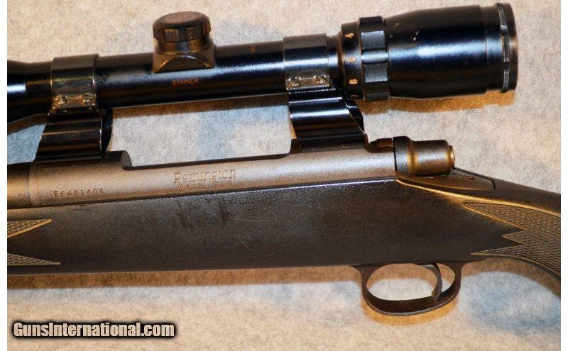 Description: A Remington Model 700 rifle in .270 Win caliber with an attached Bushnell 3-9 X 40 scope with see through rings and an attached sling. Metal is all in very good condition, synthetic stock has some scratches from use. Rifle is hunt ready. SOLD Caliber Info: .270 Winchester. Chambers: Bolt action. Metal Condition: Very good. Bore Condition: Very good. Barrels: 22" blued barrel. Triggers: Single with 2 position safety. Stock: One piece synthetic stock and forend. Stock Dimensions: 13 1/2" LOP. Fore End: Synthetic with sling attach posts. Butt Pad: Original rubber butt pad. Weight: 8 Lbs. 5 Oz. Sights: Has original iron sights, blade front and adjustable rear as well as a Bushnell 3-9 X 40 Banner scope with see through rings. Extras: Comes with a Bushnell 3-9 X 40 Banner wide angle scope with see through rings and attached sling. Item Location: Lexington, KY |