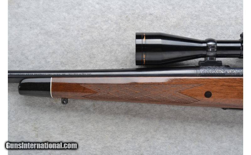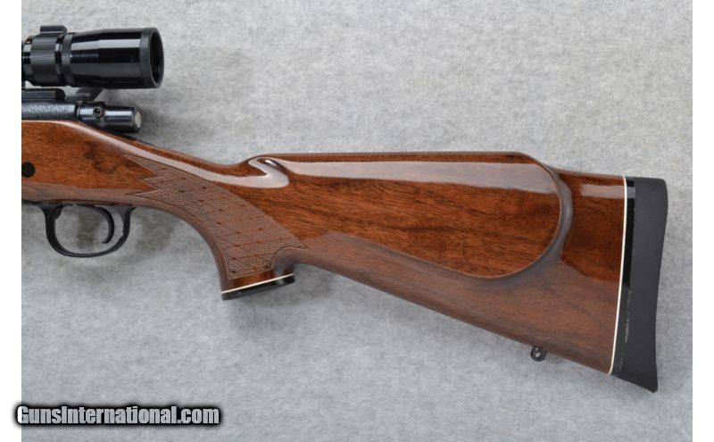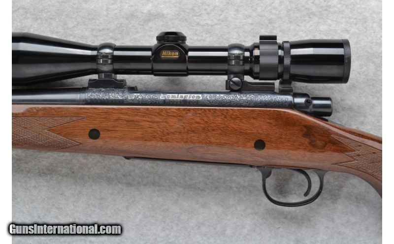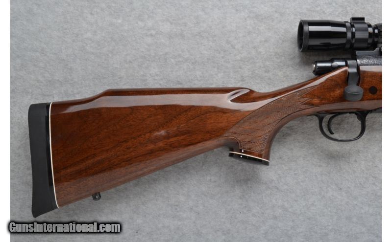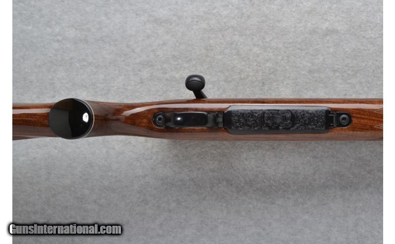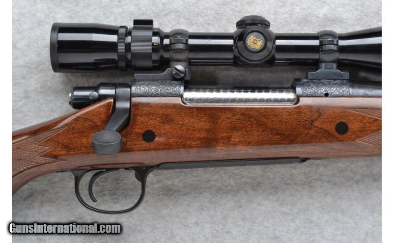 Description: Engraved receiver top. Engraved floorplate also has a rams head. SOLD Caliber Info: .300 Rem. Ultra Mag. Chambers: Hinged floorplate. Metal Condition: Excellent. Wood Condition: Excellent with a couple of minor handling marks. Bore Condition: Excellent. Barrels: 26 inches. Stock: Checkered walnut pistol grip with a raised cheekpiece and black cap. Stock Dimensions: LOP 13 1/4 inches. Fore End: Checkered walnut with a black tip. Butt Pad: Remington rubber recoil pad. Weight: 8 lbs. 9 oz. with the scope mounted. Sights: Nikon Monarch UCC 3-9x40 Scope. Item Location: Richfield, WI |