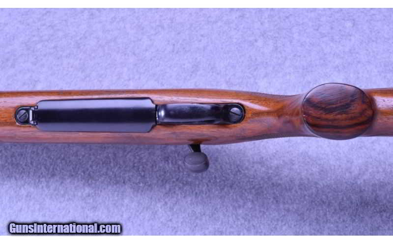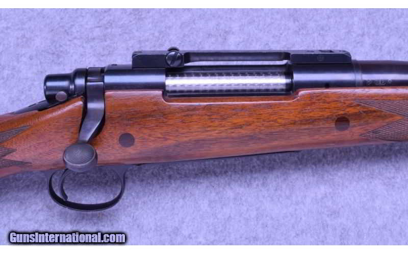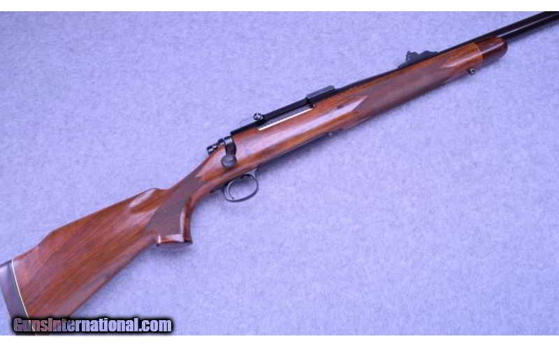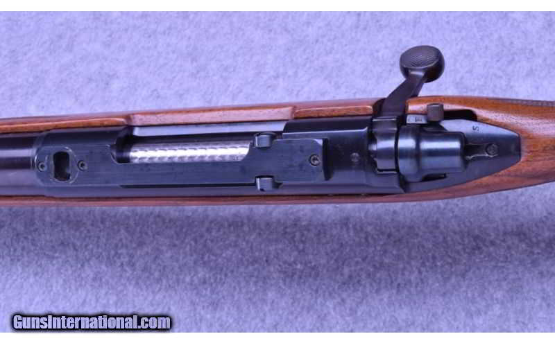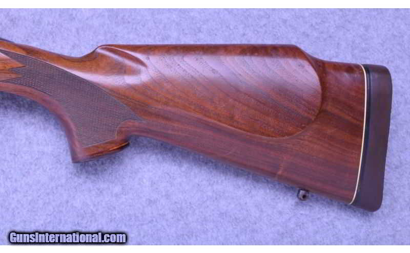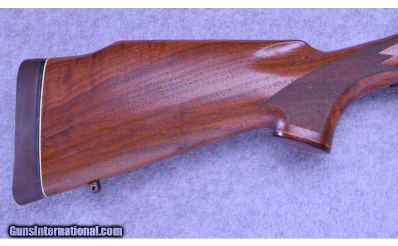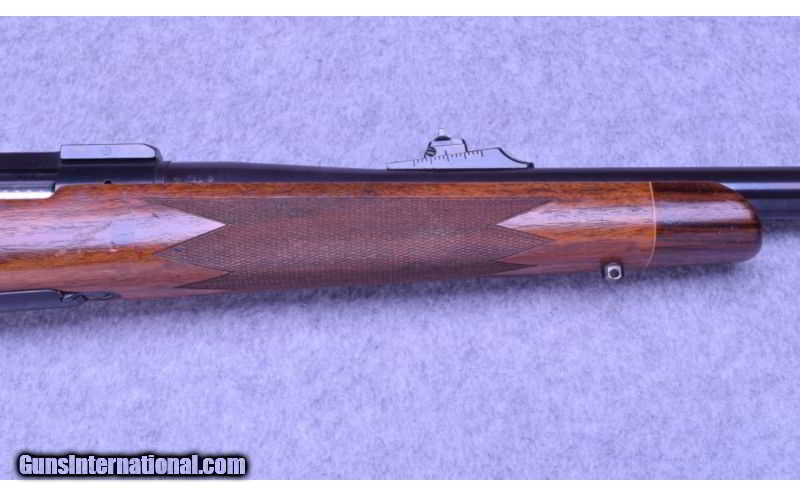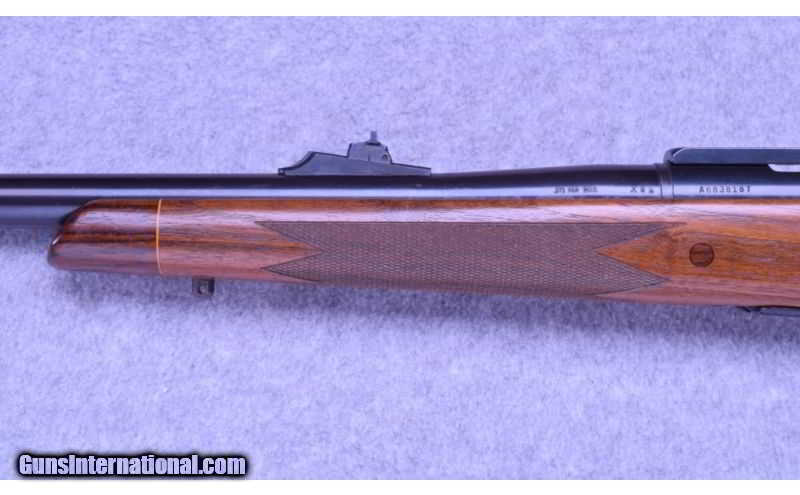 Description: Shows hunting wear with a bit of light old freckling to the barrel blue. Bore remains excellent. Complete with scope base. No box. SOLD Manufacturer: S/N A683XXXX Caliber Info: .375 H&H Magnum Metal Condition: Good Wood Condition: Good Bore Condition: Excellent Barrels: 24 Triggers: Factory Stock: Checkered Walnut Pistol Grip with Rosewood Cap Stock Dimensions: 13 3/8" LOP Fore End: Checkered Walnut with Rosewood Cap Butt Pad: Brown Rubber Weight: 9 LB Sights: Bead Front - Adjustable Notch Rear - Scope Base Included Item Location: Wheeling, WV |