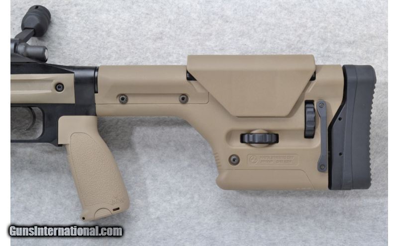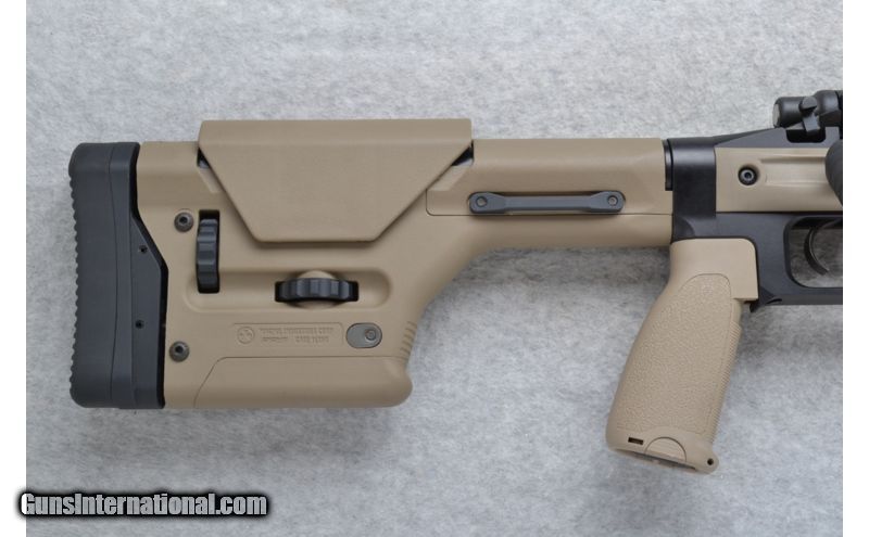Description: SOLD Caliber Info: .308 Win. Chambers: Detachable Magazine. Metal Condition: Excellent. A couple minor handling marks. Bore Condition: Excellent. Barrels: 22 inch heavy matte black with muzzle break. Tactical rifling 1 in 10". Triggers: Grooved. Timmey trigger. Stock: BCM textured grip tan polymer full pistol grip with a hinged door on the bottom. Magpul fixed tan polymer buttstock with an adjustable comb and recoil pad. Oversized bolt handle. Stock Dimensions: LOP is adjustable but measures 13 3/8 inches when recoil pad is adjusted closed. Fore End: Tan polymer with a drilled and tapped seven position bottom. Butt Pad: Horizontal grooved black rubber recoil pad. Weight: 10 lbs. 0 oz. Sights: Receiver top Picatinny rail. No iron sights. Item Location: Richfield, WI |
