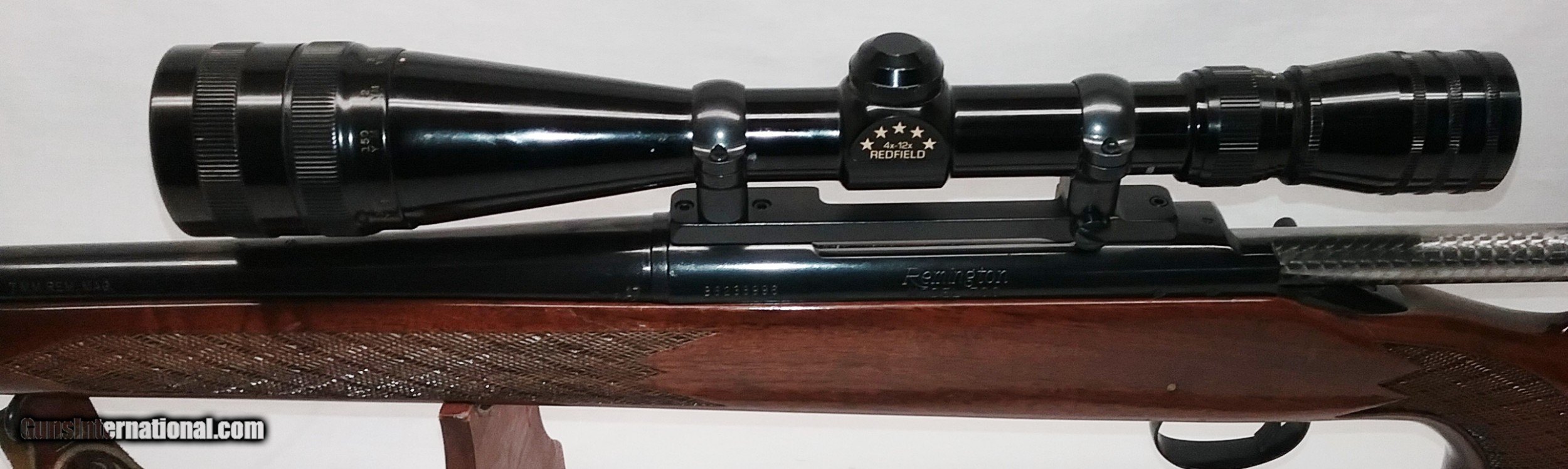 Description: C241 Remington Model 700 ADL 7mm Magnum. - Stk #C241 This Remington Model 700 ADL 7mm magnum bolt action rifle has a 24 inch blued tapered 1-1/8” to 5/8” barrel mounted with a Redfield 4X12 scope. The bore is in excellent condition along with the jeweled bolt. The Walnut stock with checkered wrist and forend are in very good condition with the exception of very minor dents and dings. The stock has a black Remington rubber recoil pad. This rifle is equipped with sling swivel and a leather sling. The length of pull is 13-3/4”, overall length is 44-1/2”, weight is 9.0 lbs. Our stock number is C241. Will ship to any FFL in the United States, buyer pays freight and insurance. SOLD Rifle Caliber: 7mm Remington Magnum Manufacturer: Remington Model: 700 Bore: Rifled Chambers: 1 Ejectors: Yes Condition: Very Good Metal Condition: Very Good Wood Condition: Very Good Bore Condition: Very Good Barrels: One Barrel Type: Tapered Round Action: Bolt Action Triggers: 1 Stock: Walnut Butt Pad: Rubber LOP: 13-3/4 in Weight: 9.0 lbs Sights: Scope Item Location: OR - Oregon |