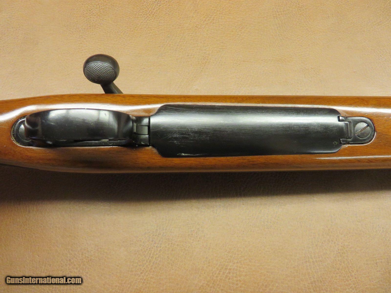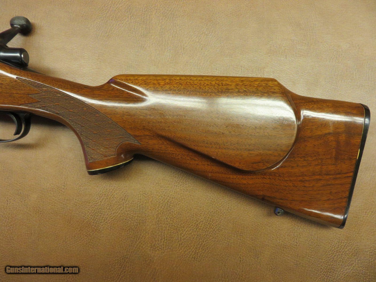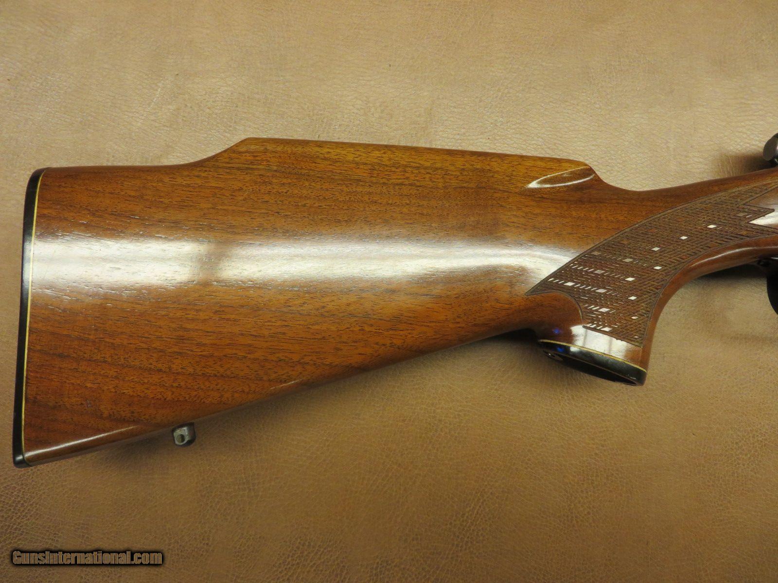 Description: 25-06 Remington with 24 inch heavy barrel. Serial number A6597xxx. High gloss checkered walnut stock has black forend tip and pistol grip cap, sling swivel studs, and original butt plate. All in 95% condition. SOLD |