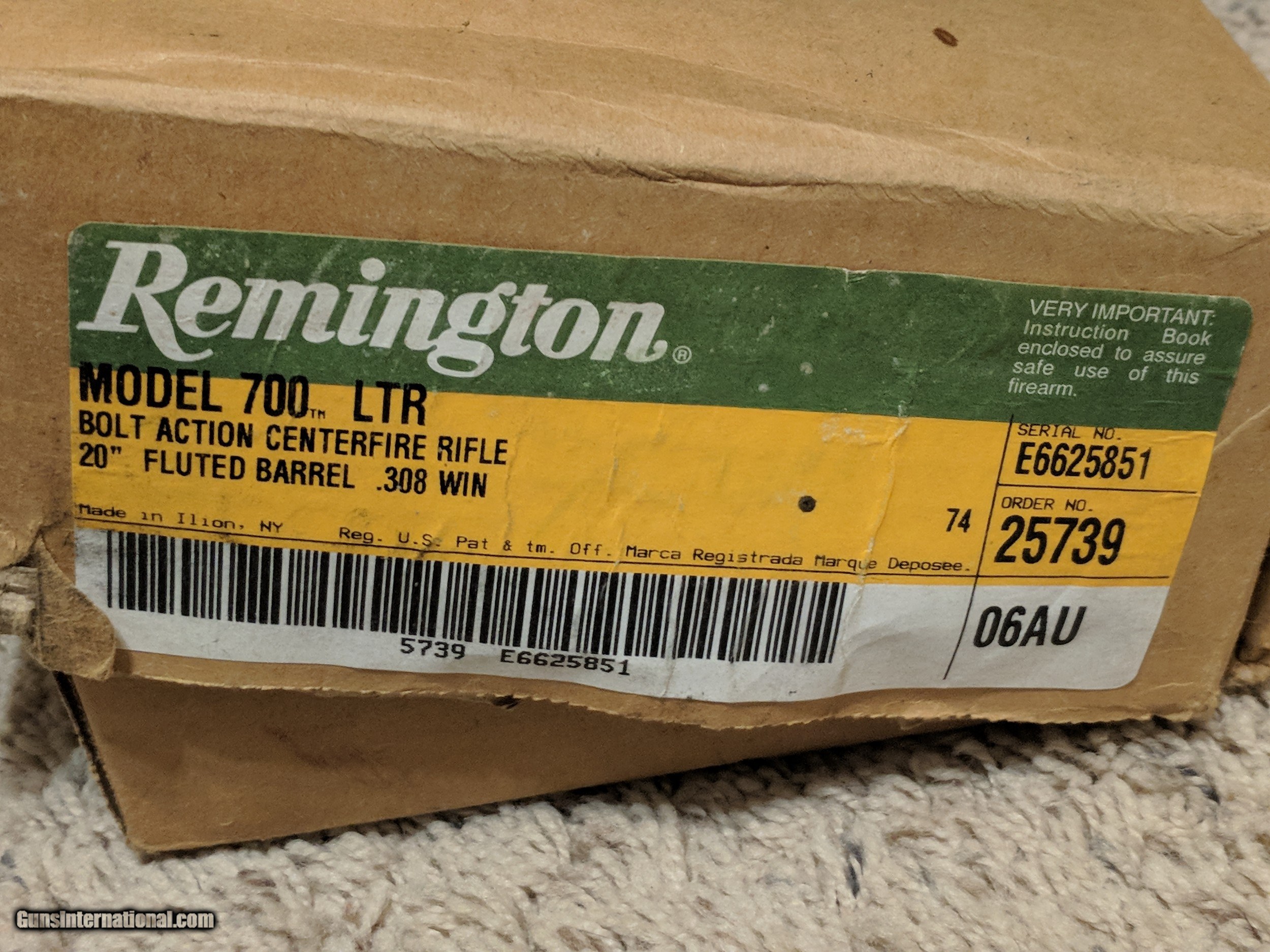 Description: Remington Model 700 LTR (light tactical rifle) .308 win order #25739, 20" fluted barrel, New in box SOLD Rifle Caliber: .308 Winchester Manufacturer: Remington Model: 700 Serial Number: E6625851 Condition: New |