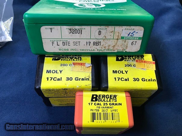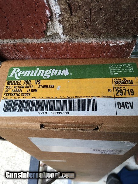 Offered for sale is one Remington Model 700 VS, .17 Remington with a 26" factory stainless barrel and a factory synthetic stock in the factory box with all paperwork. This is a scarce caliber in the Model 700 VS line and was produced in the 2002 time period. Estimates for production of this model were between 250-300 guns. The gun was purchased new by myself at that time and is in 99+ condition. Gun has never been hunted and is in mint condition. What is included in this offering are the following: RCBS Full Length 2 die set, unfired Remington brass-290 count, fired Remington brass-49 count, Berger 25gr 200 count box factory sealed, Berger 30gr 200 count box factory sealed, Berger 30gr 129 remaining in the factory opened 200 count box,(gun fired exactly 71 shots), Warne bases and quick detach 1" low rings. For sale only to lower 48 states USA. Certified Bank money order or USPS postal money order only. Gun will be shipped thru a local Houston gun dealer that I use since I do not have an FFL once payment is received. Gun will be shipped insured for the purchase amount. I am not responsible for the handling or use of the firearm in any way by the purchaser.