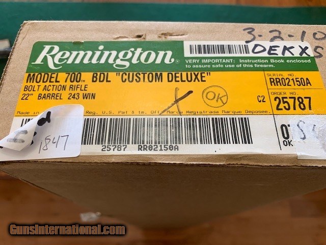 SOLD—-REMINGTON 700 BDL CUSTOM DELUXE 243 CAL., 22” BARREL, NEW UNFIRED IN THE BOX WITH OWNERS MANUAL ETC.
