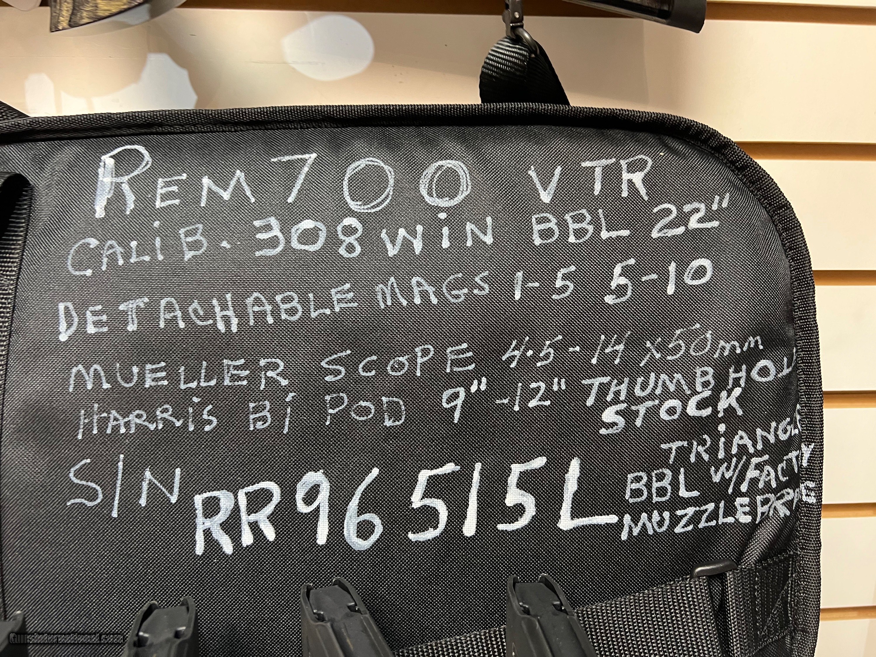 Description: Used Remington 700VTR 308 22" bbl scope muzzle break, bi-pod 6 mags spare trigger group very good condition Buyer pays shipping Millers Gun Center Located in New Castle, Delaware "Home of TAX-Free shopping" No Credit Card Fees Send Gun international inquiry and then call 302-328-9747 to complete your purchase SOLD Serial Number: RR96515L |