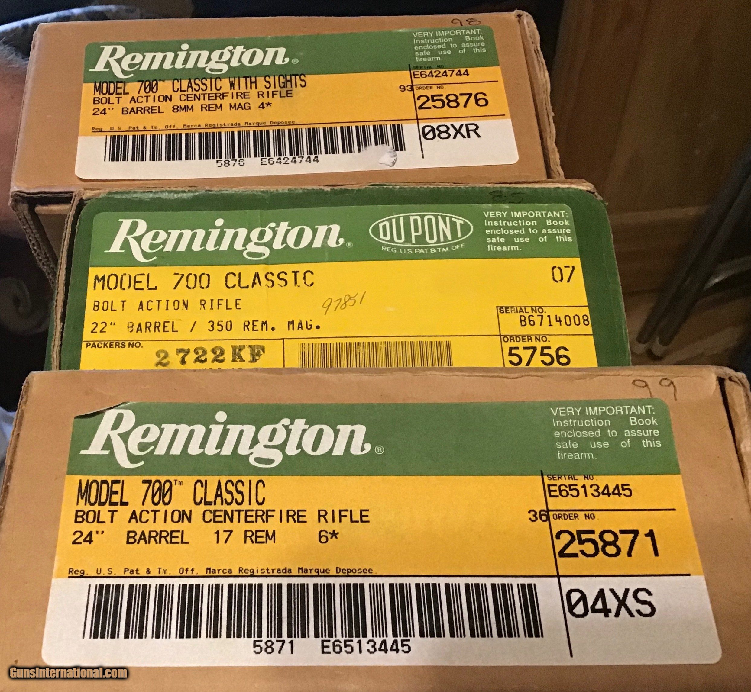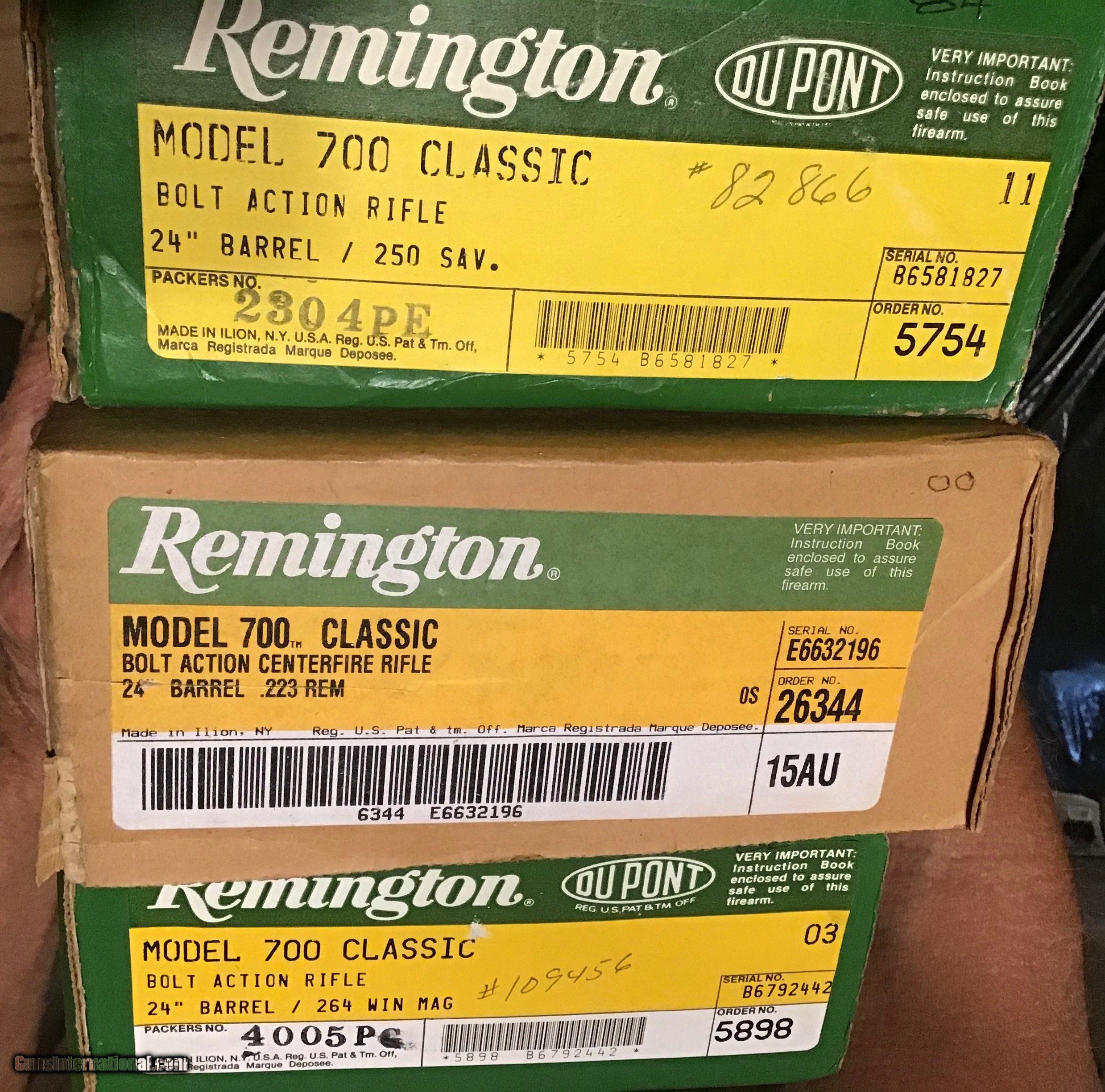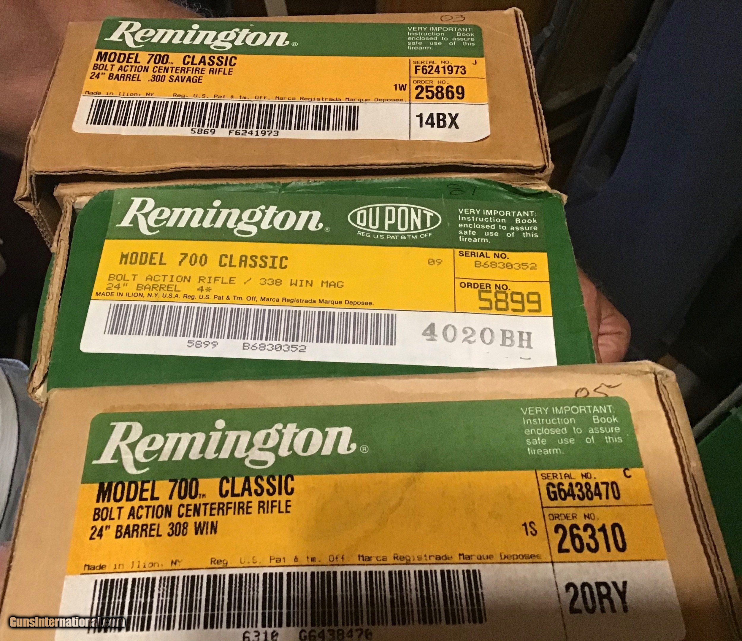 WE JUST ACQUIRED AN ENTIRE SET OF 25, EVERY CALIBER REMINGTON 700 CLASSIC RIFLES MADE FROM 1981TO 2001, GUNS HAVE NEVER BEEN ASSEMBELLED ARE ALL NIB.
