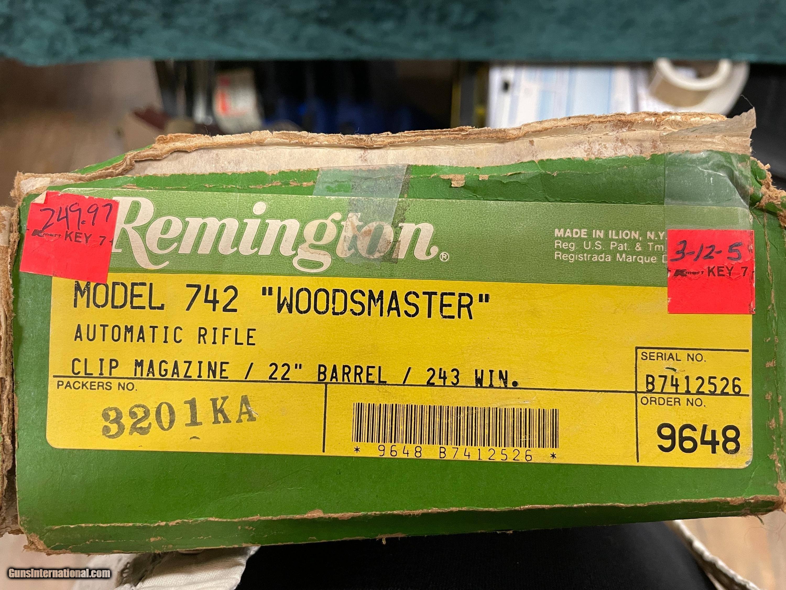 Description: Remington 742 Woodmaster .243 cal rifle 22" bbl LNIB #9648 Like New in Box--OLD STOCK!! Here is what we call a "Safe Queen", a Like New in Box, appears to be unfired. Remington Model 742 Woodmaster semi-auto .243 cal rifle. Comes with original box and paperwork. Hard to find in this condition. Great additional to anyone collection. Please see pictures. Box does show wear from being stored.
