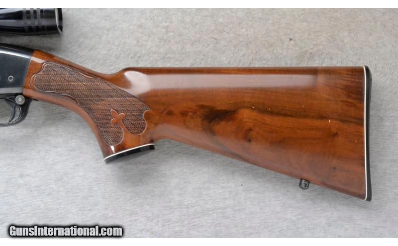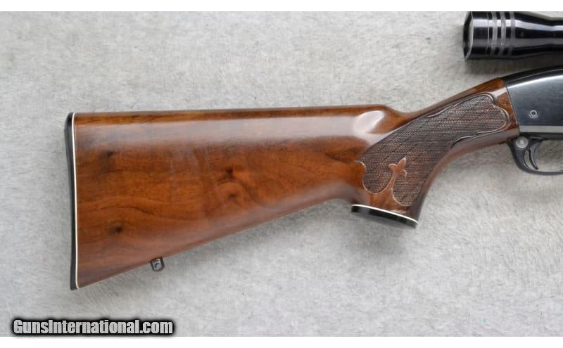 Description: This Remington Model 742 Woodsmaster is a right hand semi-auto rifle in 6mm Rem. Cal. It has a 22 inch barrel. A raised blade front sight and an adjustable notch middle sight. It is outfitted with a Redfield 4X Scope. The butt stock is a checkered grip walnut pistol grip with a black cap. The forearm is a checkered grip walnut. 6mm Remington SOLD Chambers: Detachable Magazine. Metal Condition: Very Good. A few minor handling marks. Wood Condition: Very Good. Some minor handling/use marks. Bore Condition: Excellent. Barrels: 22 inch barrel. Stock Dimensions: LOP 13 1/4 inches. Fore End: Checkered grip walnut. Butt Pad: Remington checkered black plate. Weight: 8 lb. 8 Oz. Sights: Raised blade front. Adjustable notch middle. Redfield 4X Scope. Item Location: Richfield, WI |
