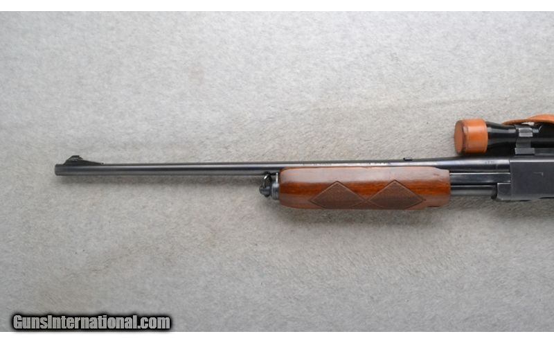 Description: This Remington Model 760 Gamemaster is a right hand pump action repeating rifle in .270 Win. Cal. It has a 22 inch barrel. A blade front sight and a 4x scope. The butt stock is a checkered grip walnut pistol grip with a black cap. The forearm is a checkered grip walnut. .270 Winchester SOLD Chambers: Detachable magazine. Metal Condition: Good. Some light handling marks. Minor blue wear. Wood Condition: Good. Light handling/use marks. Bore Condition: Excellent. Barrels: 22 inch. Stock Dimensions: LOP 13 7/8 inches. Fore End: Checkered grip walnut. Butt Pad: Red rubber recoil pad. Weight: 8 lb. 2 oz. Sights: Raised blade front. Kollmorgen 4X Scope. Item Location: Richfield, WI |