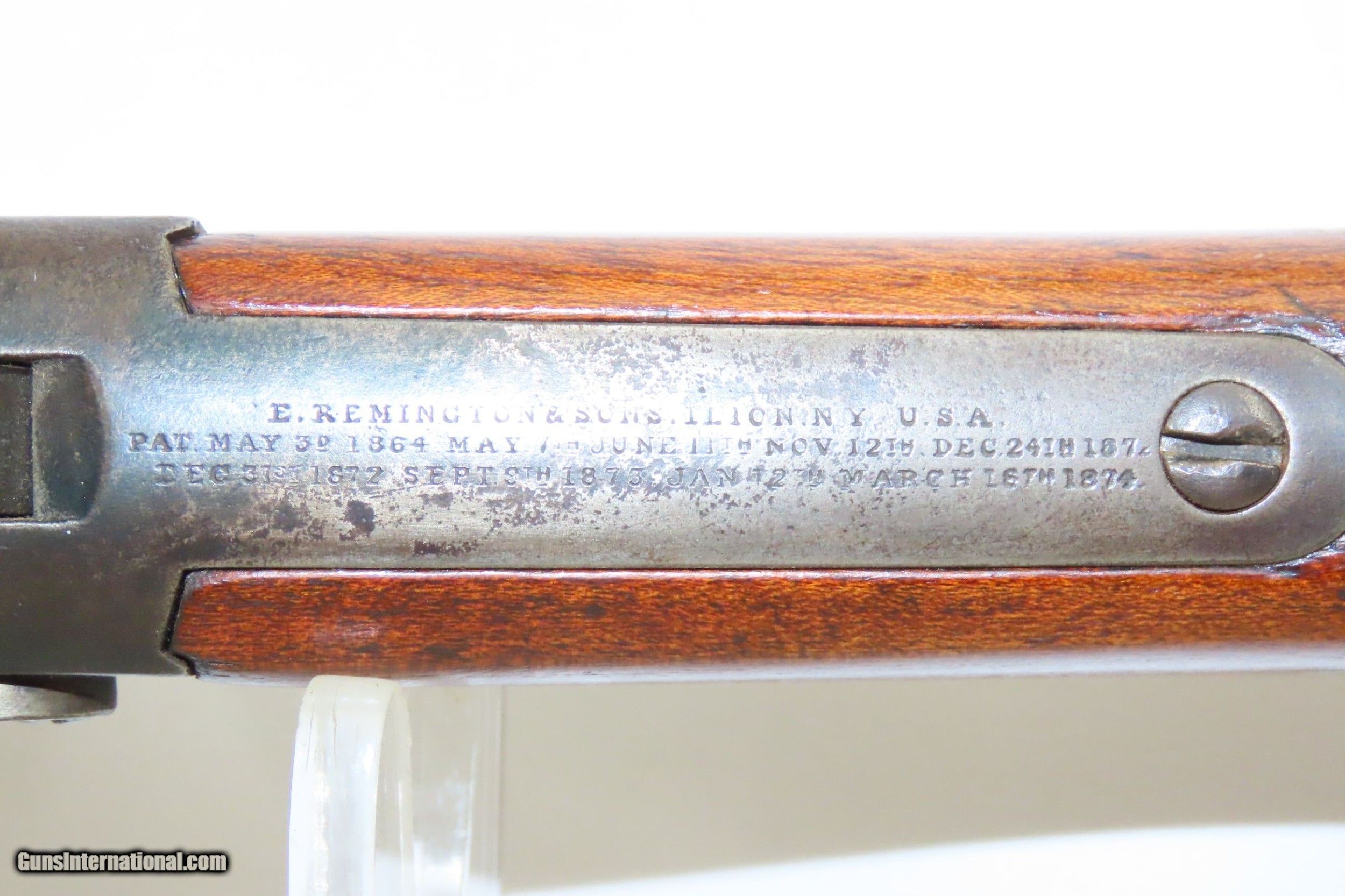 Description: c1870s mfr. Antique.43 Spanish REMINGTON ROLLING BLOCK Saddle Ring CARBINE Prolific Single Shot Military Longarm Here we present an antique E. Remington & Sons Rolling Block Rifle, made circa the 1870s in Ilion, New York. Manufactured from 1866 to 1888, the Remington rolling-block cartridge rifle was so popular that more than half the world’s armies adopted it or purchased quantities for police or martial purposes. During the American Civil War, gunsmith Leonard M. Geiger designed the basic action, in which the shooter “rolled” the breechblock backward with the thumb and inserted a cartridge in the breech, before the block “rolled” forward, and the interlocking hammer cocked in one fluid motion. E. Remington & Sons, America’s oldest firearms manufacturer, took over Geiger’s patent and assigned one of its chief engineers, Joseph Rider, to make the necessary refinements. Rider brought the new action along, and with his 1864 and 1865 patents, put it in its nearly perfect final form. The action on the Rolling Block was extremely strong and could easily withstand the increased pressure of the new smokeless powders coming into use by the late 1880s. The Remington Rolling Block had a sturdy, simple action that was relatively inexpensive, just what many governments wanted in the latter half of the 19th Century. They were popular with civilians as well. Along with the Sharps rifle it was one of two rifles probably used more than any other by the buffalo hunters who hunted the American bison herds in the 1870s and 1880s. Civilian Remington rolling block rifles, and later surplus military rifles, became very popular among hunters in Scandinavia, particularly for moose hunting, with ammunition for the rifles being commonly available on the civilian market into the 1920s-1930s. The overall condition is good. Excellent action. Nice bore with strong rifling. The stock has been refinished and contains an average amount of wear. Own the original! This is a legitimate antique and not a reproduction. Barrel is 20-1/2 inches. Caliber: .43 Spanish Overall condition as seen in photos. Very Fast. Very Safe. FREE SHIPPING WORLDWIDE. Delivered directly to your door by express mail! Guaranteed AUTHENTIC & Includes CERTIFICATE OF AUTHENTICITY. ancestryguns $1450 #217385 SOLD Antique: Yes |