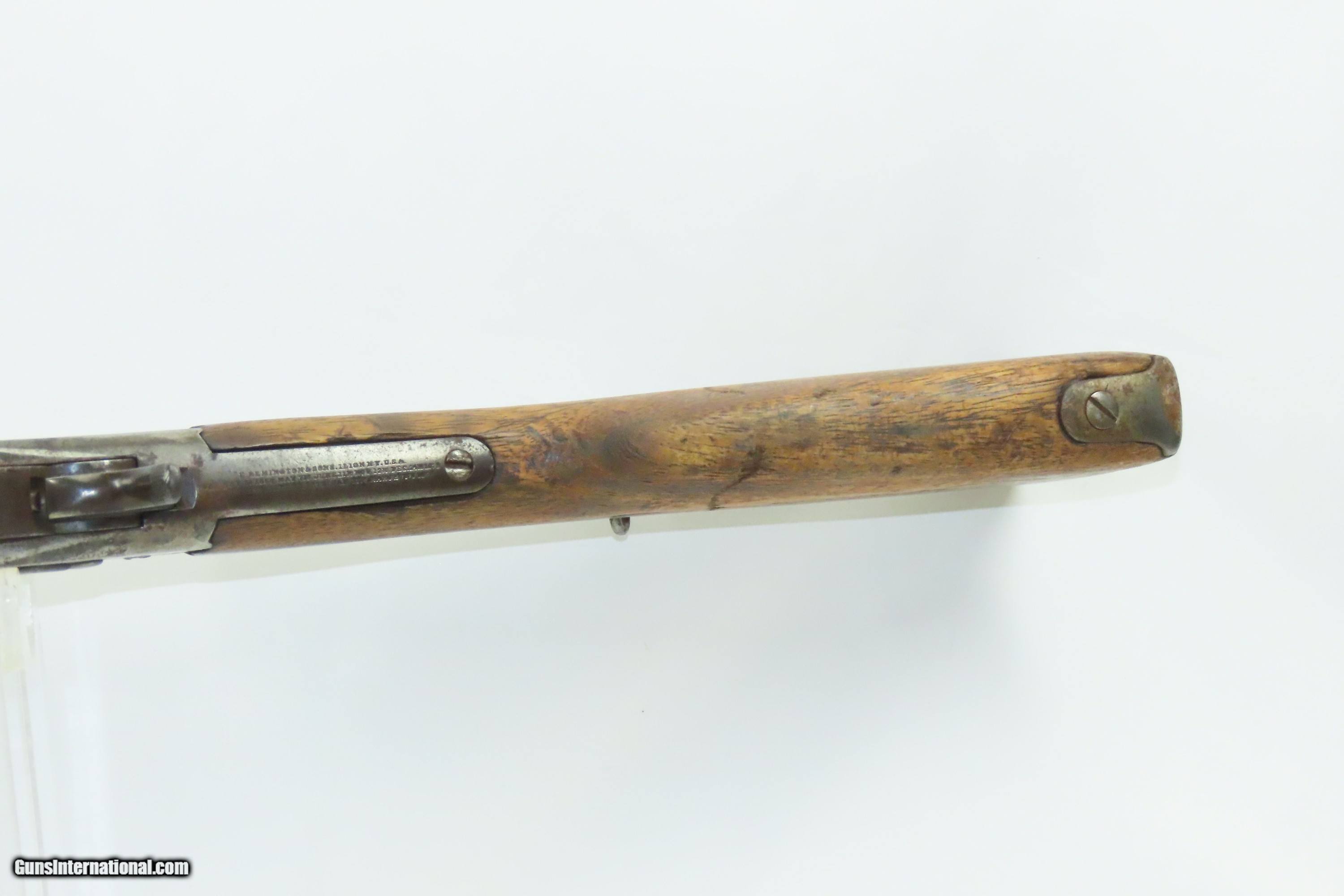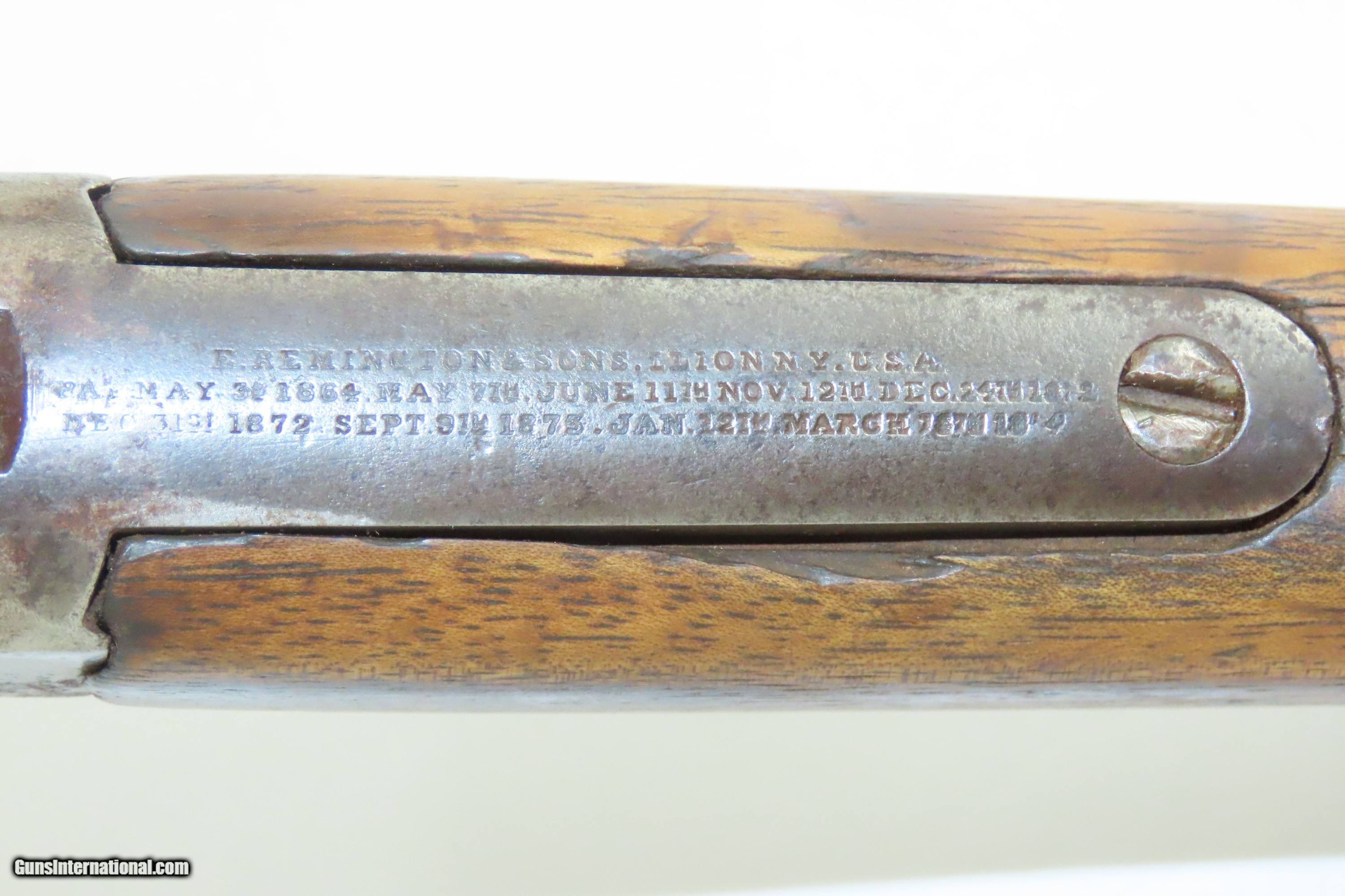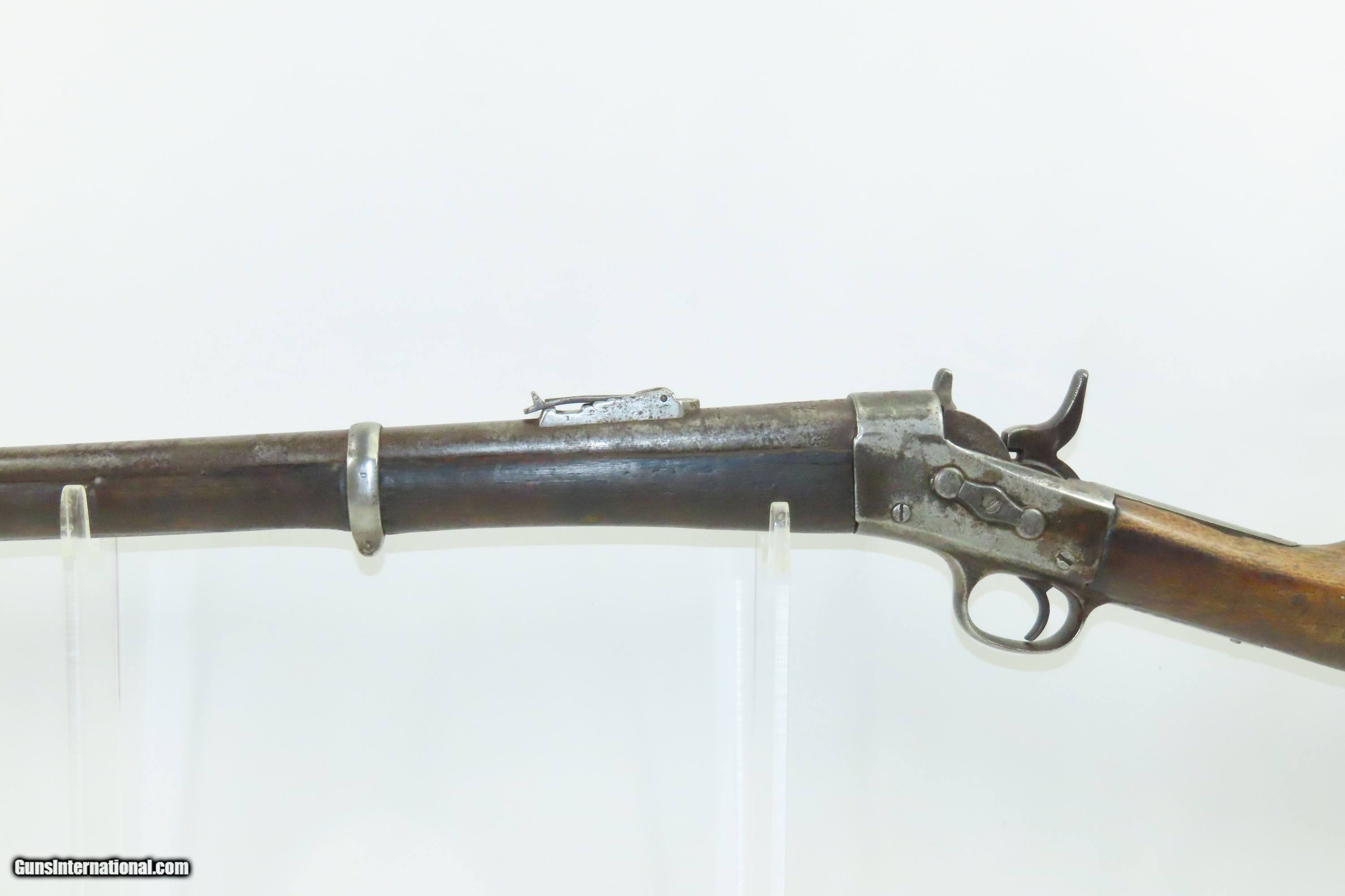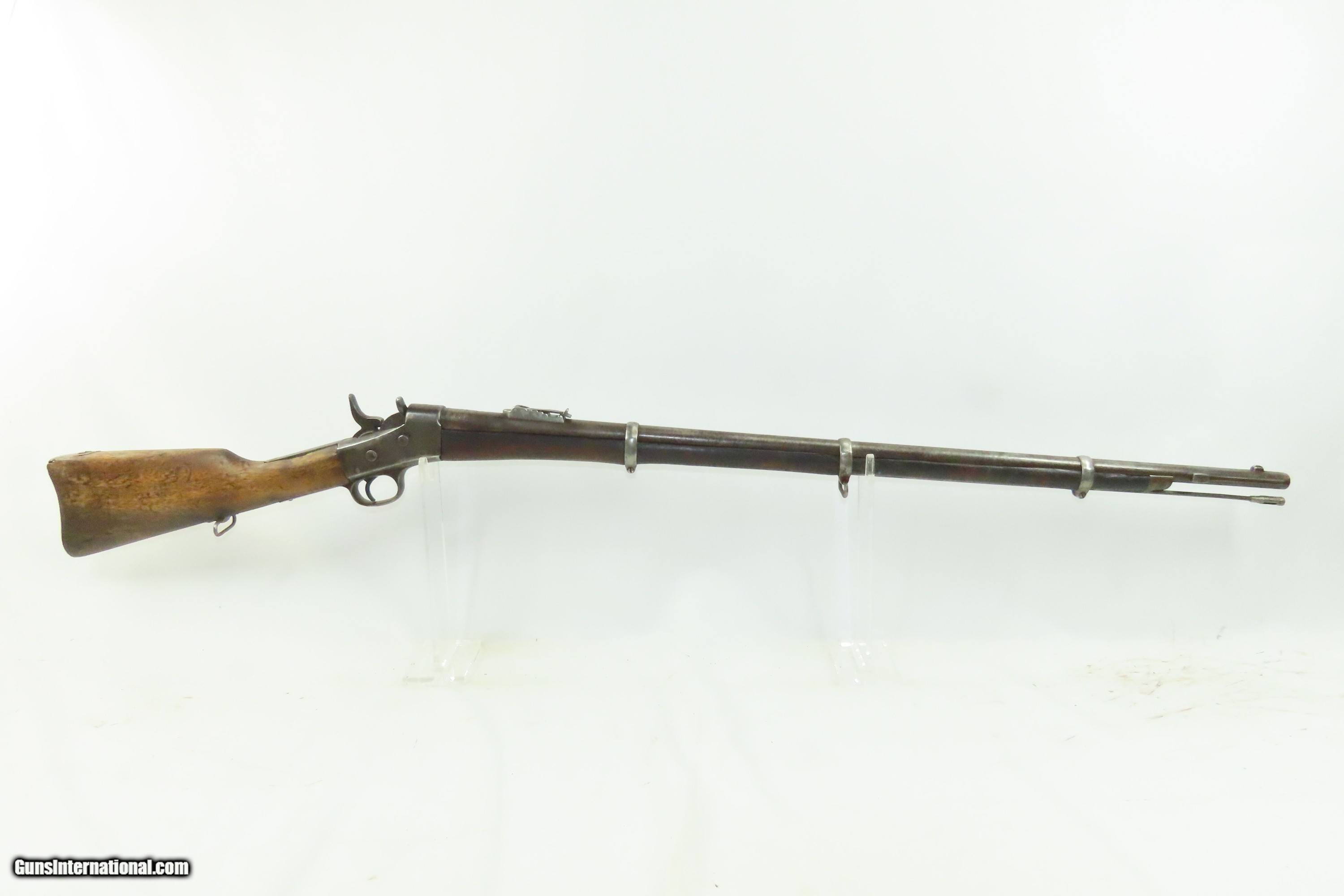 Description: EGYPTIAN Marked Antique REMINGTON Rolling Block M1868 No. 1 MILITARY Rifle Nice 19th Century Military Firearm Here we present an antique Egyptian Marked Remington Rolling Block Model 1868 No. 1 Military Rifle, made circa the early to mid to late-1870s in Ilion, New York. The Remington Rolling Block had a sturdy, simple action that was relatively inexpensive, just what many governments wanted in the latter half of the 19th Century. They were popular with civilians as well. In 1868 a large order was placed with Remington by the Egyptian Government for the No. 1 Remington Military Rifle to be chambered in the ".43 Egyptian" cartridge. Governments at that time considering it a matter of national prestige to field arms with proprietary cartridges. Before the order could be delivered, Egypt (having close ties with the French since the Napoleonic excursions and the building of the Suez canal), "defaulted" so that a large part of the order could be sold to France as she was greatly underarmed during the Franco-Prussian War of 1870-71. It is estimated that some 13,000 such rifles were delivered to France at that time. However, the original order was again placed and by 1876 the last of some 60,000 rifles were delivered. Most Egyptian Remingtons that one is likely to come across (except for French marked specimens) show very substantial wear, especially rounded edges throughout, most noticable at the muzzle, bayonet lug and buttplates, which often have holes in them or are missing altogether. The rifle is marked with multiple Egyptian markings and is marked with what looks to be Egyptian unit markings. The upper tang bears the Remington patent markings, which are often worn completely off. The overall condition is good. Dark patina throughout. Shows heavy use. The action is functional. The bore is dim with good rifling. The stock shows numerous handling marks and minor chips and splits. Own the original! This is a legitimate antique and not a reproduction. Barrel is 35-1/8 inches. Caliber: .45 Centerfire Overall condition as seen in photos. Very Fast. Very Safe. FREE SHIPPING WORLDWIDE. Delivered directly to your door by express mail! Guaranteed AUTHENTIC & Includes CERTIFICATE OF AUTHENTICITY. ancestryguns $1200 #240369 SOLD Antique: Yes |