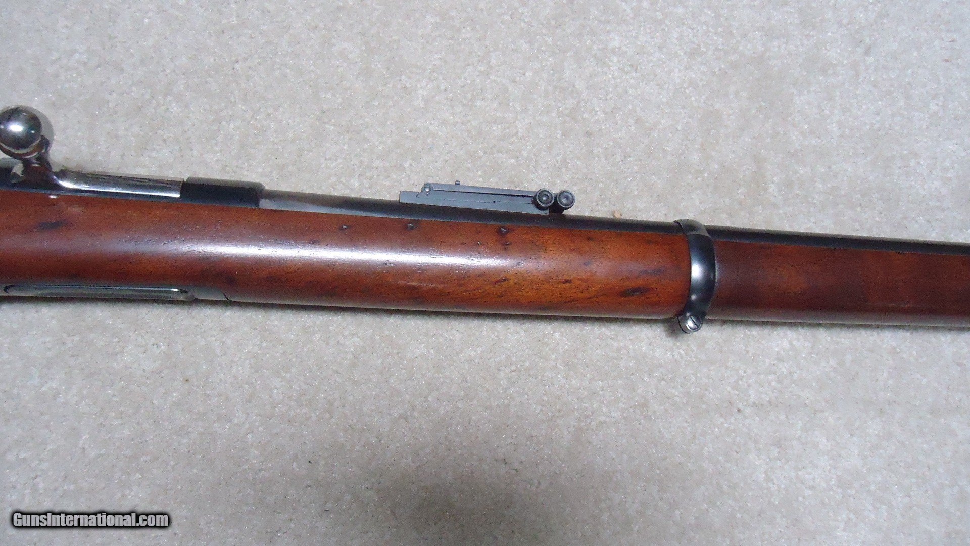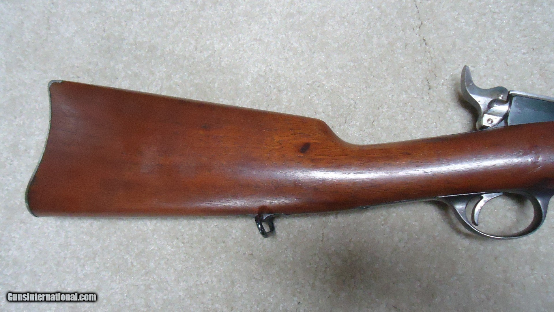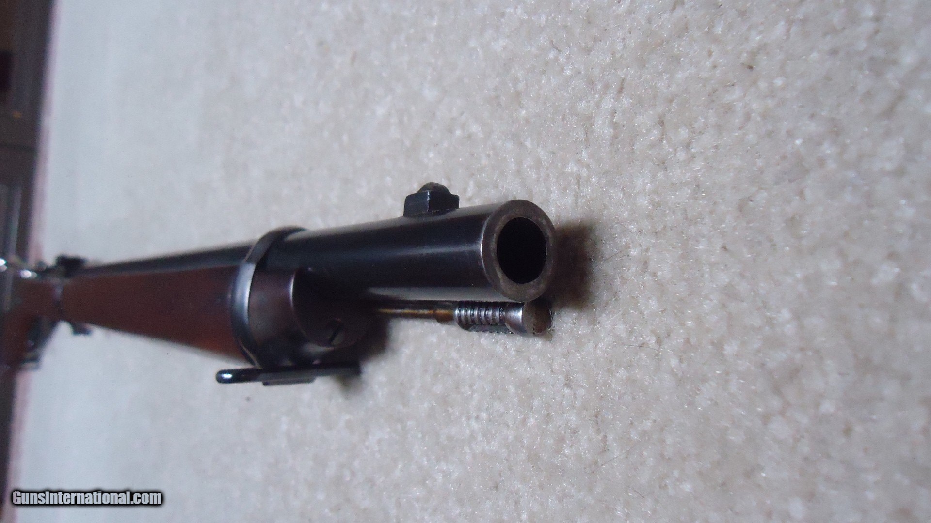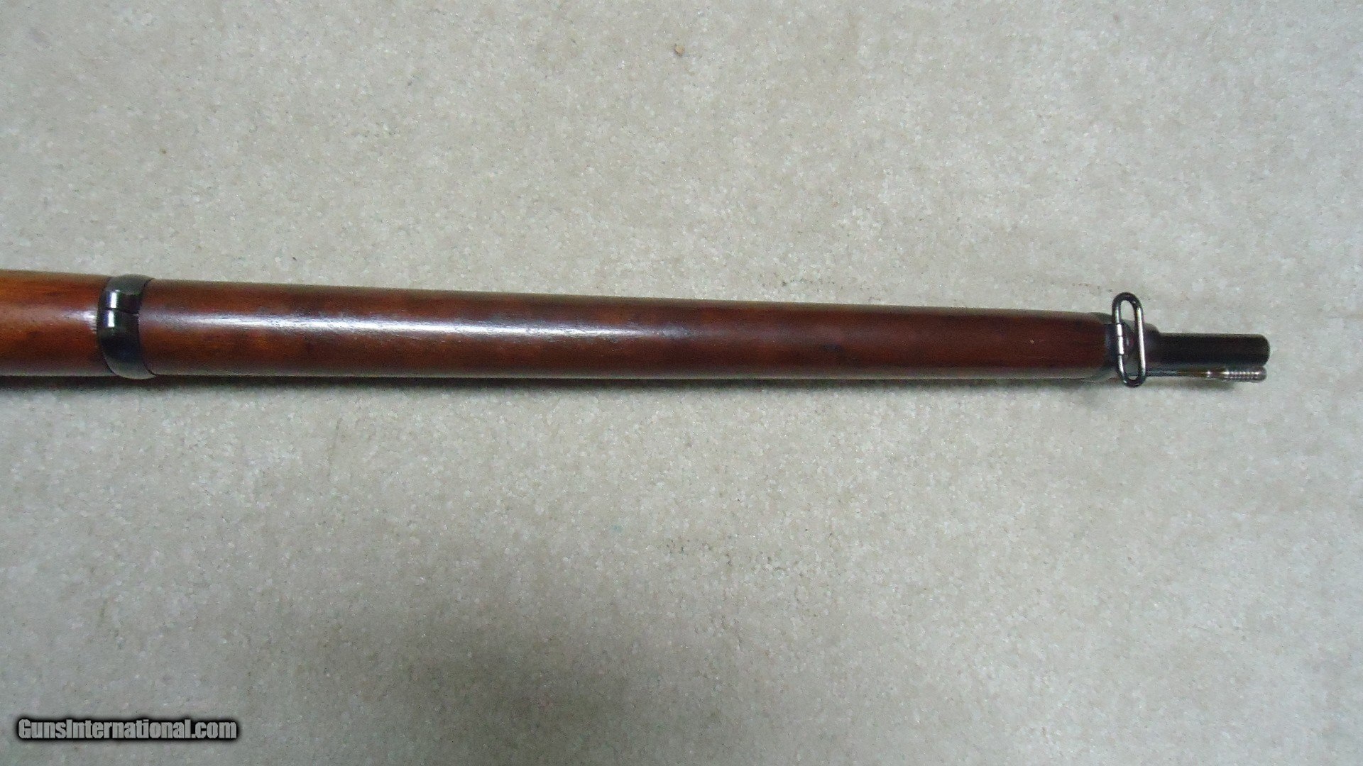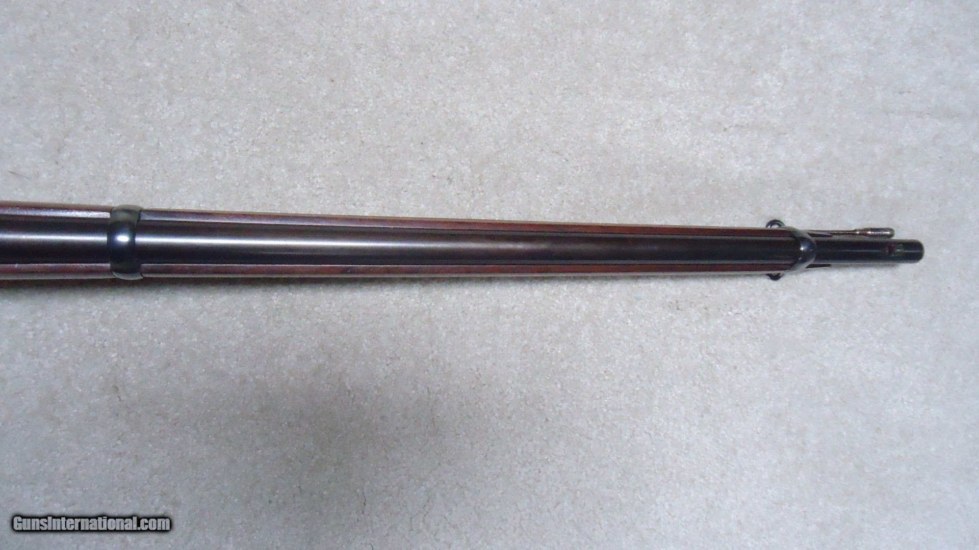 Description: EXCEEDINGLY RARE, ALMOST NEVER SEEN REMINGTON .45-70 BOLT ACTION KEENE CIVILIAN U.S. NAVY MODEL FULL STOCK MUSKET. Only a small handful of these were made aside from the 250 specially made for the Navy in 1880 which have anchor and naval inspection marks etc. This example appears partially restored. The barrel appears to have good original blue with some wear and scuffing. The barrel is fitted with a Buffington rear sight and normal musket front sight. The bolt and marked portion on top of the receiver are correctly bright with sharp markings/patent dates etc. The small 45-70 caliber stamping on the left side of the receiver is clear. It seems the receiver, barrel bands and trigger guard have been reblued, but not buffed. The stock does not appear to have been refinished or sanded and all wood to metal fit is excellent. I believe if one could easily "age" the blue on the parts mentioned and any refinish work would about disappear. Action is tight with cartridge lifter spring only weak, and the bore is bright and excellent with only one or two minor surface spots. There is still some nice case color on the hammer. Unusual side-mounted cleaning rod is intact. One of the absolute rarest Remington long arms. A little careful de-restoration work would go a long way on this one. SOLD Antique: Yes Rifle Caliber: .45-70 Government Manufacturer: REMINGTON Model: KEENE CIVILIAN USN Barrel Length: CORRECT 29 1/4 Condition: EXCELLENT |