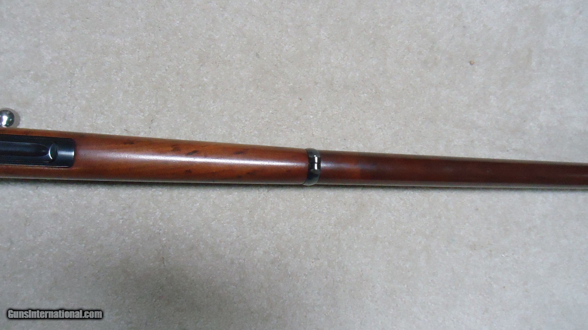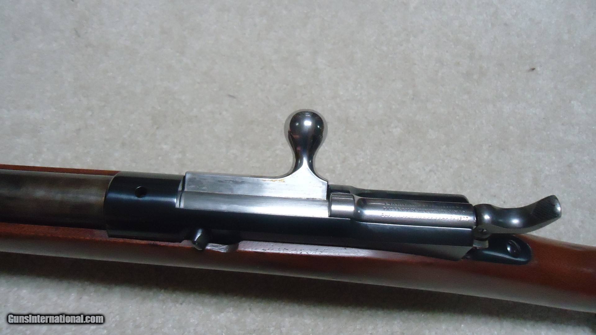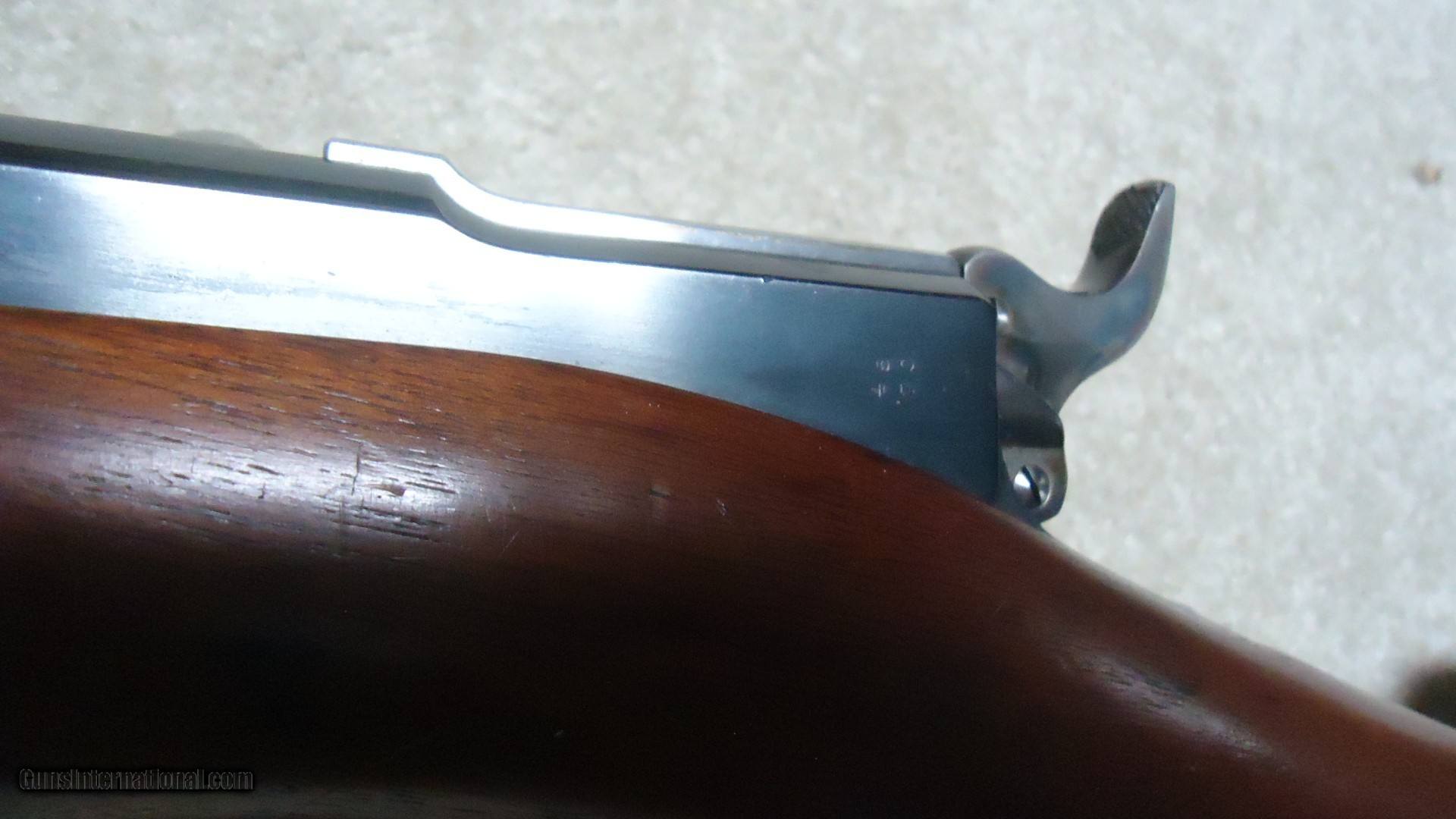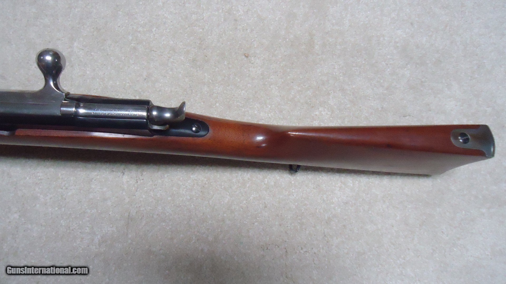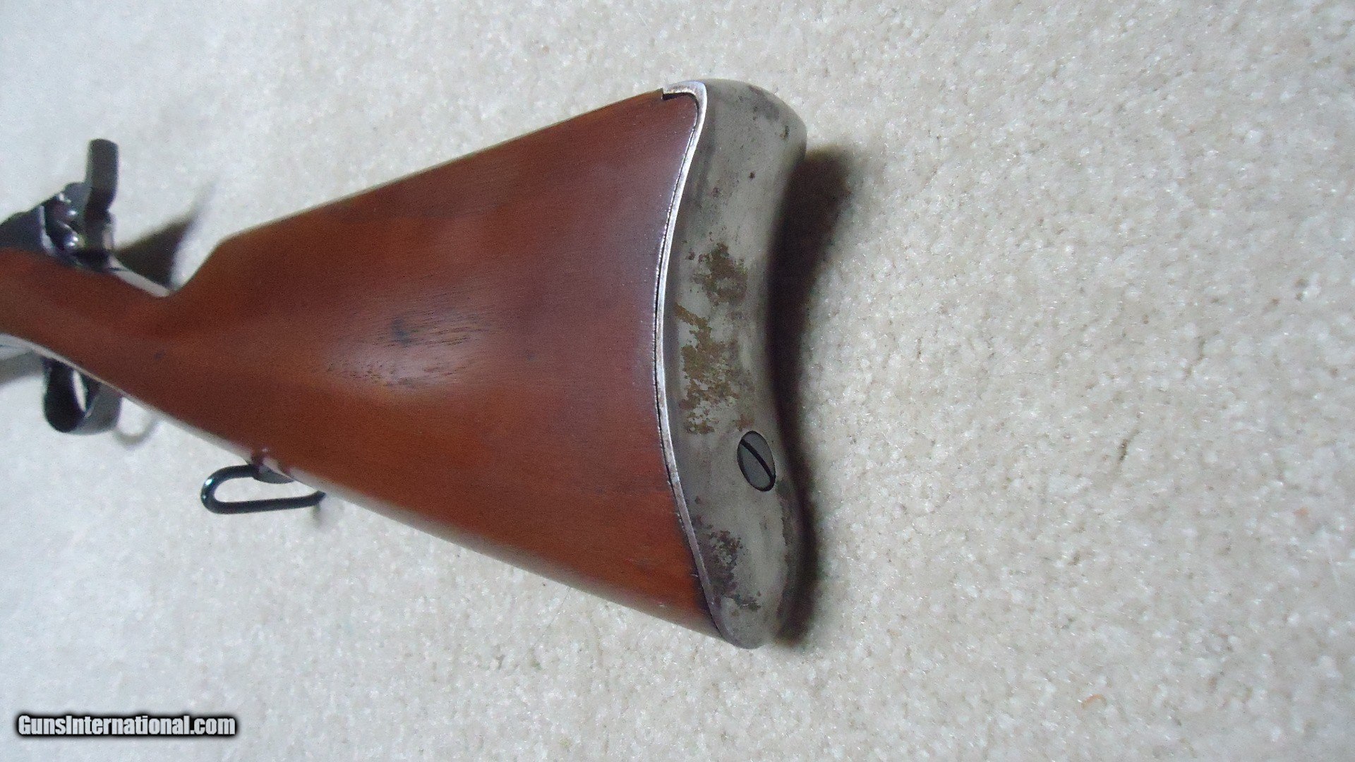 Description: EXCEEDINGLY RARE, ALMOST NEVER SEEN REMINGTON .45-70 BOLT ACTION KEENE CIVILIAN U.S. NAVY MODEL FULL STOCK MUSKET. Only a small handful of these were made aside from the 250 specially made for the Navy in 1880 which have anchor and naval inspection marks etc. This example appears partially restored. The barrel appears to have good original blue with some wear and scuffing. The barrel is fitted with a Buffington rear sight and normal musket front sight. The bolt and marked portion on top of the receiver are correctly bright with sharp markings/patent dates etc. The small 45-70 caliber stamping on the left side of the receiver is clear. It seems the receiver, barrel bands and trigger guard have been reblued, but not buffed. The stock does not appear to have been refinished or sanded and all wood to metal fit is excellent. I believe if one could easily "age" the blue on the parts mentioned and any refinish work would about disappear. Action is tight with cartridge lifter spring only weak, and the bore is bright and excellent with only one or two minor surface spots. There is still some nice case color on the hammer. Unusual side-mounted cleaning rod is intact. One of the absolute rarest Remington long arms. A little careful de-restoration work would go a long way on this one. SOLD Antique: Yes Rifle Caliber: .45-70 Government Manufacturer: REMINGTON Model: KEENE CIVILIAN USN Barrel Length: CORRECT 29 1/4 Condition: EXCELLENT |
