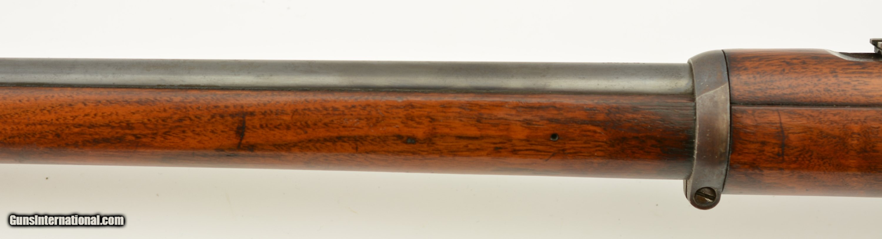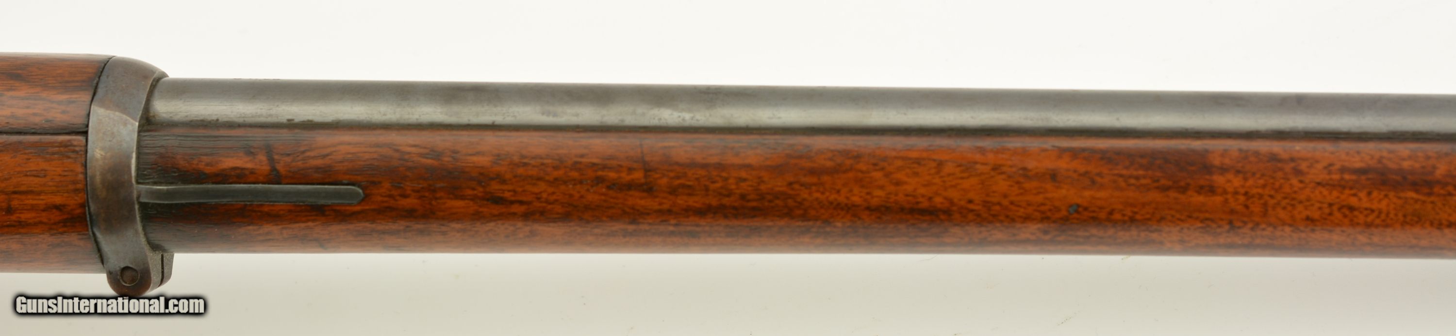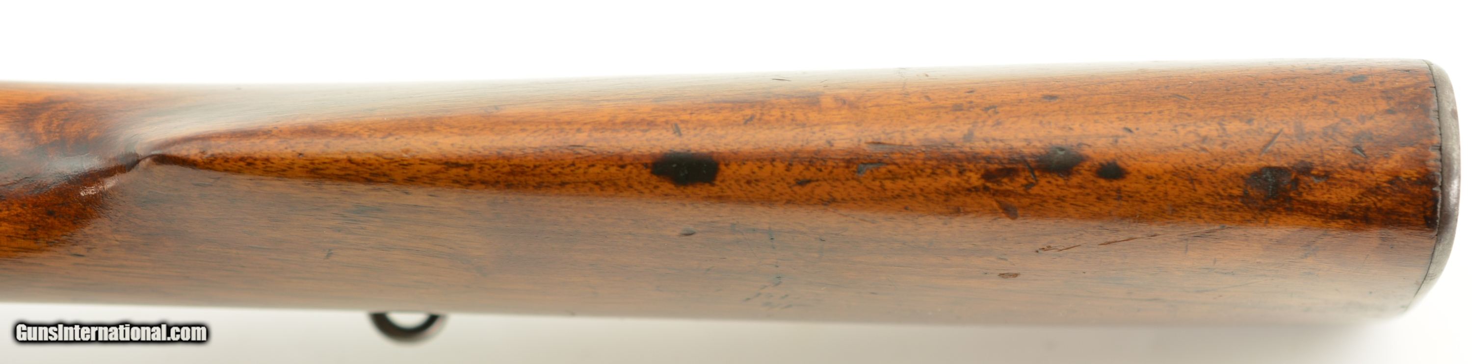 Description: Serial #1155, .30-40 Krag, 30" barrel with a fine, bright bore that has mild freckling within the grooves. This is one of only two known examples of this model chambered in .30 US, and retains 95-97% of the original blue on the barrel, breechblock, and hammer. Some mild silvering is present on the muzzle, and there is gray fading on the top surfaces of the hammer and block. The frame retains a commensurate amount of the original, vibrant color case-hardening, and the breech and hammer pins retain most of their original bright fire blue finish as well. The walnut stock, forend, and handguard have small handling marks and minor surface bruises marring the original varnish finish, but are otherwise in fine condition. This is a very late production gun (only about 1100 were made before the transition to the Model 1897), and may very well be the last example made going by serial number. While the .30 Krag was never a cataloged chambering for the Model 1896, but the example in the Remington museum is also chambered in the US cartridge, making this the second known example, and the only one that is available to purchase. This is a true rarity, and would make a fine complement to any collection of high grade Remingtons, or single-shot military rifles. Antique SOLD Antique: Yes Manufacturer: Remington Model: 1896 Caliber Info: .30-40 Gauge Info: .30-40 |