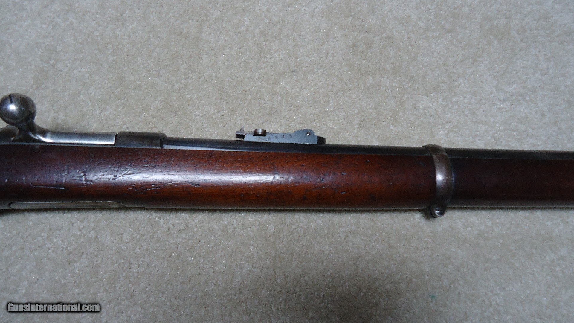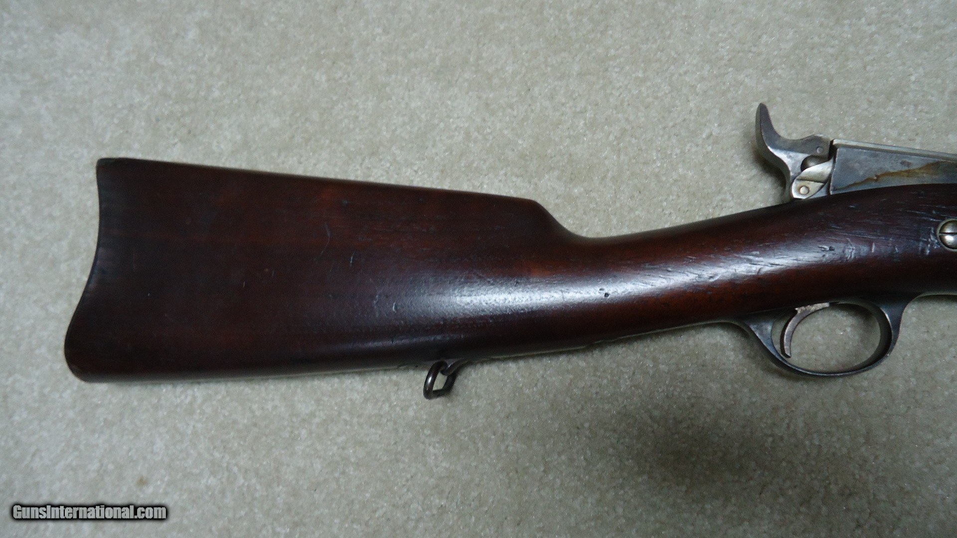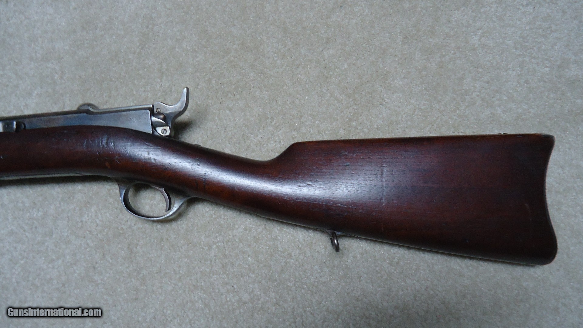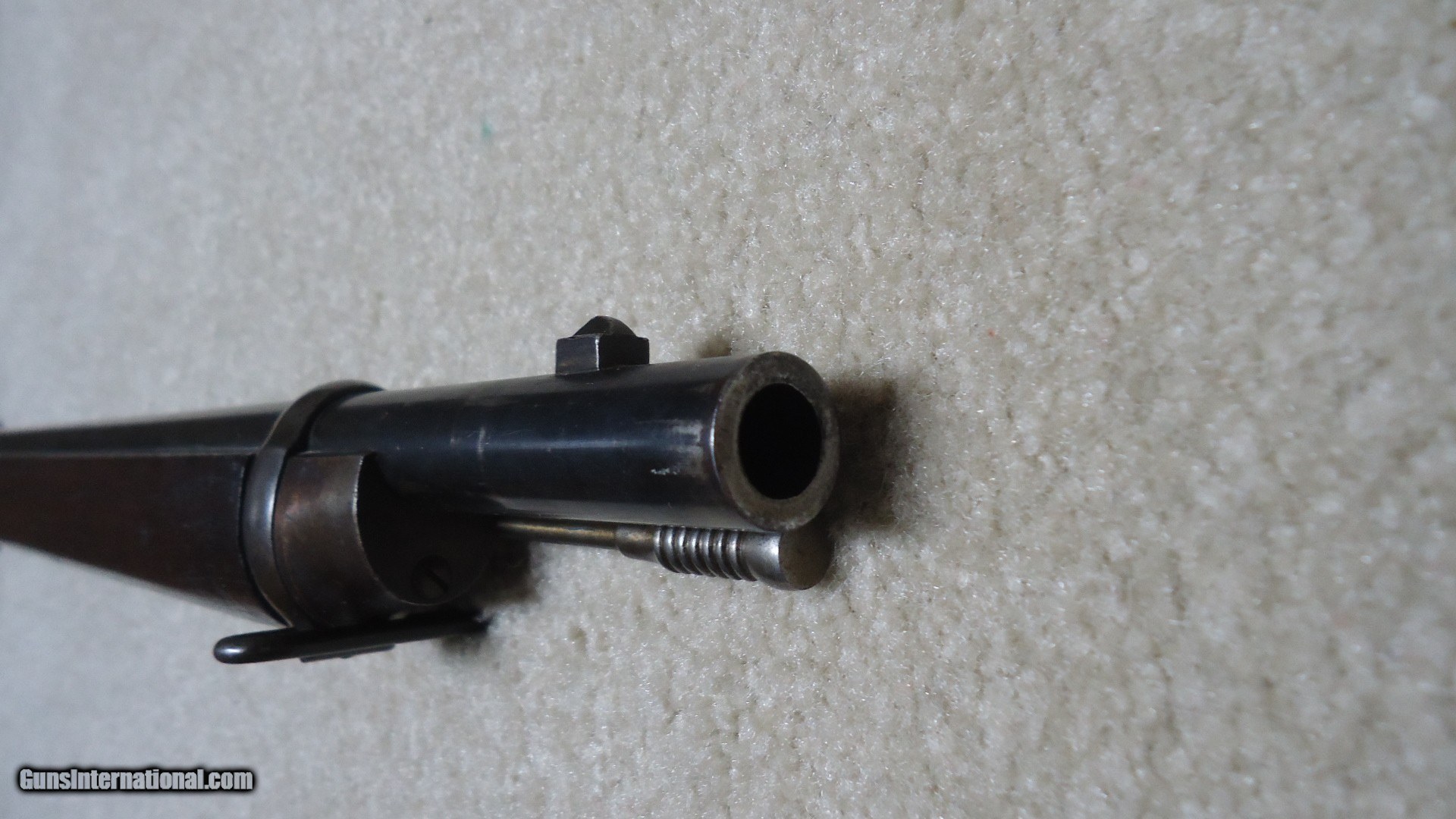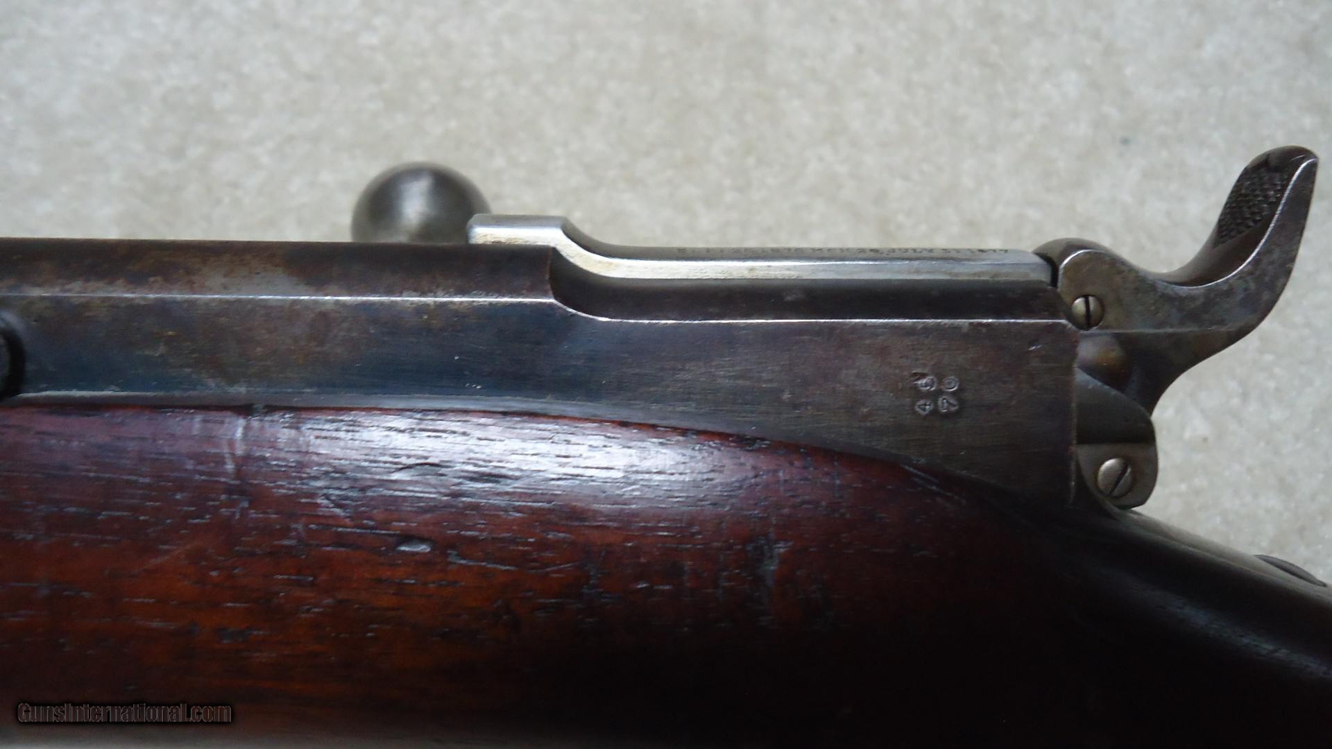 Description: THE RAREST REMINGTON I'VE EVER OFFERED! THIS IS A REMINGTON KEENE .45-70 COMMERCIAL U.S. NAVY PATTERN MUSKET! Most collectors have never seen one of the only 250 bolt action Keene Navy Muskets issued in 1880 that all have 29 1/2" barrels and full military stock with cleaning rod mounted on the side. According to the fine books: Rifles of the United States Navy and Marine Corps 1866-1917 by John D. McAulay and U.S. Military Bolt Action Rifles by Bruce Canfield, there is considerable information about the 250 U.S. Navy marked and issued rifles, but only a mention that a Civilian version was catalogued. McAulay says, "It is worth noting that Remington also offered the Navy rifle on the commercial market although it is not known how many, if any at all, were sold." In Canfield's book he shows a copy of a page from an early Remington catalogue showing the full line of Keene sporting rifles and Military muskets. Interestingly, the Keene Navy musket in the catalogue is offered in .43 (.43 Spanish) and .45-70. This one is stamped on the left side of the receiver with the .45-70 caliber designation as are all the commercial sporting models I've encountered over the years, but I don't believe the U.S. Navy marked and inspected muskets are caliber marked, which is typical of most military arms of the period like the Trapdoors, Spencers and Sharps etc. Also discussed in the books is that the few of these U.S. navy issued guns that are known to exist are typically is very rough condition, often with parts missing. This is the first commercial example I've heard of. It is in particularly fine condition overall with excellent wood and side-mounted cleaning rod intact. The barrel shows good blue in the more protected areas in front of the receiver, around the rear sight and toward the muzzle with the balance an aged gray/brown. The trigger guard retains about half of the deep blue. It has the military style rear sight and has the correct Remington markings on the top of the bolt along with the correct sling swivels. The bore is excellent. The most advanced Remington collections- museum or private- don't have one of these! I don't ever expect to encounter another! SOLD Antique: Yes Manufacturer: REMINGTON Model: KEENE NAVY MUSKET Barrel Length: 29 1/2 Condition: FINE Bore Condition: EXCELLENT |