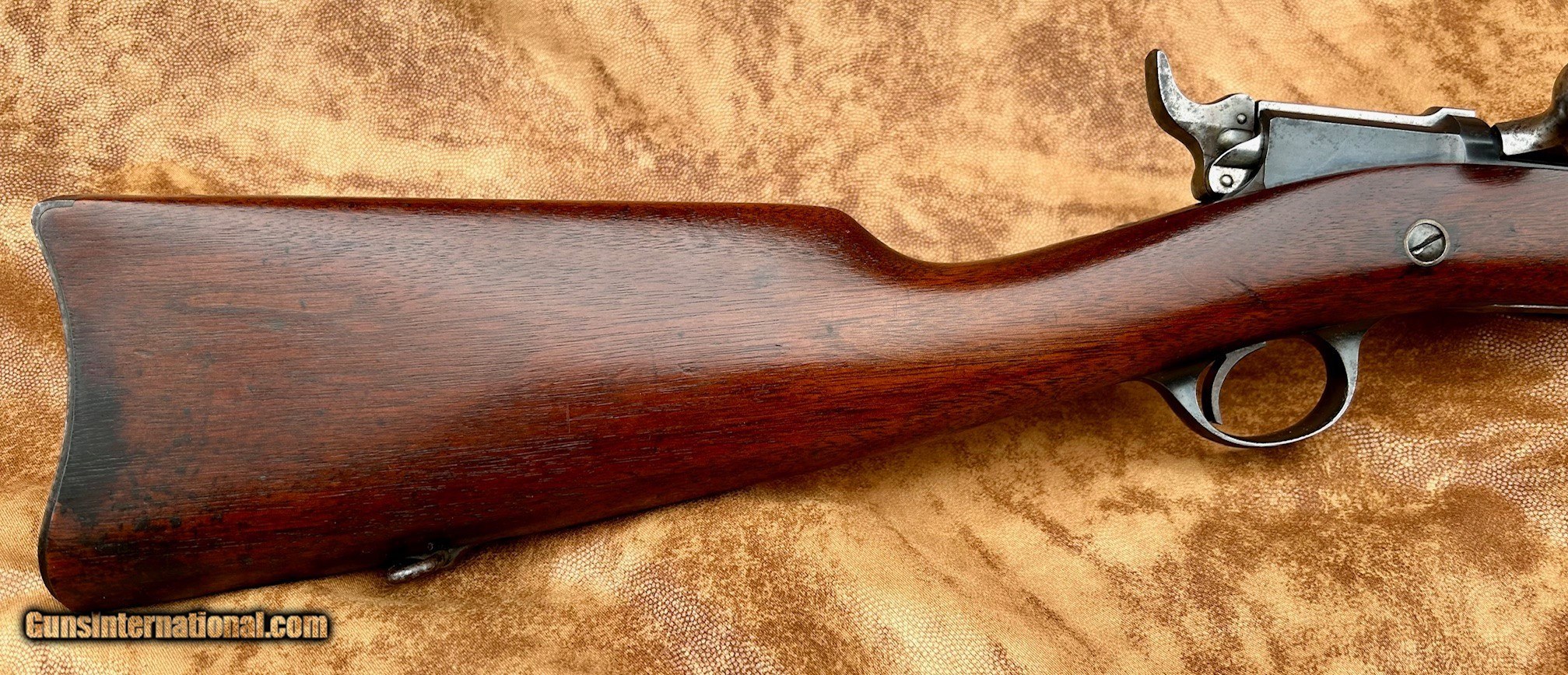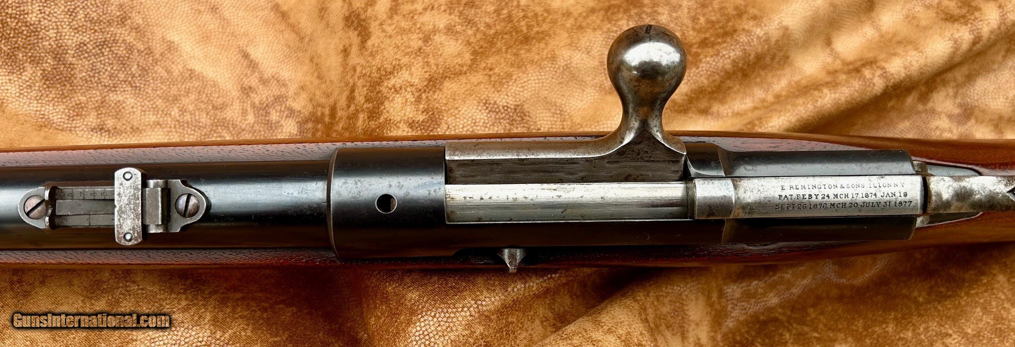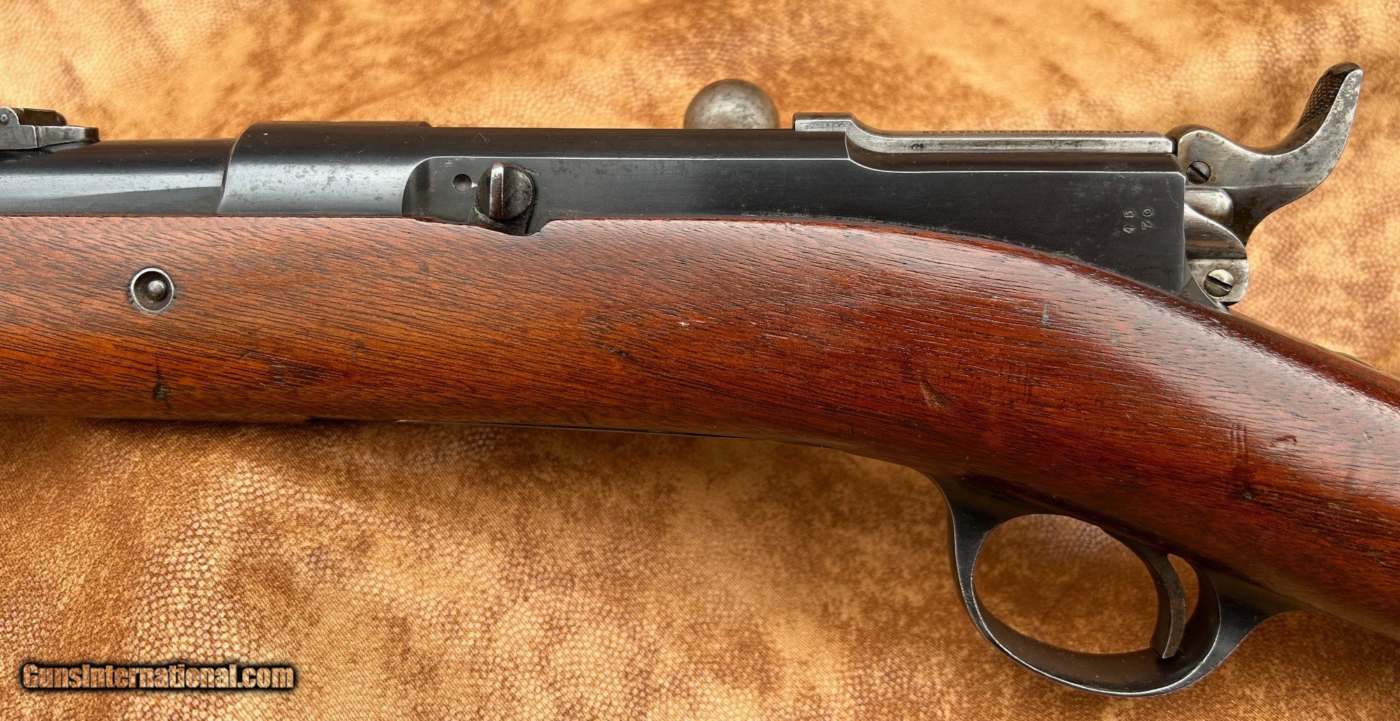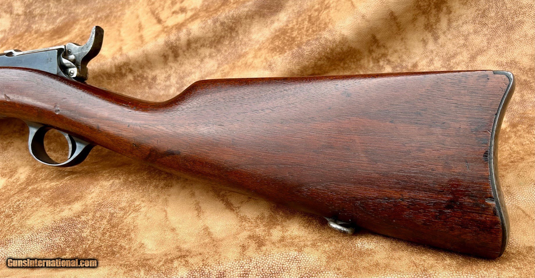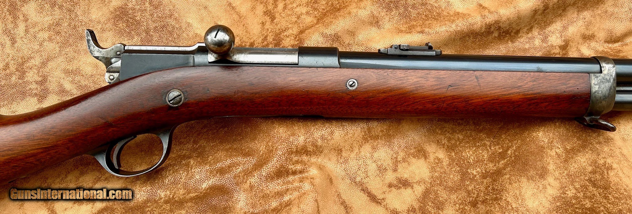 Description: Absolutely fantastic Remington Keene Carbine in the popular .45-70 caliber. Only approx 5000 Remington Keene bolt action guns were built and the carbine version was made in the fewest numbers. 1880's production, a true antique made in the black powder cartridge era. Not for modern ammunition. This carbine is a true survivor and obviously has seen little use and no abuse. Bright mint bore. Bright blue, excellent wood finish, no cracks, no extra holes. Scattered oxidation. Very light oxidation blems on upper foreward side of barrel. Blue loss on buttplate. Nice screws. Nice tight folding sight. Tight crisp functioning mechanics. No visible serial number. The photos represent the gun well. In my experience this is one of the nicest Remington Keene Carbines in existance and are rarely offered for sale in this condition & caliber. Any & all firearms such as this should be inspected by a qualified gunsmith before firing. Priced to sell for immediate delivery. SOLD Antique: Yes |