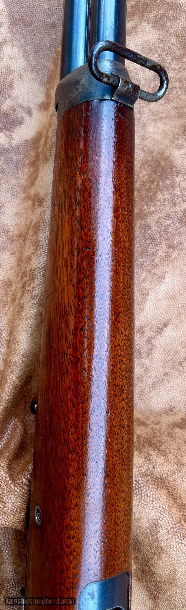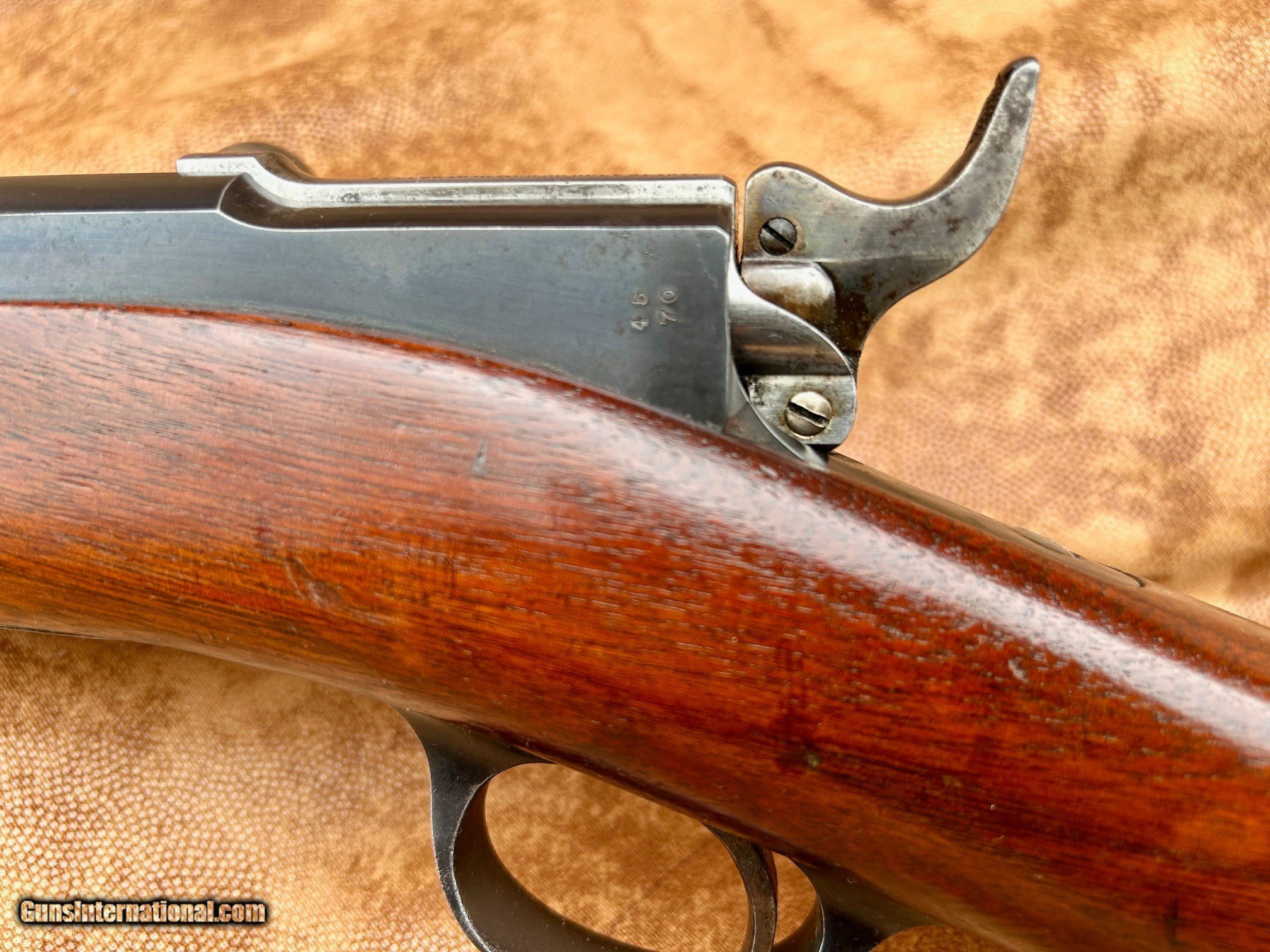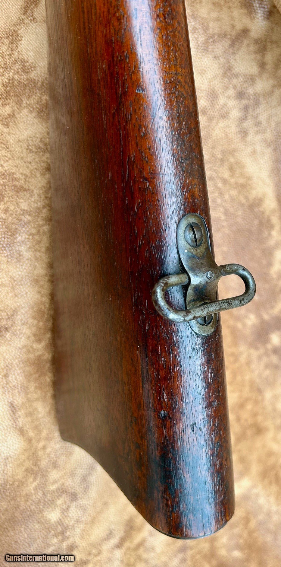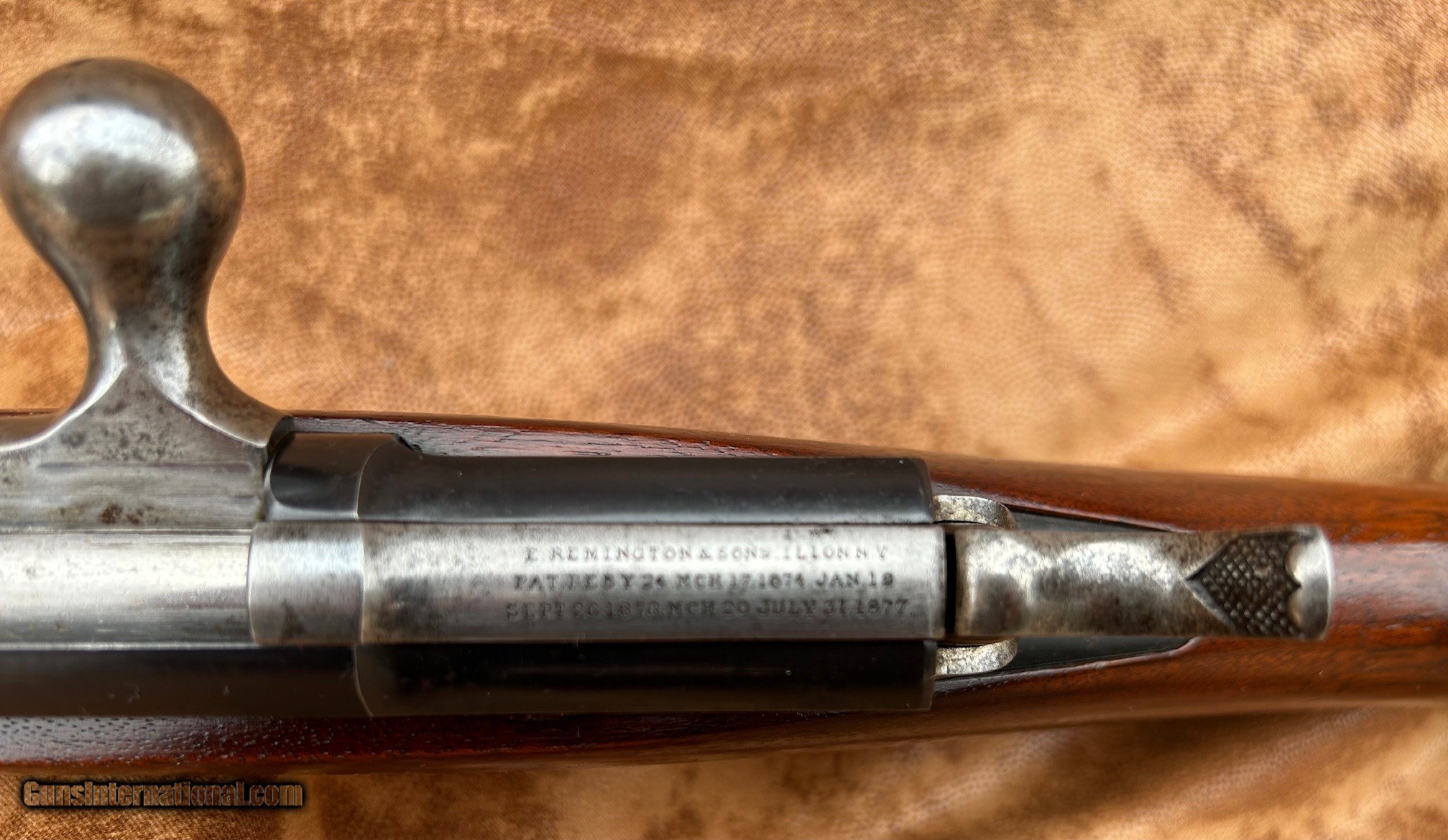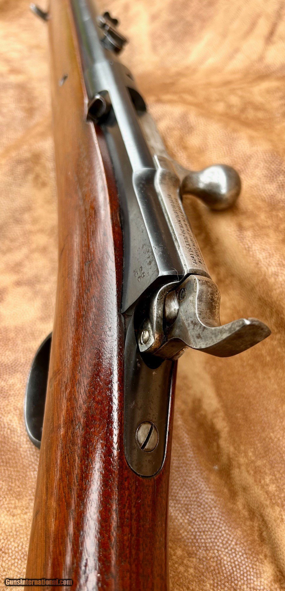 Description: Absolutely fantastic Remington Keene Carbine in the popular .45-70 caliber. Only approx 5000 Remington Keene bolt action guns were built and the carbine version was made in the fewest numbers. 1880's production, a true antique made in the black powder cartridge era. Not for modern ammunition. This carbine is a true survivor and obviously has seen little use and no abuse. Bright mint bore. Bright blue, excellent wood finish, no cracks, no extra holes. Scattered oxidation. Very light oxidation blems on upper foreward side of barrel. Blue loss on buttplate. Nice screws. Nice tight folding sight. Tight crisp functioning mechanics. No visible serial number. The photos represent the gun well. In my experience this is one of the nicest Remington Keene Carbines in existance and are rarely offered for sale in this condition & caliber. Any & all firearms such as this should be inspected by a qualified gunsmith before firing. Priced to sell for immediate delivery. SOLD Antique: Yes |