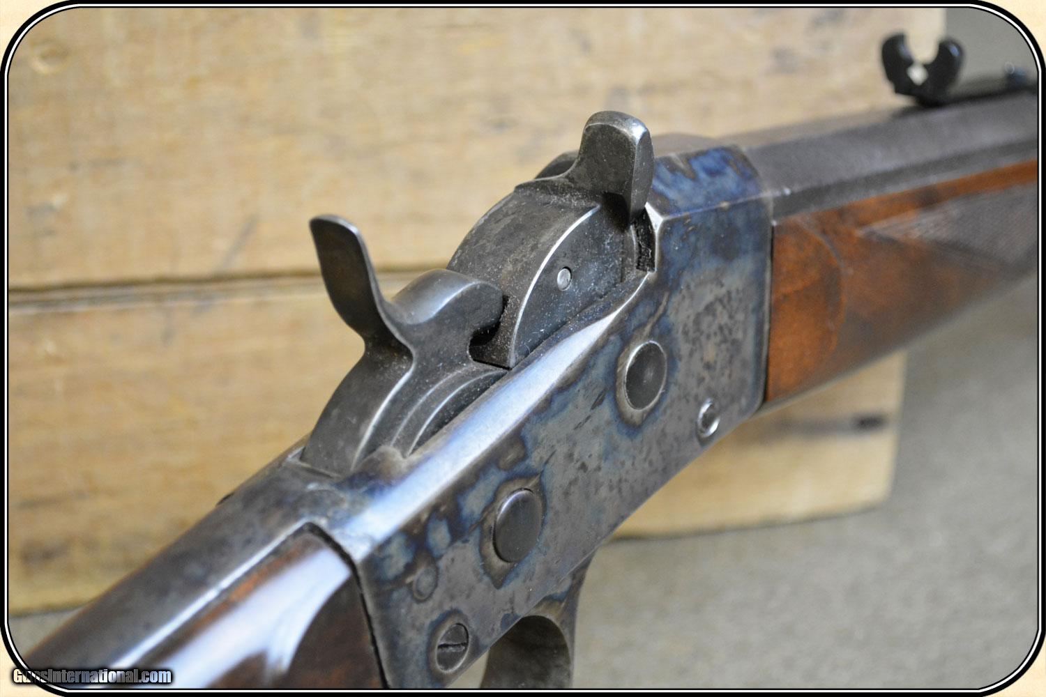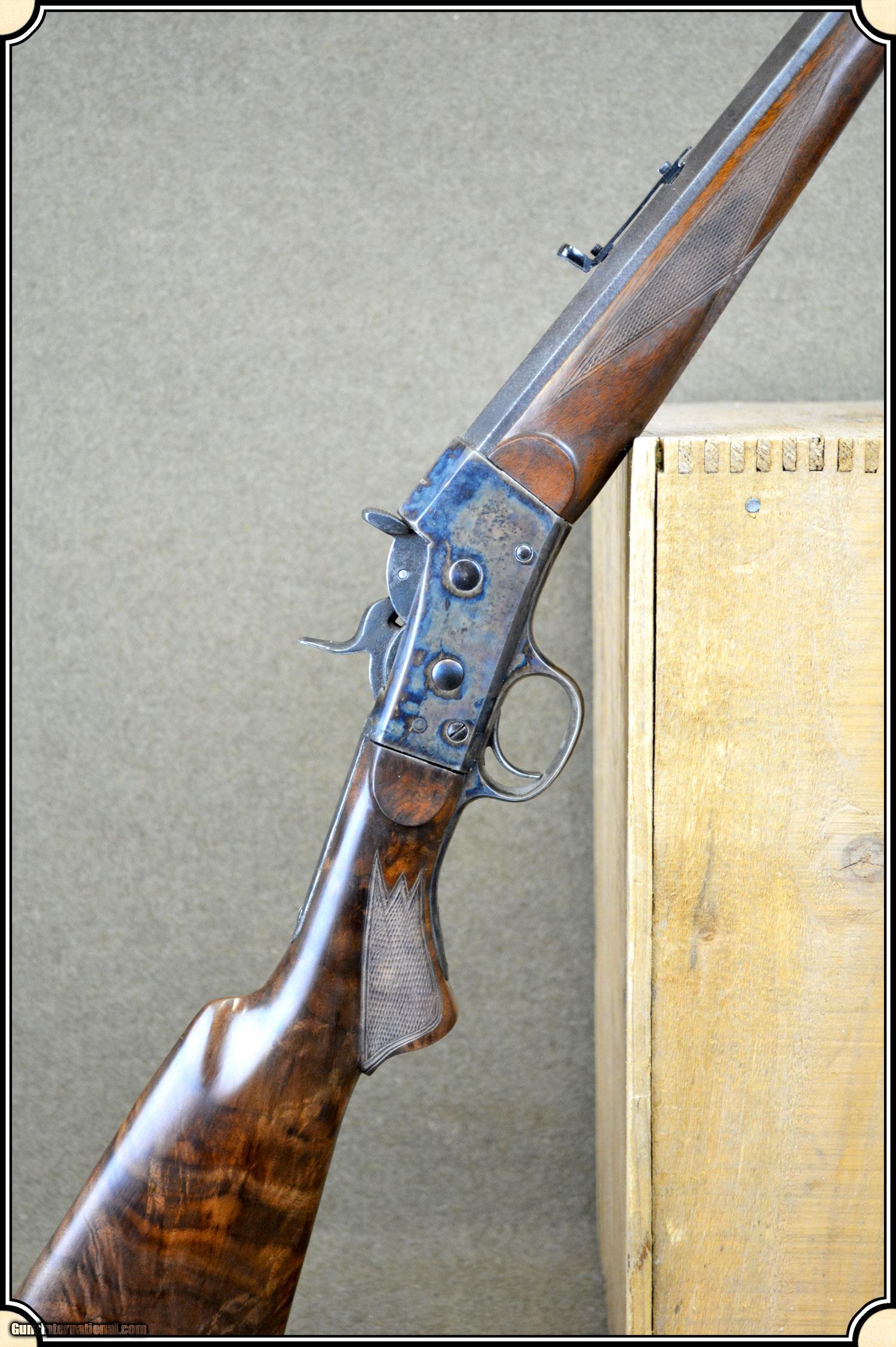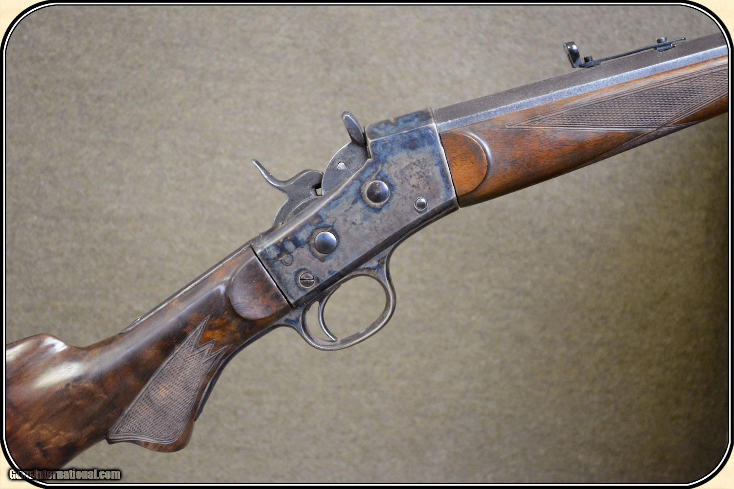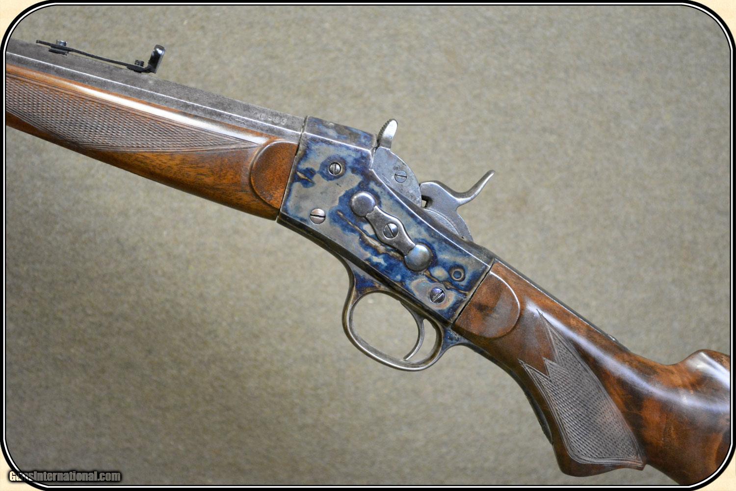 Description: Remington Rolling Block single shot Sporting rifle, 40-65 cal.. Restocked 26” octagon barrel and action, with case hardened frame and deluxe checkered semi-pistol grip stock. This gun is in overall very good condition showing traces of original blue finish remaining on the barrel. Marked "Remington & Sons, Ilion, N.Y.”. Very strong rifling, with crisp action. Fore stock is checkered with poured pewter nose cap. The butt stock shows beautiful graining. Front sight is a globe and the rear sight is modern replacement. PAYMENT Cash, postal money order, cashiers check, personal & business checks. May order at riverjucntion on-line with credit card. SOLD |