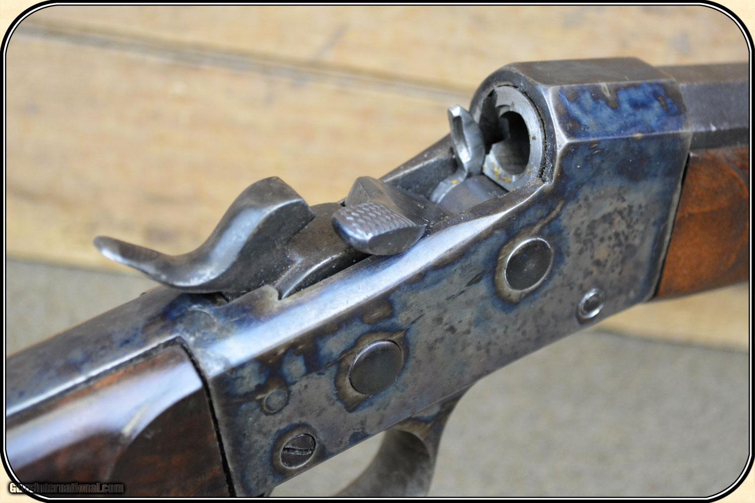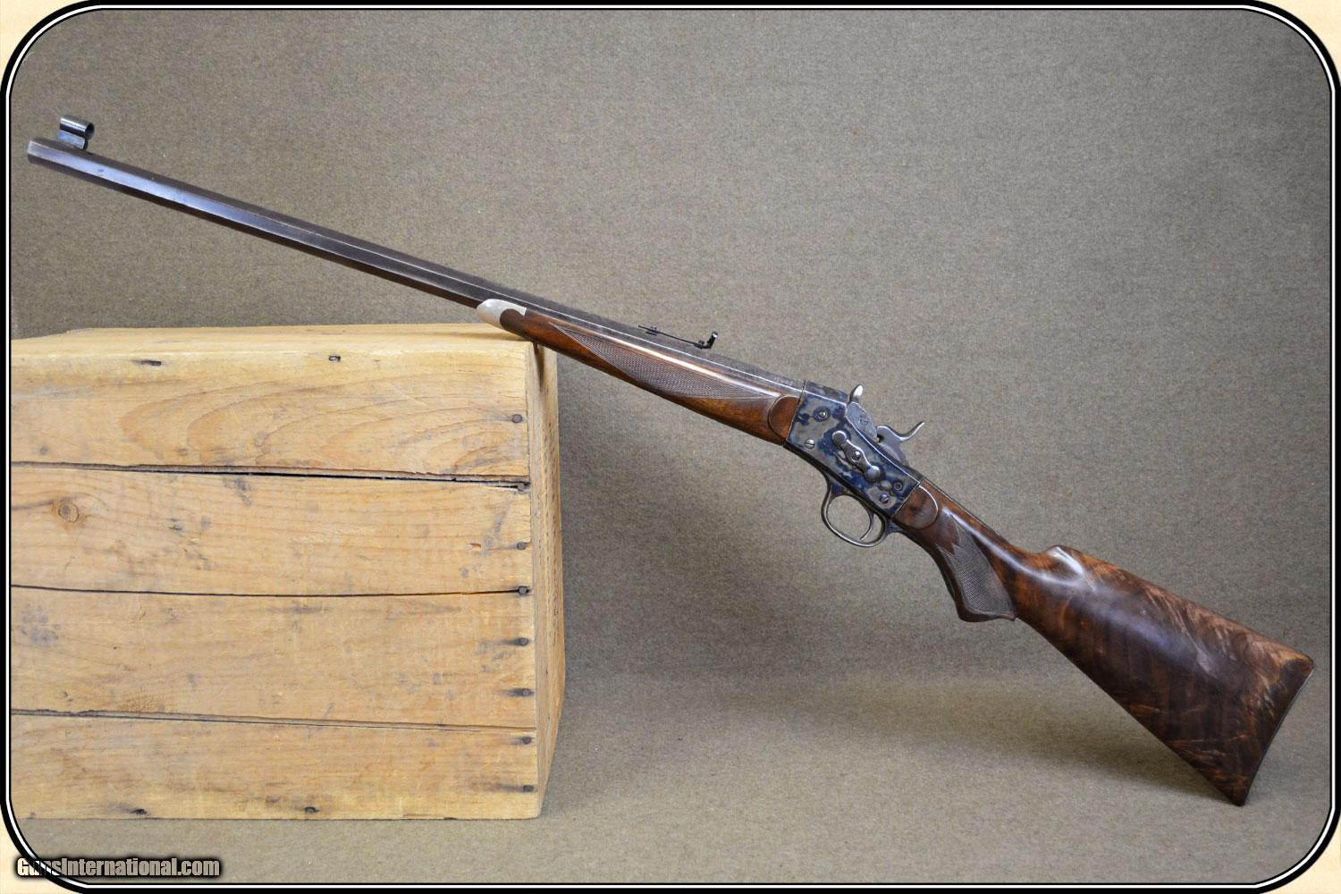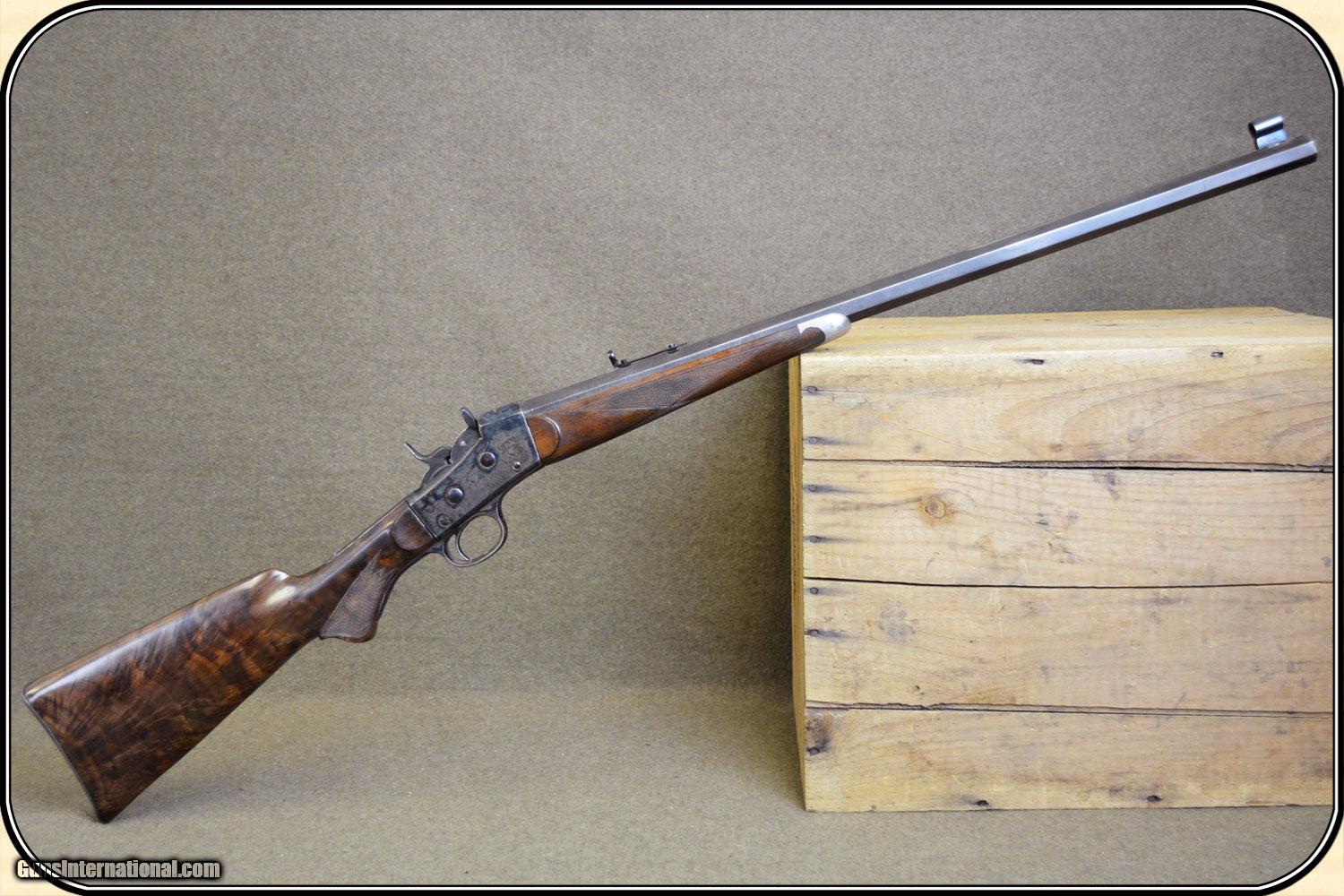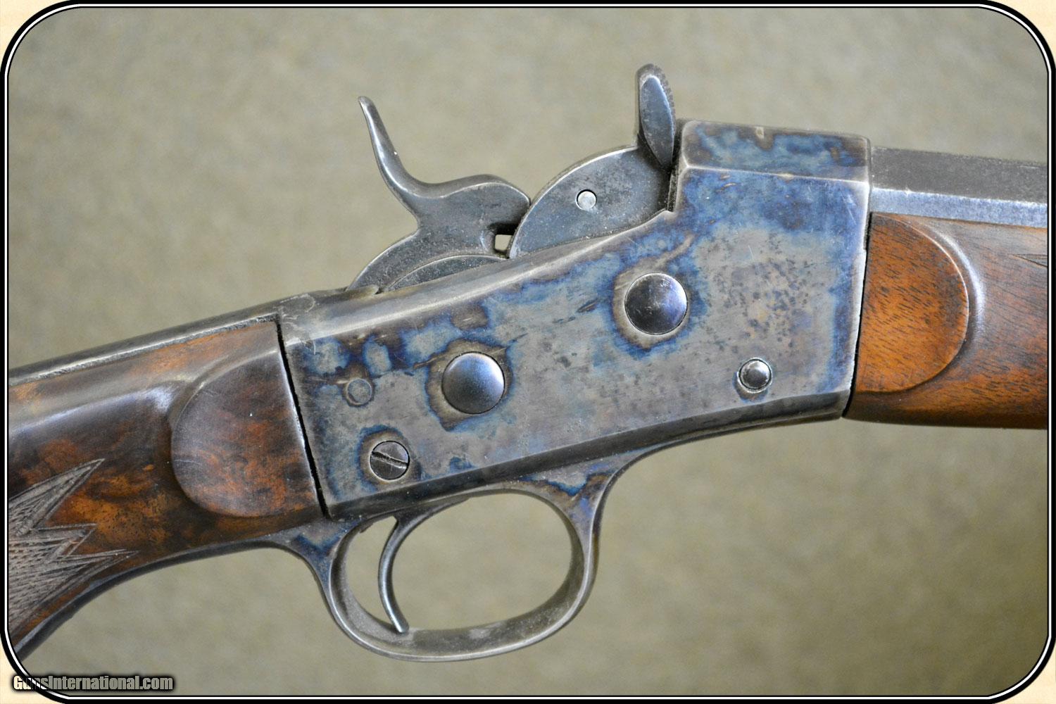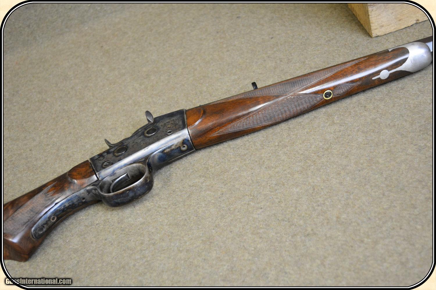 Description: Remington Rolling Block single shot Sporting rifle, 40-65 cal.. Restocked 26” octagon barrel and action, with case hardened frame and deluxe checkered semi-pistol grip stock. This gun is in overall very good condition showing traces of original blue finish remaining on the barrel. Marked "Remington & Sons, Ilion, N.Y.”. Very strong rifling, with crisp action. Fore stock is checkered with poured pewter nose cap. The butt stock shows beautiful graining. Front sight is a globe and the rear sight is modern replacement. PAYMENT Cash, postal money order, cashiers check, personal & business checks. May order at riverjucntion on-line with credit card. SOLD |
