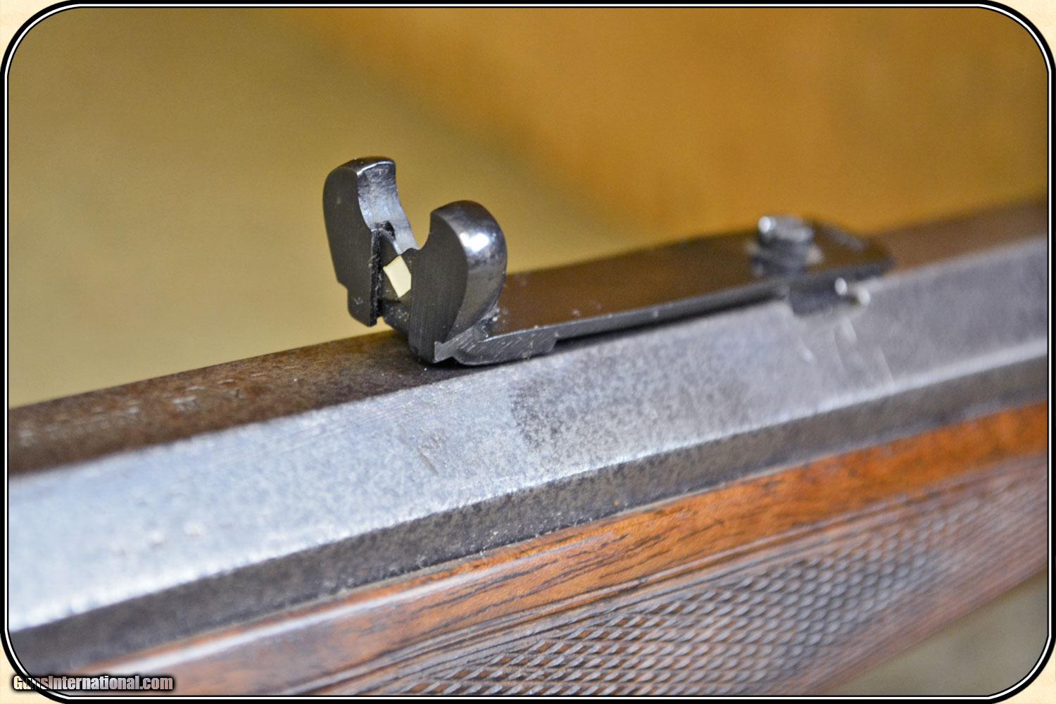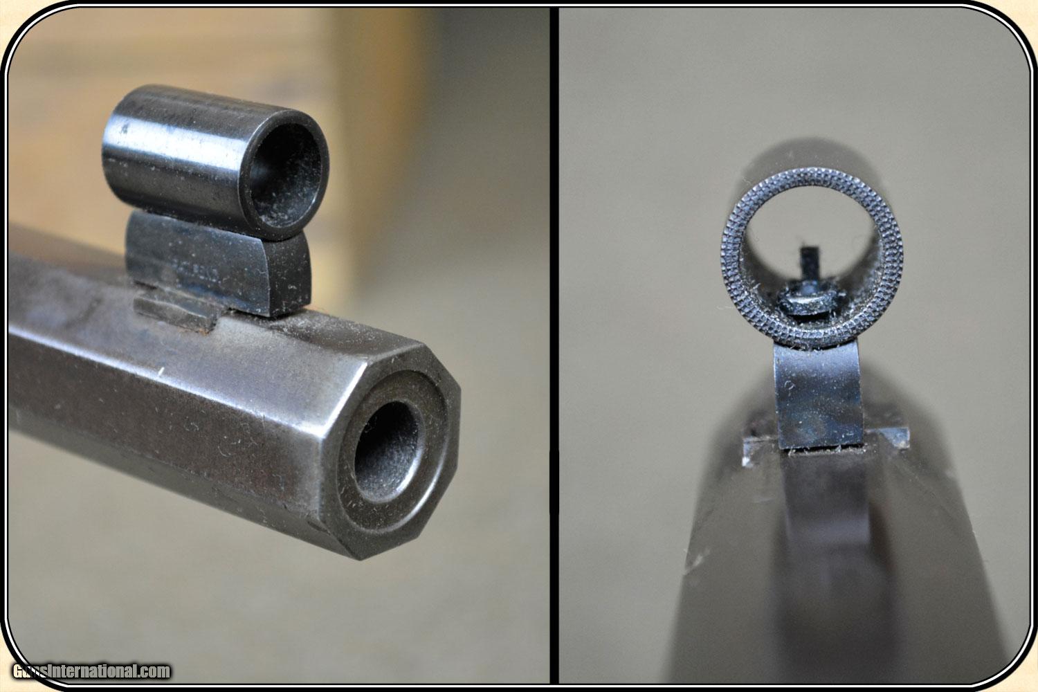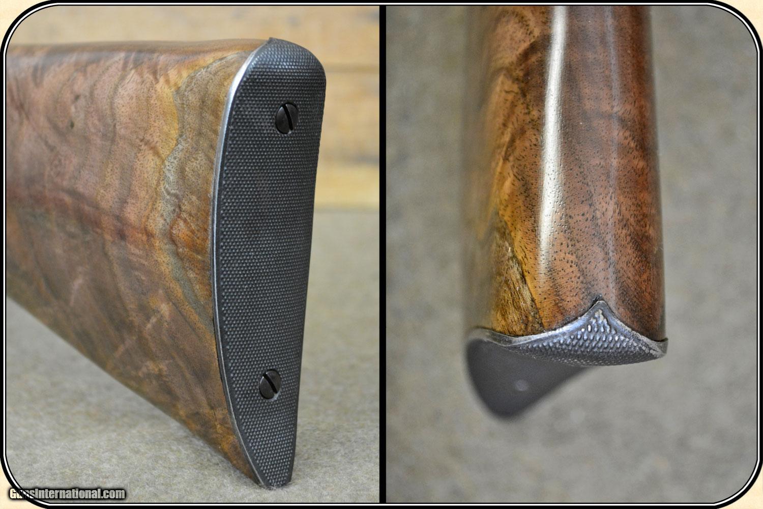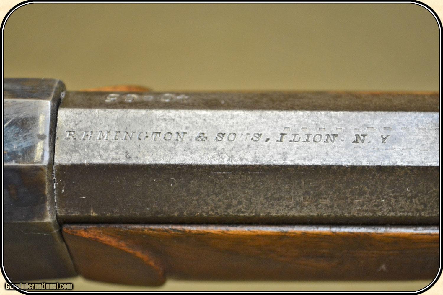 Description: Remington Rolling Block single shot Sporting rifle, 40-65 cal.. Restocked 26” octagon barrel and action, with case hardened frame and deluxe checkered semi-pistol grip stock. This gun is in overall very good condition showing traces of original blue finish remaining on the barrel. Marked "Remington & Sons, Ilion, N.Y.”. Very strong rifling, with crisp action. Fore stock is checkered with poured pewter nose cap. The butt stock shows beautiful graining. Front sight is a globe and the rear sight is modern replacement. PAYMENT Cash, postal money order, cashiers check, personal & business checks. May order at riverjucntion on-line with credit card. SOLD |
