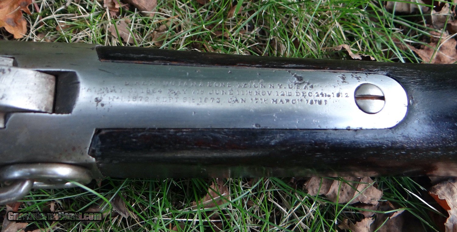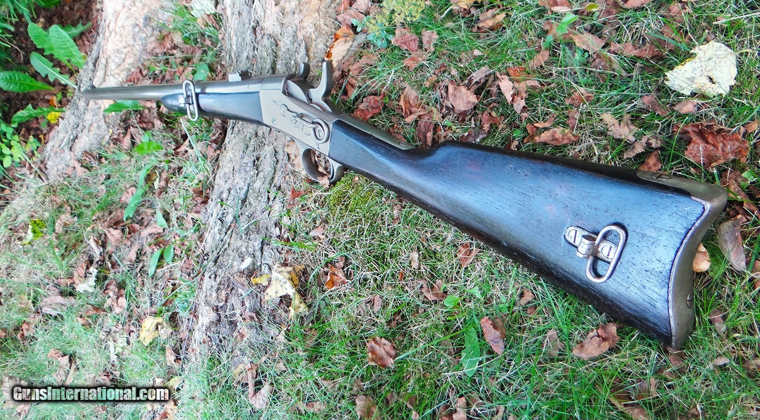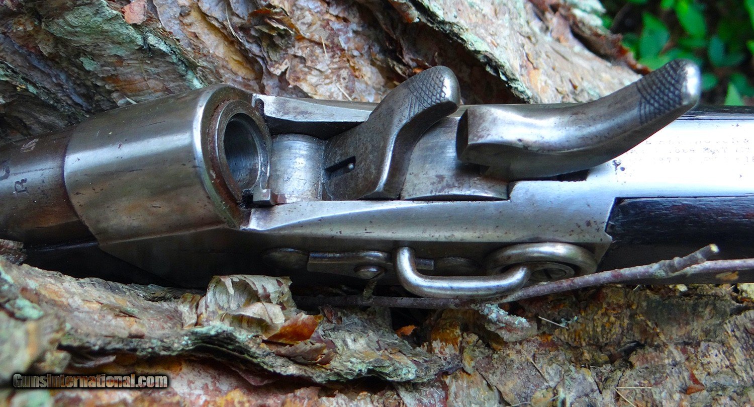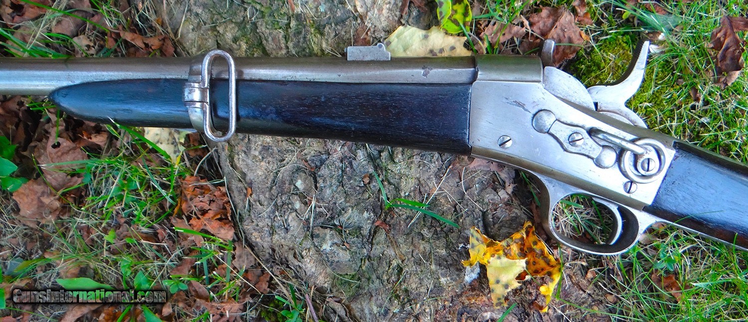 Description: A very rare .50 caliber Remington Rolling Block saddle ring carbine designed for Mexican President Porfirio Diaz special ‘RURALE’ police force. When Diaz became president of Mexico in 1876 he reconstituted a special force of mounted police to 'maintain order' in Mexico’s northern states and along the American Southwest border. One thousand Remington rolling block saddle ring carbines were specially ordered for this force, it is believed they were delivered to the port of Vera Cruz in 1877. The carbines were built on Remington’s No.1 military action in .50-70 US caliber with 20 1/2” barrels. In addition to saddle rings these carbines also had standard sling swivels fitted on their left sides. These carbines were ordered with an interesting special feature, their firing plans were specially designed such that they could fire both the standard .50-70 US centerfire cartridge AND .50 caliber Spencer repeating rim fire rifle cartridges. The Mexican government had purchased a quantity of US surplus Spencer carbines and ammunition and since the ‘Rurales’ patrolled the remote ‘Frontier’ it was thought a good idea they could use both types of ammunition in their carbines’. These thousand ‘Rurale’ carbines were the only military rolling blocks Remington built with this feature. The ‘Rurales’ were intended to preform similar duties to the Texas Rangers on the US side of the border. They were also in a constant state off war with Apache, Lipan, and Yaqui Indians. They also had to deal with all manner of Mexican bandits, Diaz’s political enemies, and American cattle and horse rustlers. The growth of American ranching in Arizona, New Mexico, and Texas along with the founding of towns like Tombstone, AZ led to a high demand for cattler and horses beyond what the local ranchers could provide. American ranchers and cowboys found it very profitable to cross into Mexico late at night to steal cattle and horses from Mexican rancheros which led to cross-border reprisals, ambushes, by both ‘Rurales' and Americans. In one instance in the Fall of 1881 Americans attacked Mexican gold smugglers crossing into the US. It is believed a ‘Rurale’ officer was with the smugglers and survived to lead an ambush of American cattle rustlers in which the patriarch of the Clenton family was killed, which may have hastened the gunfight between Clantons and Earps at the ‘OK Corral. In any event the ‘Rurales’ themselves came to be regarded as dangerous criminals by Mexicans and Americans on both sides of the border. Very very few of the special Remington Rolling Block carbines issued to the ‘Rurales’ in 1877 survived their hard usage. The few known specimens in collections are for the most part in deplorable condition. Over the last fifty plus years this is the only ‘Rurale’ carbine I have ever had in hand and it is a very presentable survivor. Included with the overall and detail pictures of this carbine is a period photograph of Mexican ‘Rurales’ shouldering their carbines, it is the best period picture I could find showing the carbines and from it one can deduce they were originally finished in-the-white (natural steel finish) which was a traditional finish for military firearms of the period. The exterior surfaces of this carbine are fine with good Mexican government marks and Remington factory markings. Edges and contours are crisp. There is evident aging and all surfaces have a pleasing natural steel patina. Mechanical functions are excellent. The bore shows considerable use retaining clear rifling and pitting - not as worn as one would expect given where it’s been. The original walnut butt stock and forearm are fine retaining good color and old finish. Given the small number of these carbines built and their hard use over a long period it is amazing this one has survived in a condition fit for a fine collection of Remington and/or Frontier firearms. This is probably one of the best of the few known ‘Rurale’ contract Remington carbines. Dimensions; overall length 36”, barrel 2o 1/2”, caliber .50-70 US cf / .50 Spencer rf SOLD Antique: Yes Rifle Caliber: .50-70 Government Manufacturer: Remington Model: No. 1 military carbine Barrel Length: 20 1/2 Condition: fine Metal Condition: fine Wood Condition: fine Bore Condition: fair Action: Rolling lock Manufacture Date: 1877 Extras: dual caliber .50-70US / .50 Spencer Carbine |