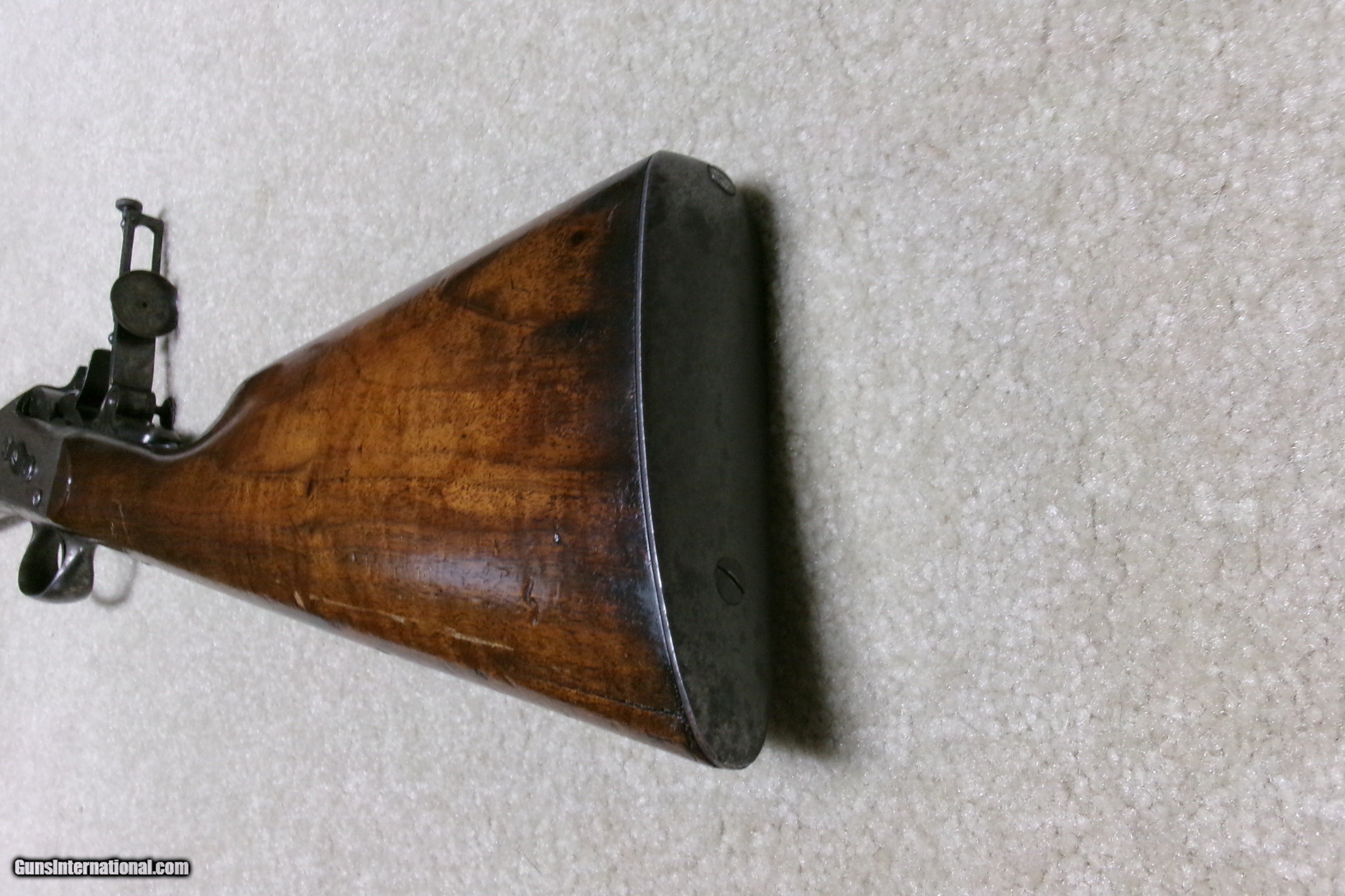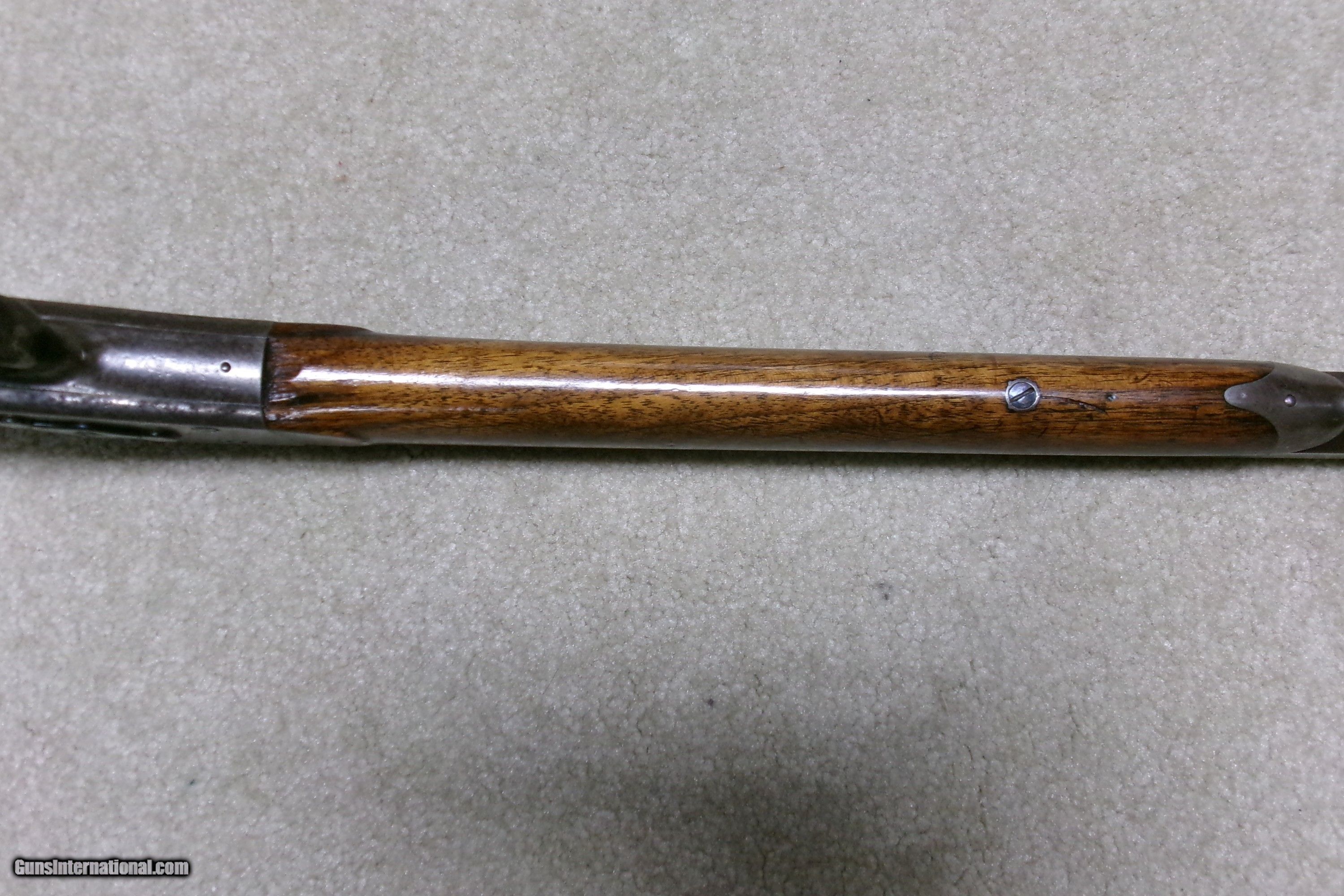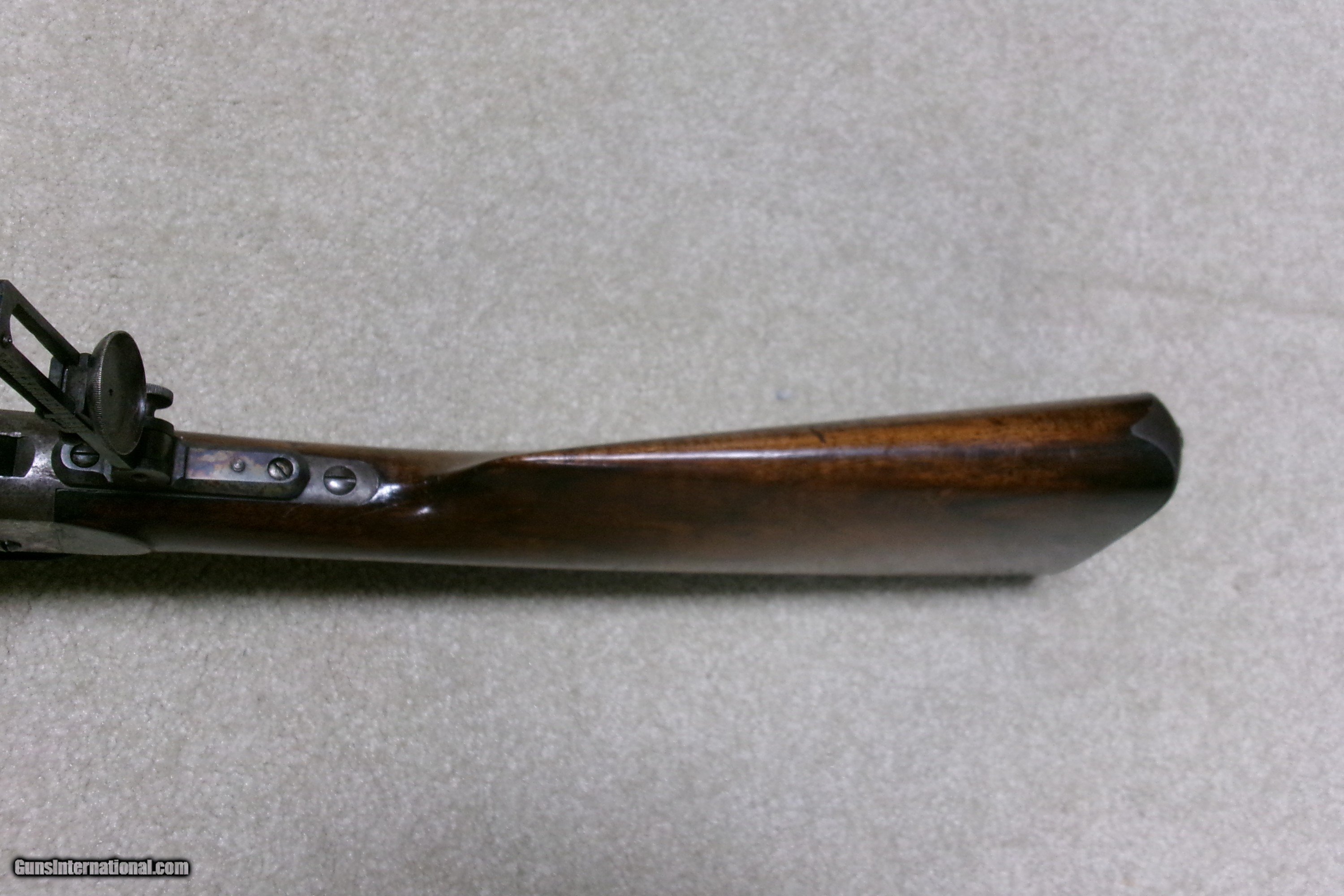 Description: SPECIAL ORDER EARLY REMINGTON No.1 ROLLING BLOCK OCT. SPORTING RIFLE IN .44-77, #2XXX. It is fairly rare to find Sporters with special features. This one has a straight sporting stock with factory smooth steel ,shotgun butt plate instead of the usual curved heavy steel “carbine-style” butt plate. Second it has an extra long 32” octagon barrel. The standard length for these was 26” with a charge for each two inch increment over this length. Most seem to be found with 30” barrels with the long 32” not often seen. The inside of the butt plate number matches the receiver number as does the forend and bottom of the barrel number under the forearm. It is fitted with a case colored elevation adjustable mid-range vernier tang sight, a small spirit level (bubble level) in the narrow rear barrel dovetail along with a windage adjustable globe front sight. The front sight is probably a later addition as it is unmarked except for the patent date of Feb. 13, 1894. Stock and forend with correct steel schnable tip are generally excellent and show light handling with only some minor edge chipping at the forend bottom by the receiver. The receiver is mostly a mottled gray/brown. The hammer and breech block still retain some very aged blue. The barrel has even thin blue. The bore is bright and excellent with any corrosion very light and surface ahead of the chamber that is minor. Light hammer spring with weak half-cock. The barrel is correctly marked “.44 CTGE S.” on the bottom flat ahead of the forearm and the muzzle end of the barrel has the original Remington crown with the octagon edges beveled. An attractive and unusual 1870s Remington that is difficult to find in even standard configuration. Antique: Yes Rifle Caliber: .44-77 Manufacturer: REMINGTON Model: No. 1 Serial Number: 2XXX Barrel Length: 32" OCT. Condition: FINE+ Bore Condition: EXCELLENT Price: $4,850.00 Contact Seller |