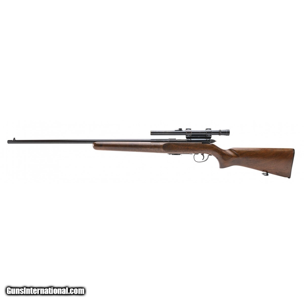 Bolt action target rifle manufactured in 1948. Metal has a thinning blue that is turning to patina. Bore is excellent. Comes with a period Weaver B4 scope. Optics are a little foggy, but still visible. Good to very good overall condition.