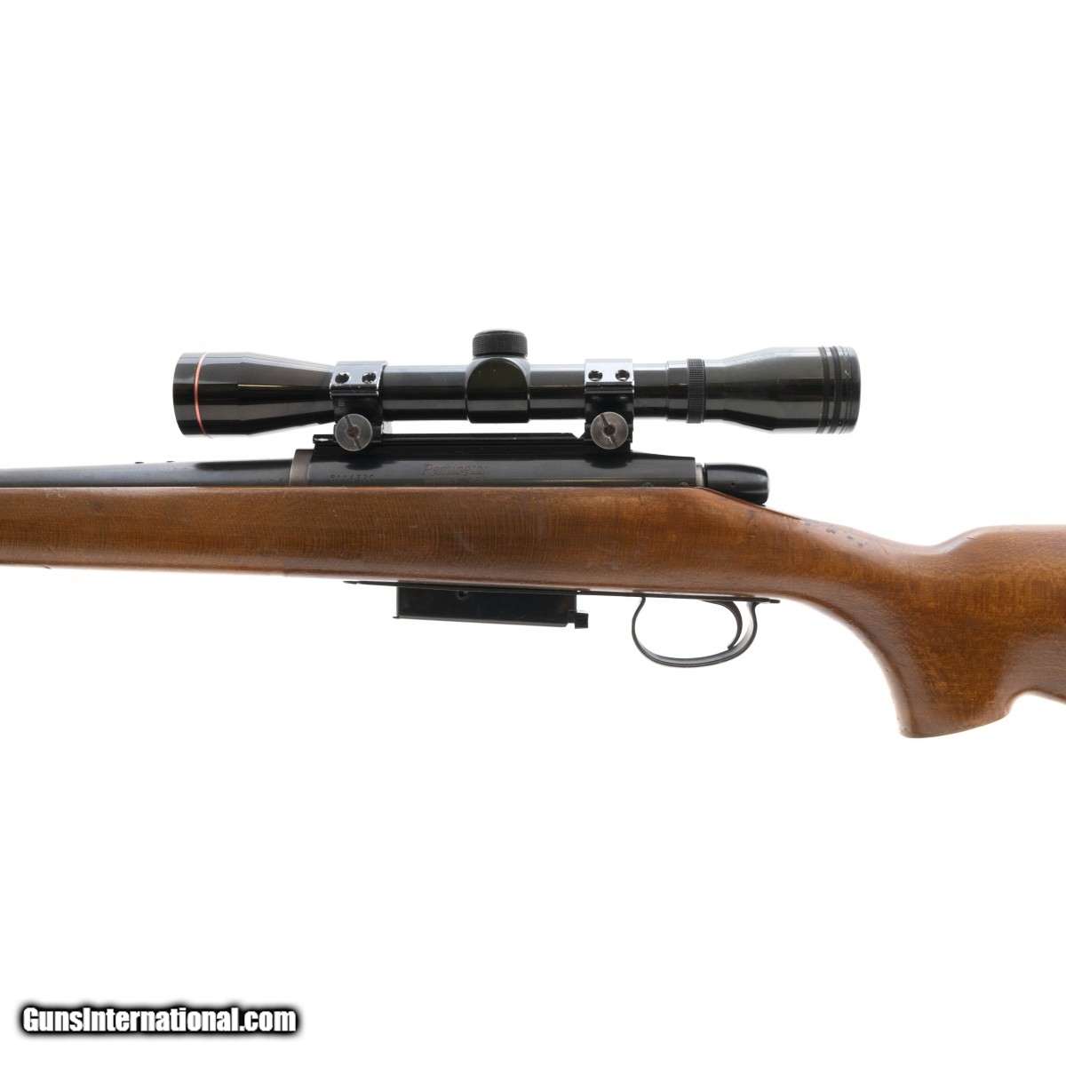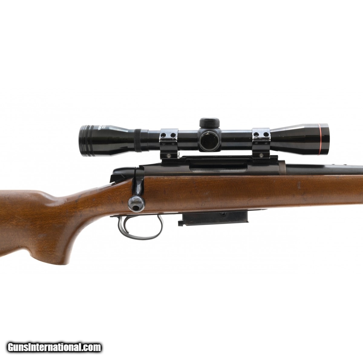 Bolt action deer rifle with detachable magazine. Has s 4X scope mounted. The rifle shows numerous marks and wear on the stock, the metal is very good.