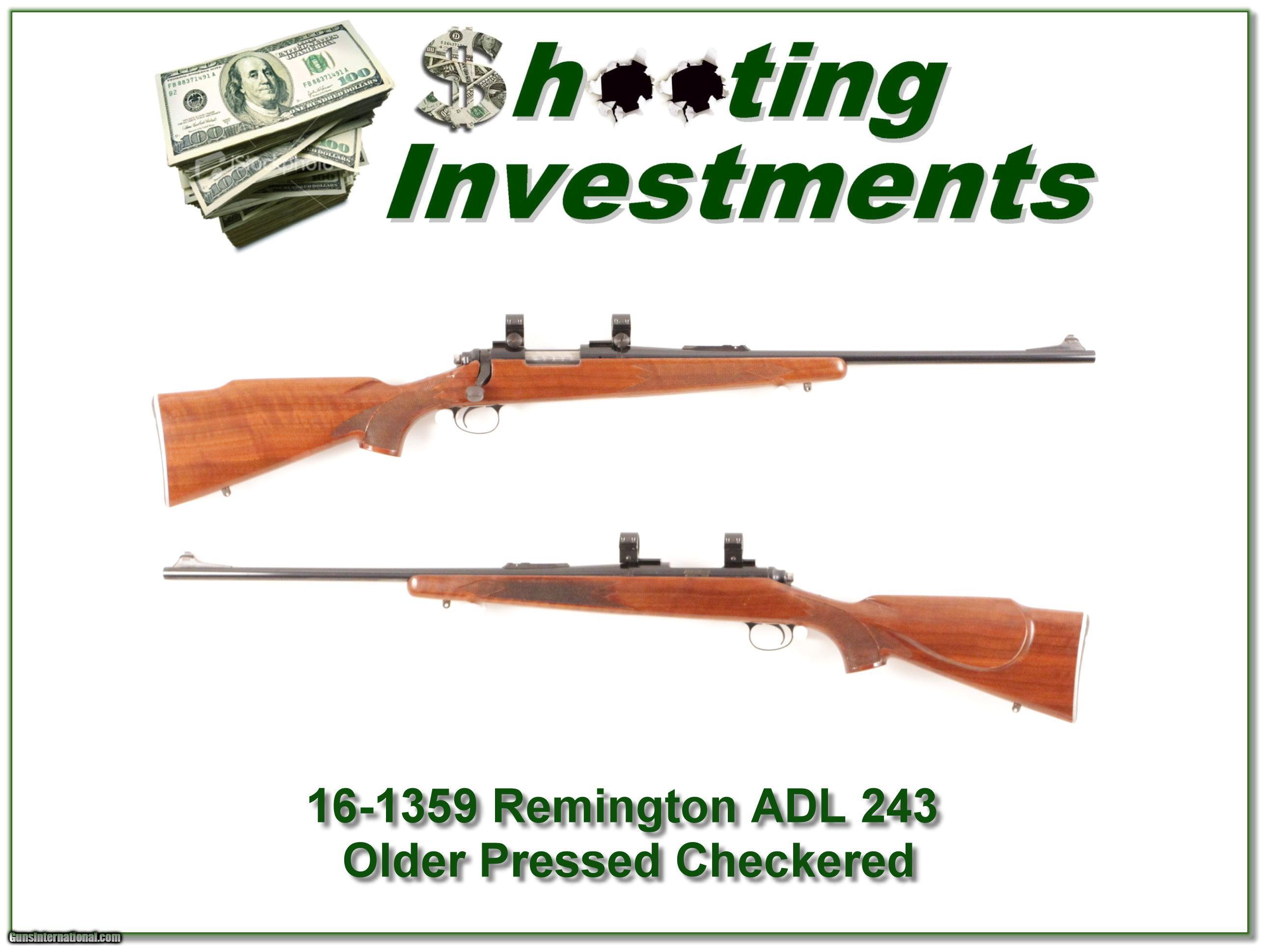 Description: This is an excellent condition Vintage Remington ADL in 243 Winchester. It has the aluminum butt plate and pressed checkering. It comes as shown with bases and rings. It will make a classic hunting gun and these are going up in value! That makes them real Shooting Investments! Shipping and insurance is $35 or $15 more if you want it shipped in a new Plano hard case. Please email me with any questions or larger pictures. (I now consign quality firearms only 10%! Let me know if you have any you would like to sell!) [16-1359] Payment: Payment is by Money Order, Cashiers Check or Personal Check. I can now also accept MasterCard and Visa with a 3% convenience fee. PayPal can be used for some items but never firearms. Please let us know if you would like to pay via PayPal. Shipping: The shipping charge will be listed in each description. It is $35 for most guns. Some heavy guns or those insured for over $2000 will be higher. Shipments to Alaska and Hawaii are higher because air shipment is required. Most firearms are shipped within 5 days of receipt of payment. We prefer shipping at the beginning of the week to avoid firearms in transit over weekends. We package all shipments carefully and insure them for the full purchase price, rounded up to the next $100. In the unlikely event that damage occurs, it is important that you save all packaging material for the claims process. Optics are shipped Priority Mail and most other non-firearm shipments are shipped First Class. Returns: Our return policy is simple. If for any reason you are not pleased with your purchase, you may return your item for a refund. The only exception is ammunition, it cannot be returned. It is important to us that you are happy. Guns cannot be fired or dissembled before returning them and must be returned in the same condition as received. Notification of a return must occur with-in 3 days of receipt at your dealer. Shipping, convenience and dealer fees are not refundable and are the responsibility of the buyer. Lay-a-way: If needed, we offer a 60 day lay-a-way option on most firearms. It is 1/3 now, 1/3 in 30 days and 1/3 in 60 days. Lay-a-way firearm sales are final. Consigning your firearms with Shooting Investments: We will help you get top dollar for your firearms. While most local guns shops charge 20% or more, our fee is only 10% with a minimum of $50. At your local gun shop it might take months to sell. Selling on-line provides instant access to thousands of interested buyers. You won’t find any other on-line dealer willing to sell your firearms for only 10% or listing every gun on 4 separate s. Selling through an House typically costs the seller 15% and the buyer an addition 15% (so 30%) and you have to wait several months to sell and longer to receive funds. If properly priced, we will sell your firearms in a week or two. Send us an email or give us a call and we’ll explain how easy it is for you to get top dollar. Trading: We collect guns and usually just trade for guns we want to add to our collections. We often sell guns for others wanting to purchase one of ours. We find this the most fair to both of us. Our Commission is only 10% and we hold the gun you want until yours sells. Please contact us if you want to sell one of yours to buy one of ours. Help for California Buyers: We are happy to ship to California. It is the buyer’s responsibility to make sure any item you buy is legal in your state. We are also happy to help with your purchase of a firearm from someone other than us. If you see a gun you would like to buy but the seller can’t or won’t ship to California we can help. You buy the gun and have it shipped to us. We’ll then ship it to your California dealer. The cost for this service is only $30 + shipping. Let me know if we can help! SOLD |