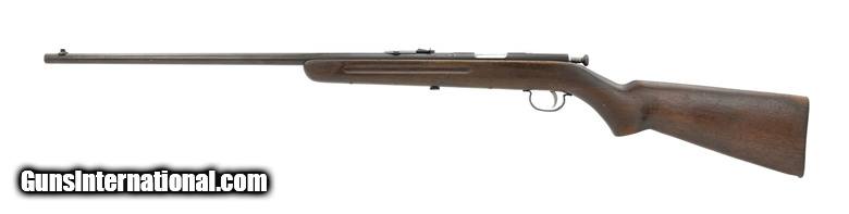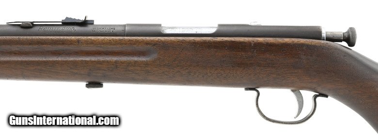 Description: Remington 33 22 S, L, LR caliber rifle. Made in 1933. Single shot bolt action bore is excellent. Metal has a brown patina. Stock has a chip at the toe. Good overall condition with wear.