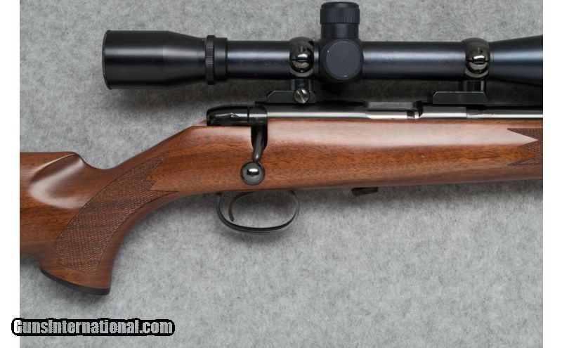 Description: Used. Beautiful .22 sporter! SOLD Caliber Info: .22 Cal. Metal Condition: Excellent Wood Condition: Excellent; couple of small marks Bore Condition: Clean and sharp Barrels: 24" - Target weight Triggers: Smooth blued steel Stock: Checkered pistol grip walnut Stock Dimensions: LOP - 13 3/8 Fore End: Checkered walnut Butt Pad: Black checkered butt plate Weight: 7 lbs. (with scope) Sights: No sights; Simmons scope Extras: Simmons 24X target scope with adjustable objective. Redfield rings and base; (3) magazines. Item Location: Sun Prairie, WI |