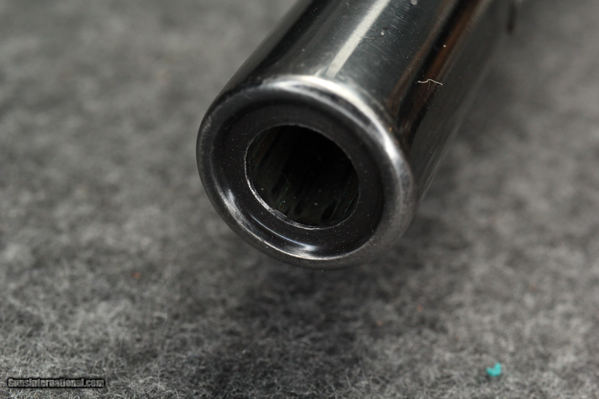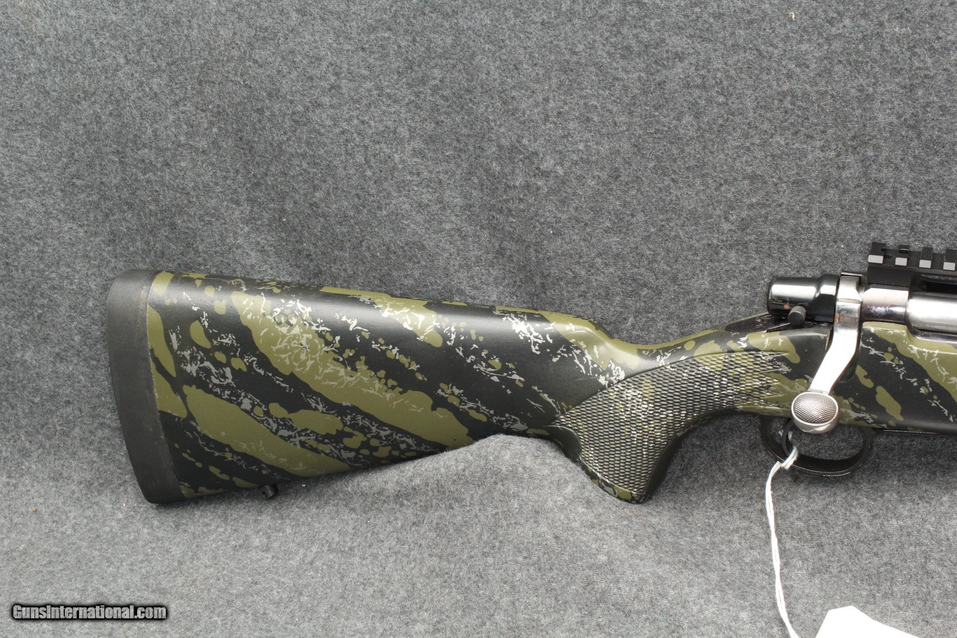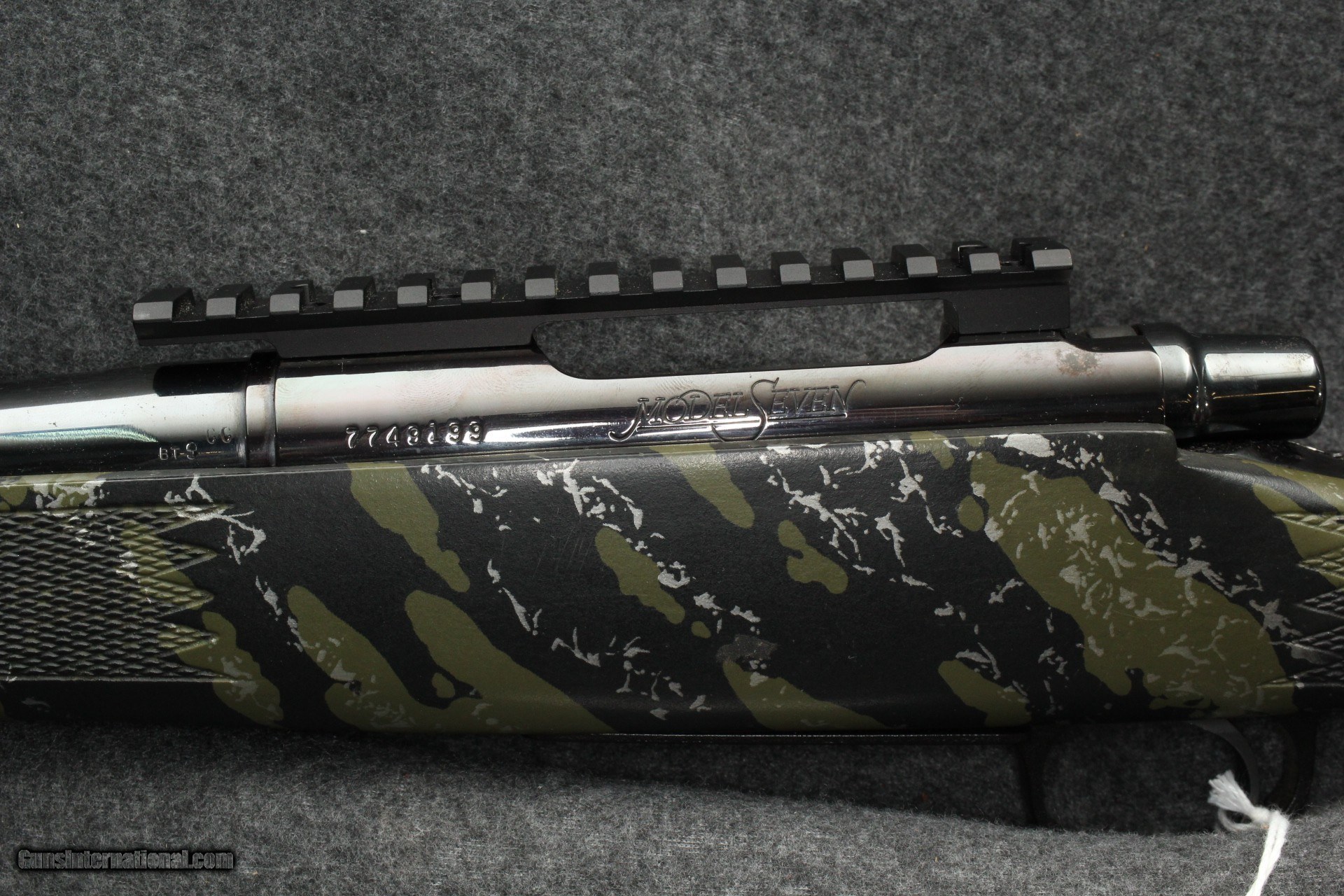 Description: 7mm-08, serial number 7749XXX. 18" barrel, Bell and Carlson camo streaked stock. Leupold scope base. Overall in very good condition. Shows normal wear/use. Metal shows small areas of rust (probably from improper storage), mostly on bolt and receiver. Trigger guard and floorplate shows areas of wear on sharp edges. No iron sights. Bore is excellent. More photos on request. Weighs 6.1lbs. Pleae add $55.00 for shipping and insurance. SOLD Rifle Caliber: 7mm-08 Remington |