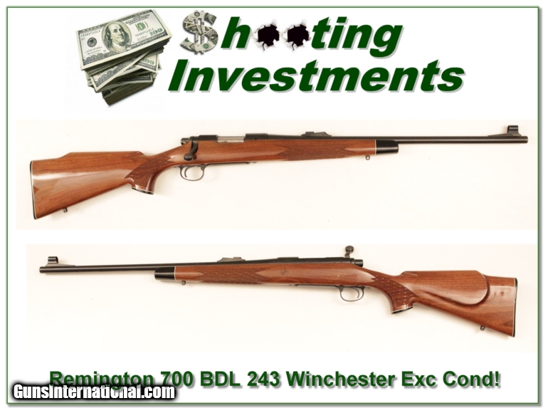 Description: This is an Excellent Condition Remington 700 BDL in 243 Winchester. Blue shows little use and I’m sure never fired many rounds. Wood has only a couple insignificant handing marks. This will make a classic hunting gun in a very nice deer caliber. Shipping and insurance is $30 or $18 more if you want it shipped in a new Plano hard case. Please email me with any questions or larger pictures. (I now consign quality firearms only 10%! Let me know if you have any you would like to sell!) [15-0666] Payment: Payment is by Money Order, Cashiers Check or Personal Check. I can now also accept MasterCard and Visa with a 3% convenience fee. PayPal can be used for some items but never firearms. Please let us know if you would like to pay via PayPal. Shipping: The shipping charge will be listed in each description. It is $30 for most guns. Some heavy guns or those insured for over $2000 may be higher. Shipments to Alaska and Hawaii are higher because air shipment is required. Most firearms are shipped within 5 days of receipt of payment. We prefer shipping at the beginning of the week to avoid firearms in transit over weekends. We package all shipments carefully and insure them for the full purchase price, rounded up to the next $100. In the unlikely event that damage occurs, it is important that you save all packaging material for the claims process. Optics are shipped Priority Mail and most other non-firearm shipments are shipped First Class. Returns: Our return policy is simple. If for any reason you are not pleased with your purchase, you may return your item for a refund. The only exception is ammunition, it cannot be returned. It is important to us that you are happy. Guns cannot be fired or dissembled before returning them and must be returned in the same condition as received. Notification of a return must occur with-in 3 days of receipt at your dealer. Shipping, convenience and dealer fees are not refundable and are the responsibility of the buyer. Lay-a-way: If needed, we offer a 60 day lay-a-way option on most firearms. It is 1/3 now, 1/3 in 30 days and 1/3 in 60 days. Lay-a-way firearm sales are final. Consigning your firearms with Shooting Investments: We will help you get top dollar for your firearms. While most local guns shops charge 20% or more, our fee is only 10% with a minimum of $50. At your local gun shop it might take months to sell. Selling on-line provides instant access to thousands of interested buyers. You won’t find any other on-line dealer willing to sell your firearms for only 10% or listing every gun on 4 separate s. Selling through an House typically costs the seller 15% and the buyer an addition 15% (so 30%) and you have to wait several months to sell and longer to receive funds. If properly priced, we will sell your firearms in a week or two. Send us an email or give us a call and we’ll explain how easy it is for you to get top dollar. Trading: We collect guns and usually just trade for guns we want to add to our collections. We often sell guns for others wanting to purchase one of ours. We find this the most fair to both of us. Our Commission is only 10% and we hold the gun you want until yours sells. Please contact us if you want to sell one of yours to buy one of ours. Help for California Buyers: We are happy to ship to California. It is the buyer’s responsibility to make sure any item you buy is legal in your state. We are also happy to help with your purchase of a firearm from someone other than us. If you see a gun you would like to buy but the seller can’t or won’t ship to California we can help. You buy the gun and have it shipped to us. We’ll then ship it to your California dealer. The cost for this service is only $30 + shipping. Let me know if we can help! SOLD |