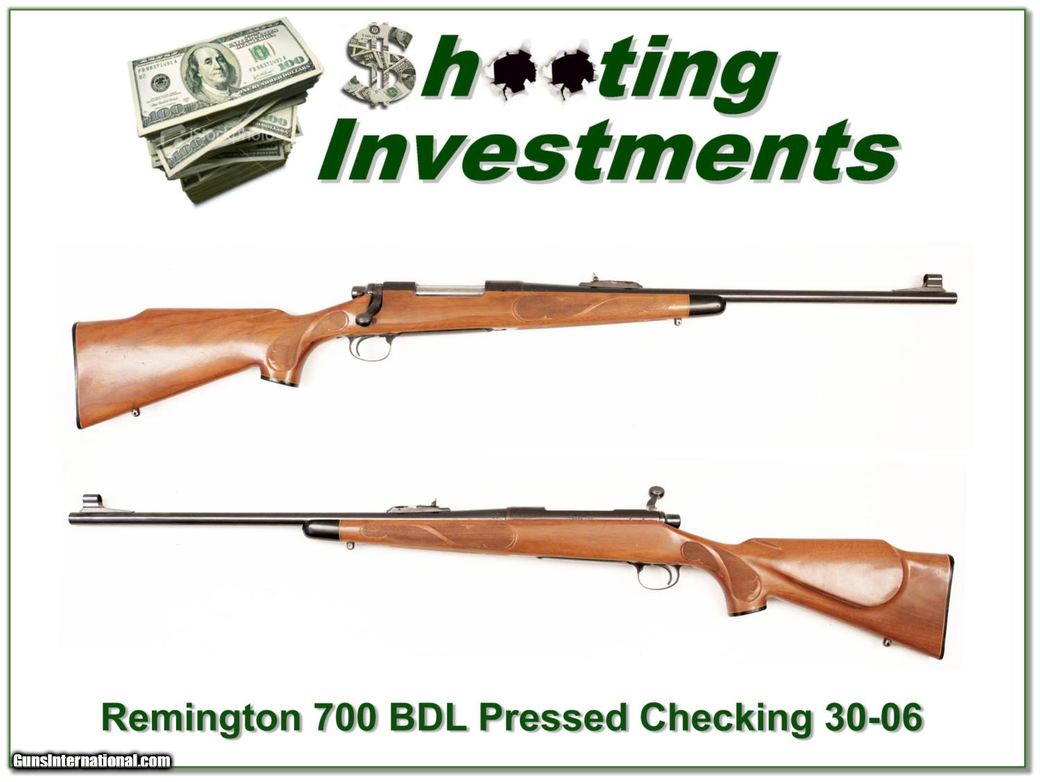 Description: This is an older 60’s Remington 700 BDL in 30-06. It has the older Pressed Checking. The blue is excellent showing little use. The wood has a few marks on the left side under the receiver as shown otherwise excellent. I think that could be touched up to make a really nice vintage Remington. This will make a classic hunting gun! Shipping and insurance is $30 or $18 more if you want it shipped in a new Plano hard case. Please email me with any questions or larger pictures. (I now consign quality firearms only 10%! Let me know if you have any you would like to sell!) [15-1421] Payment: Payment is by Money Order, Cashiers Check or Personal Check. I can now also accept MasterCard and Visa with a 3% convenience fee. PayPal can be used for some items but never firearms. Please let us know if you would like to pay via PayPal. Shipping: The shipping charge will be listed in each description. It is $30 for most guns. Some heavy guns or those insured for over $2000 may be higher. Shipments to Alaska and Hawaii are higher because air shipment is required. Most firearms are shipped within 5 days of receipt of payment. We prefer shipping at the beginning of the week to avoid firearms in transit over weekends. We package all shipments carefully and insure them for the full purchase price, rounded up to the next $100. In the unlikely event that damage occurs, it is important that you save all packaging material for the claims process. Optics are shipped Priority Mail and most other non-firearm shipments are shipped First Class. Returns: Our return policy is simple. If for any reason you are not pleased with your purchase, you may return your item for a refund. The only exception is ammunition, it cannot be returned. It is important to us that you are happy. Guns cannot be fired or dissembled before returning them and must be returned in the same condition as received. Notification of a return must occur with-in 3 days of receipt at your dealer. Shipping, convenience and dealer fees are not refundable and are the responsibility of the buyer. Lay-a-way: If needed, we offer a 60 day lay-a-way option on most firearms. It is 1/3 now, 1/3 in 30 days and 1/3 in 60 days. Lay-a-way firearm sales are final. Consigning your firearms with Shooting Investments: We will help you get top dollar for your firearms. While most local guns shops charge 20% or more, our fee is only 10% with a minimum of $50. At your local gun shop it might take months to sell. Selling on-line provides instant access to thousands of interested buyers. You won’t find any other on-line dealer willing to sell your firearms for only 10% or listing every gun on 4 separate s. Selling through an House typically costs the seller 15% and the buyer an addition 15% (so 30%) and you have to wait several months to sell and longer to receive funds. If properly priced, we will sell your firearms in a week or two. Send us an email or give us a call and we’ll explain how easy it is for you to get top dollar. Trading: We collect guns and usually just trade for guns we want to add to our collections. We often sell guns for others wanting to purchase one of ours. We find this the most fair to both of us. Our Commission is only 10% and we hold the gun you want until yours sells. Please contact us if you want to sell one of yours to buy one of ours. Help for California Buyers: We are happy to ship to California. It is the buyer’s responsibility to make sure any item you buy is legal in your state. We are also happy to help with your purchase of a firearm from someone other than us. If you see a gun you would like to buy but the seller can’t or won’t ship to California we can help. You buy the gun and have it shipped to us. We’ll then ship it to your California dealer. The cost for this service is only $30 + shipping. Let me know if we can help! SOLD |