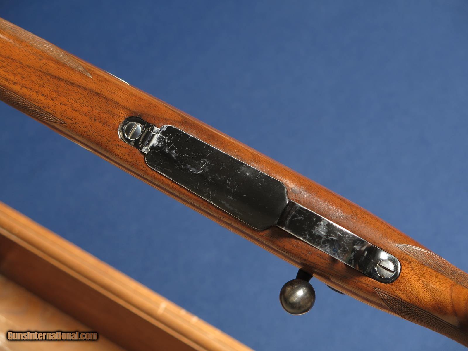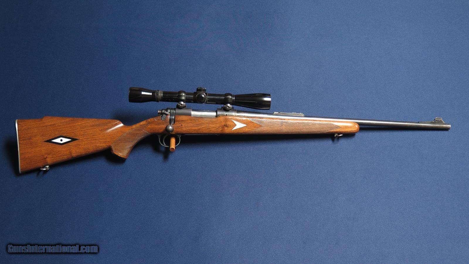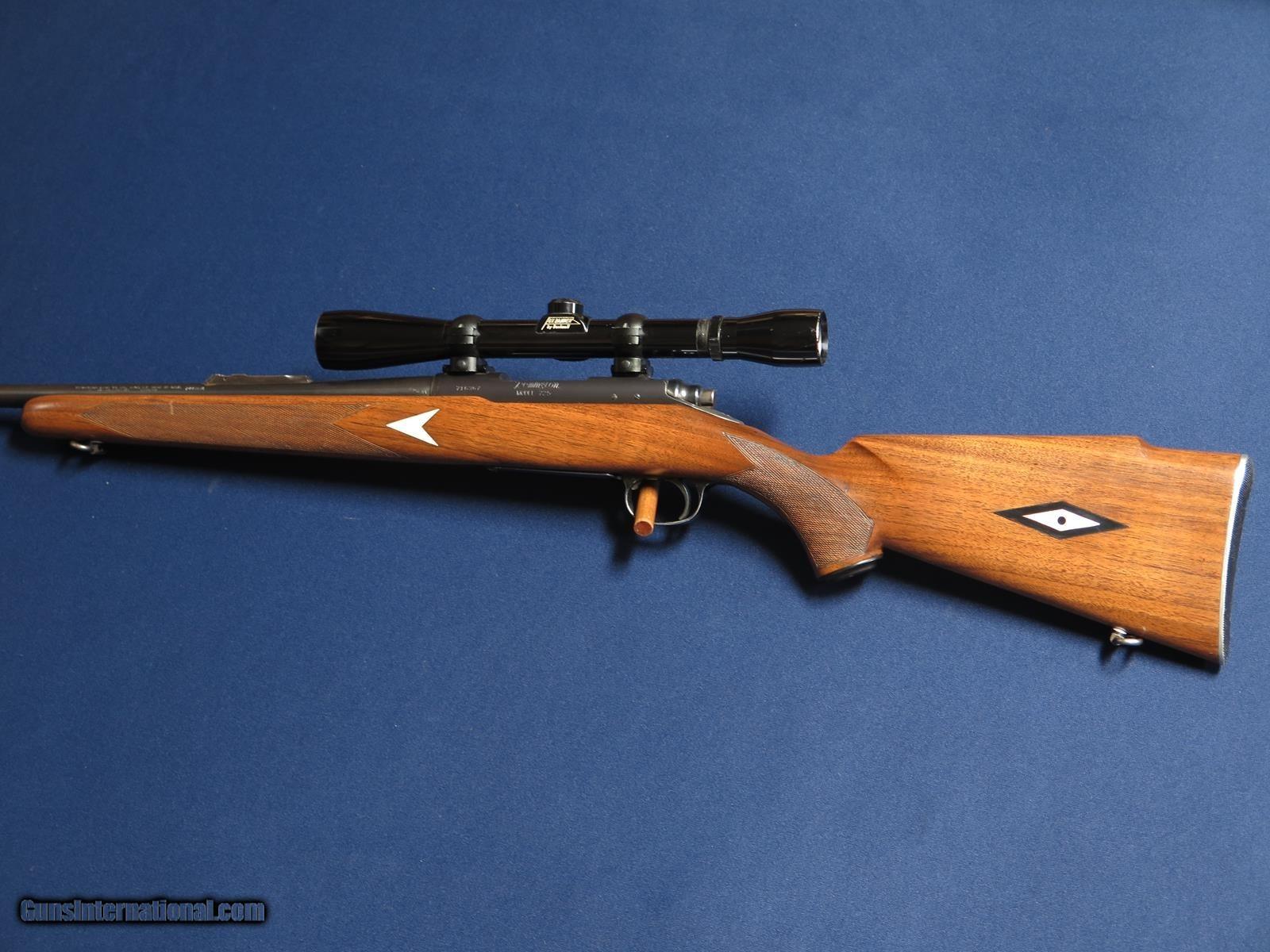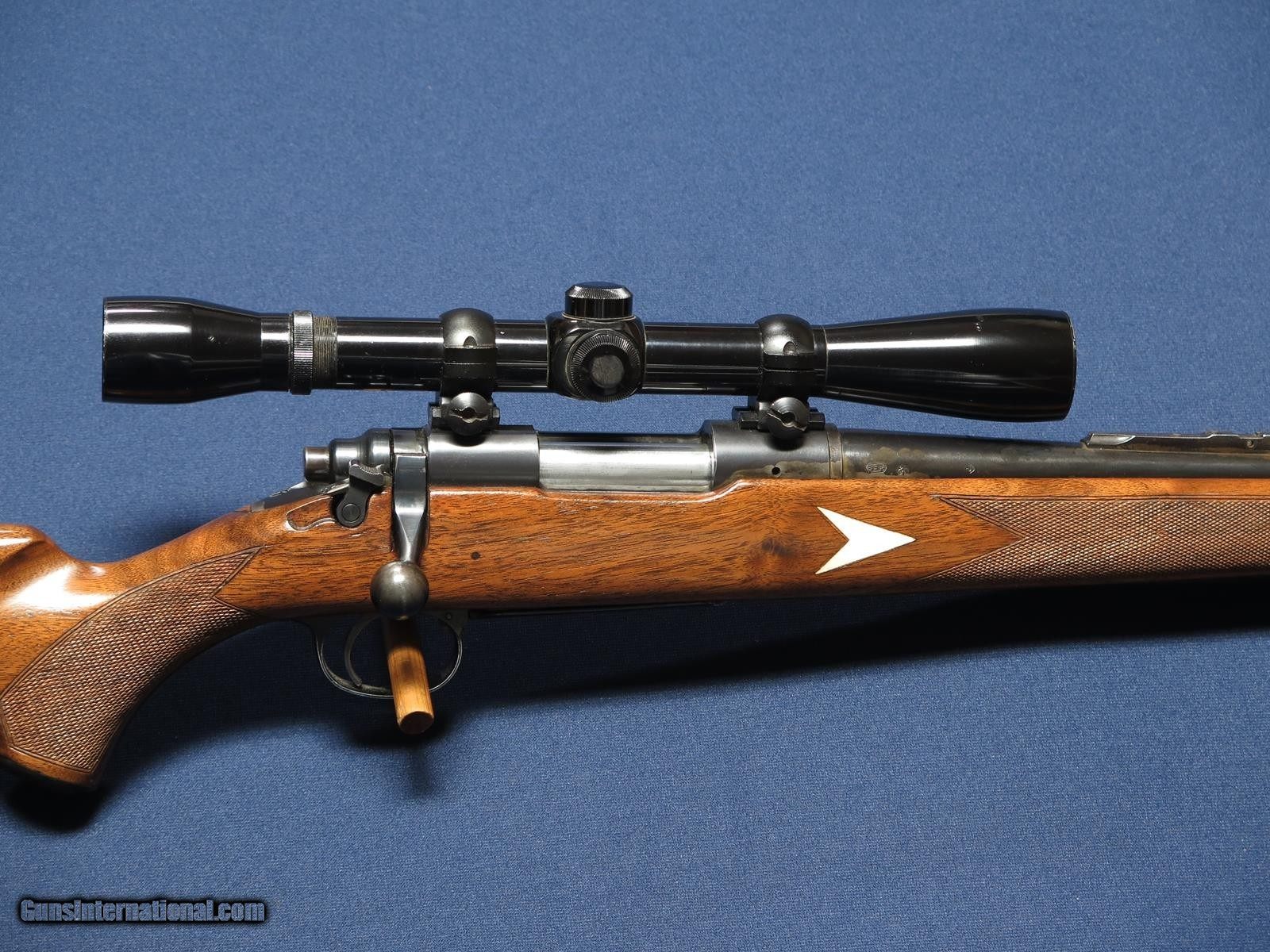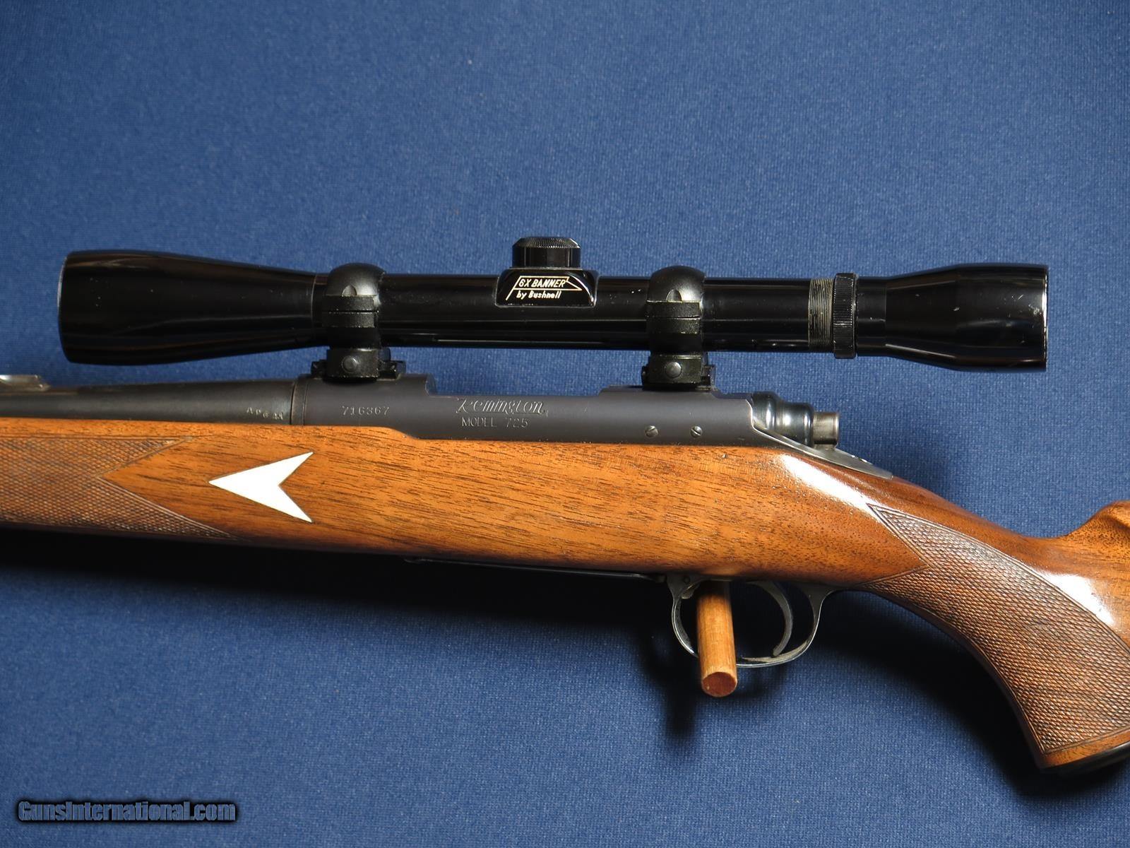Description: Remington 725 244 Rem. 22 inch barrel. Diamond pattern inlets in stock. Top part of rear sight removed and Bushnell Banner 6x scope added. Correct Remington metal butt plate and grip cap. Shows some blue wear. No cracks in wood. Excellent bore.. SOLD Rifle Caliber: .244 Remington |
