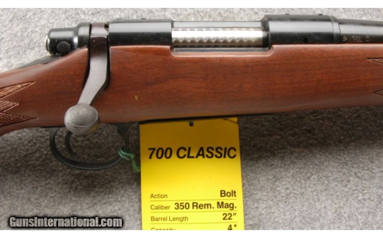 Description: This is a pre-owned but new in the box Remington Classin in the hard hitting .350 Rem Mag. Any marks you can see in the metal are nothing more then dry factory oil and grease. The nice American walnut stock looks like new. If you are a Remington rifle collector this would be a nice one for you. SOLD Manufacturer: 1985 Caliber Info: .350 Rem Mag Chambers: Bolt action repeater. Metal Condition: ANIB. Wood Condition: ANIB. Bore Condition: ANIB. Barrels: 22 inch round blue with sights. Triggers: Single blue. Stock: Very nice American Walnut with a checkered pistol grip. Stock Dimensions: 13 3/8 inch LOP. Fore End: Matching checkered walnut. Butt Pad: Brown Remington rubber butt pad. Weight: 6 Lbs 11 Oz. Sights: Factory adjustable rear and a hooded front. Extras: Comes with the factory box and the factory paperwork. Item Location: Owatonna, MN |