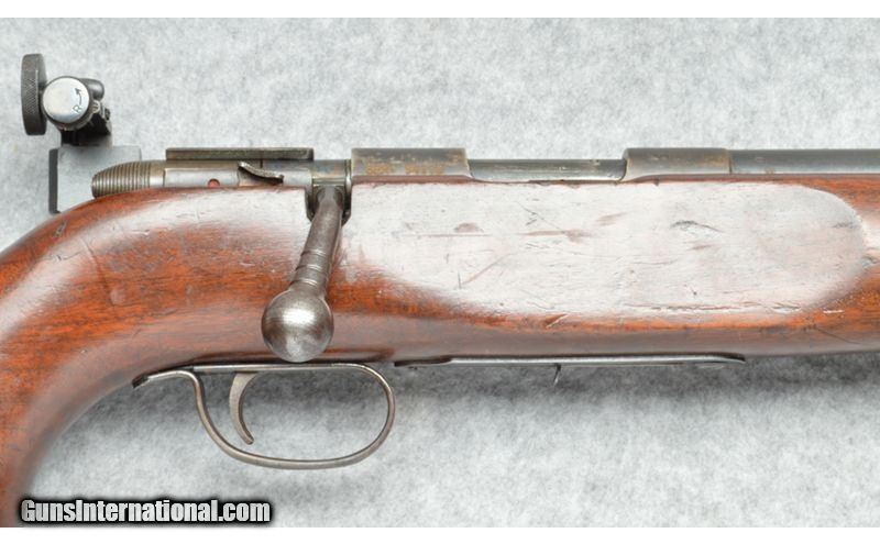 Description: .22 Long Rifle SOLD Chambers: "Bolt action, five round detachable magazine. (No magazine included). Metal Condition: "Good, some wear and fading of the bluing. Wood Condition: "Good, some dings and small dents. Barrels: 26 inch rifled heavy target barrel. Triggers: Single stage trigger. Stock Dimensions: 13 1/2 inch length of pull. Fore End: "Smooth wooden beaver tail fore-end with adjustable sling position points, integrated with the stock. Butt Pad: Black checkered steel butt plate. Sights: Globe front sight with a post insert. Rear sight is a Redfield peep sight adjustable for elevation and windage. Item Location: Berlin |