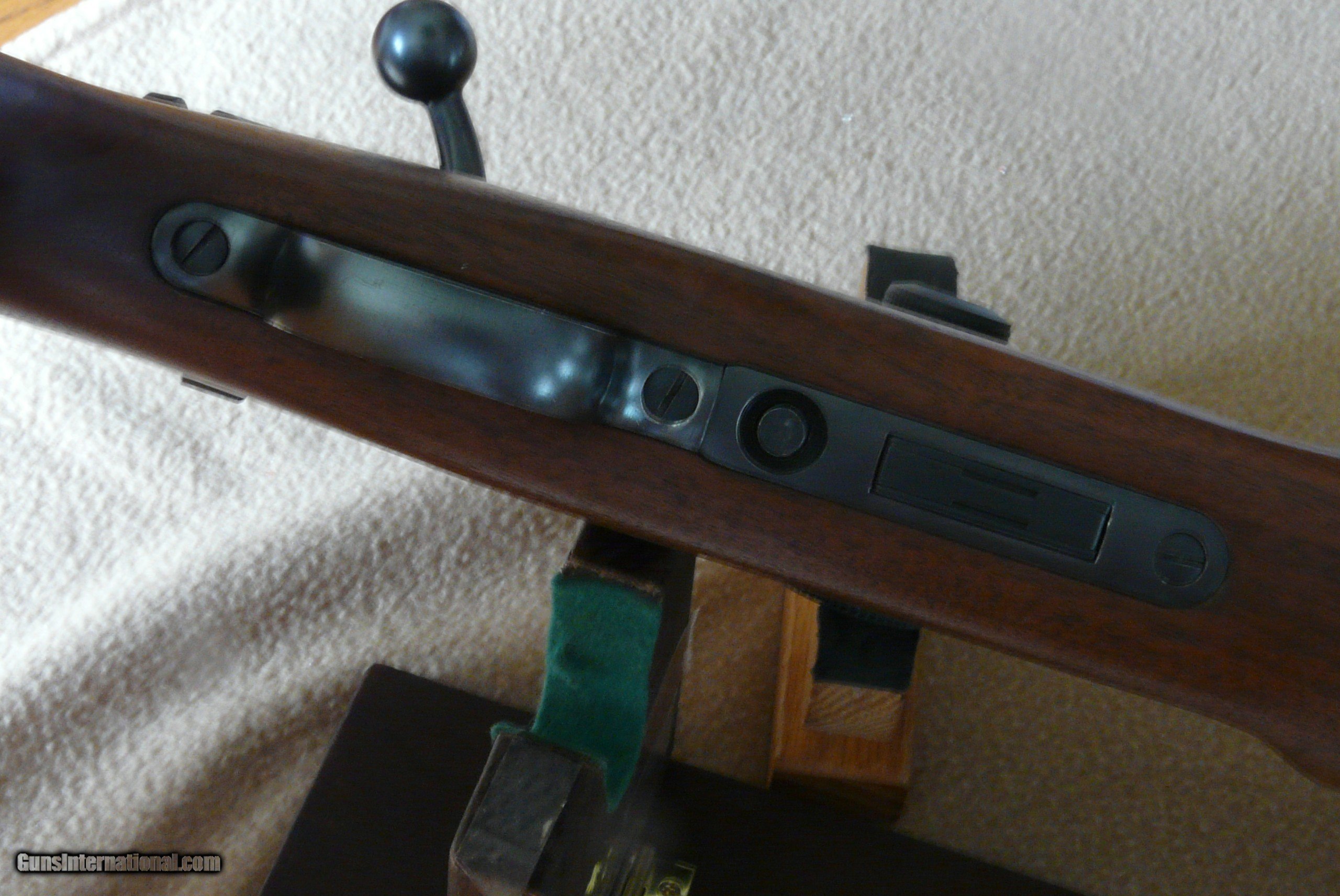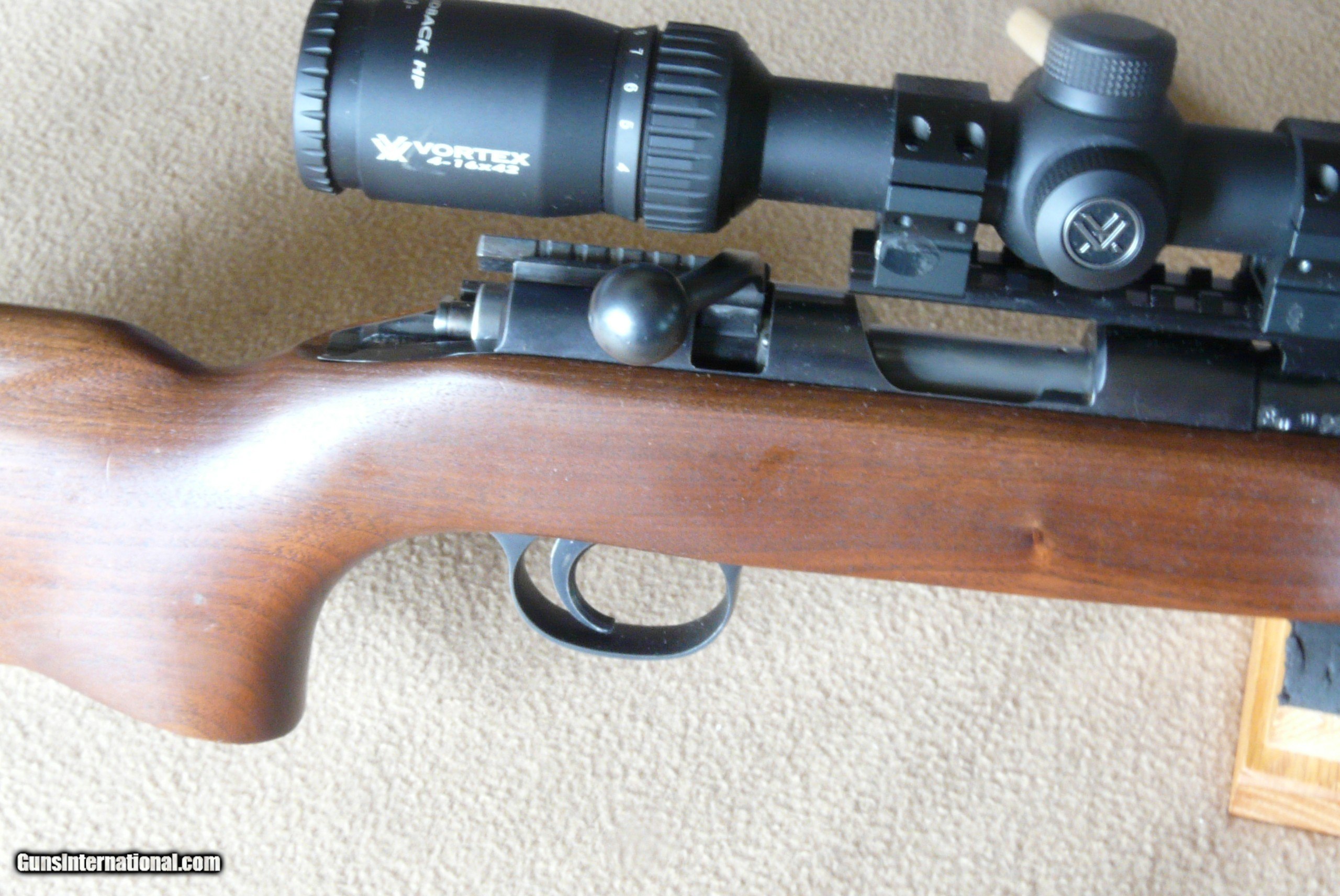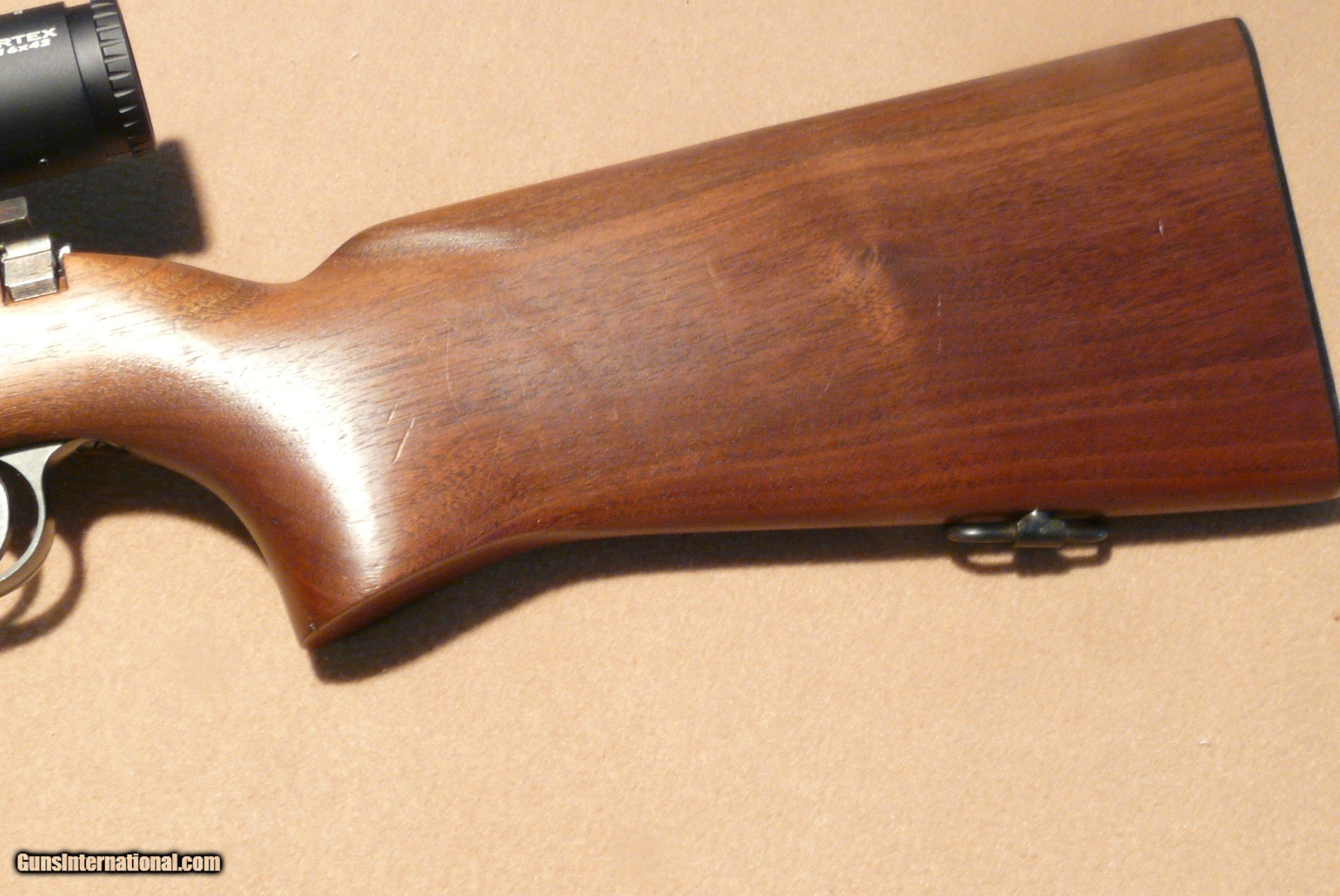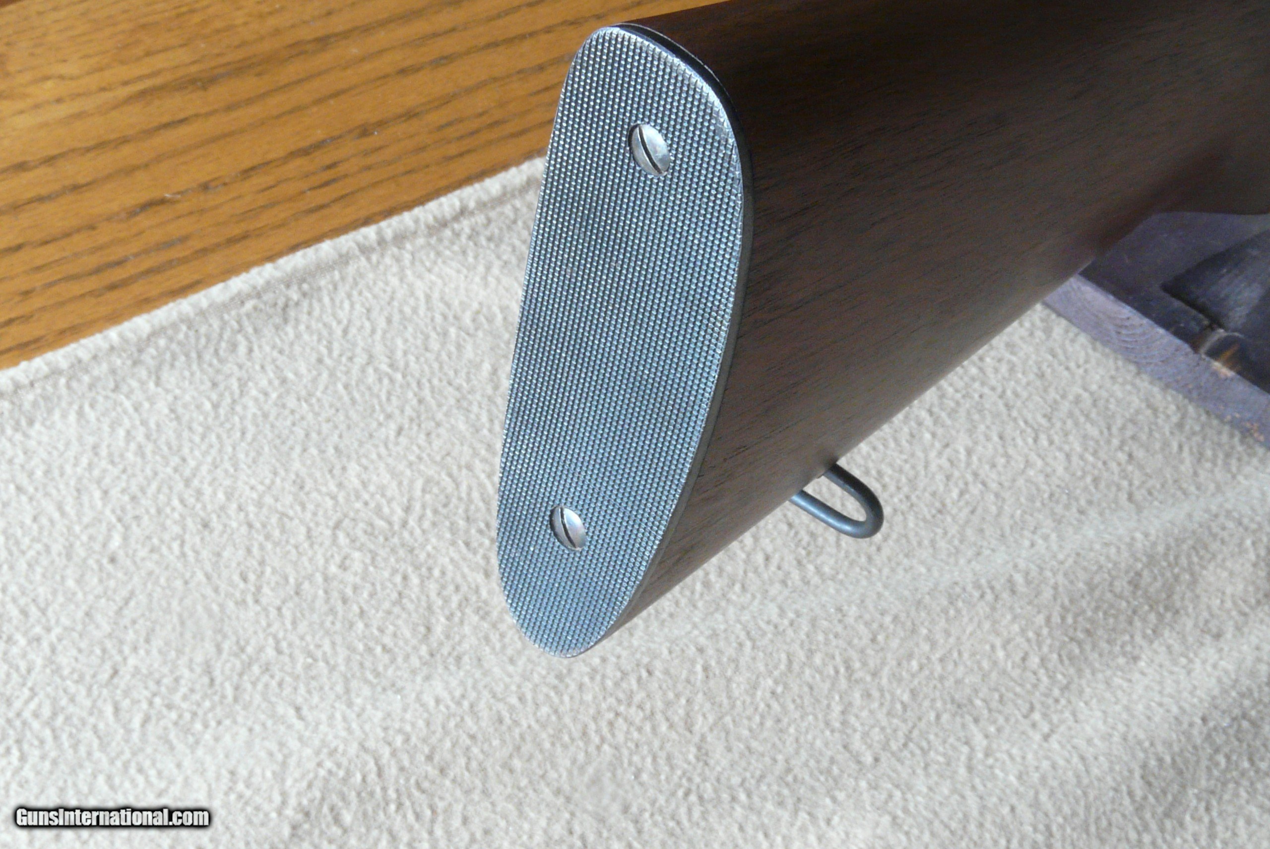 Description: Serial # 11923 this model 37 has had little use with over 98% blue, and 99% wood, small spotting on bbl, (in pic) left side front, keeps it from mint really! Fantastic trigger like all of them I would guess . Bbl measures 3/4" at muzzle, wgt 12.5 lbs with Vortex Diamondback 4X16 scope ! This rifle action tight as new ! Buttplate checked steel, original steel magazine ! Hard to get better . SOLD |