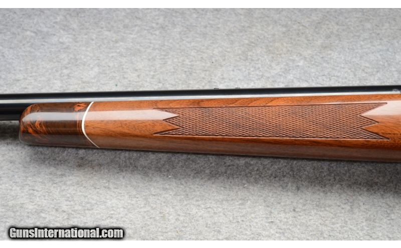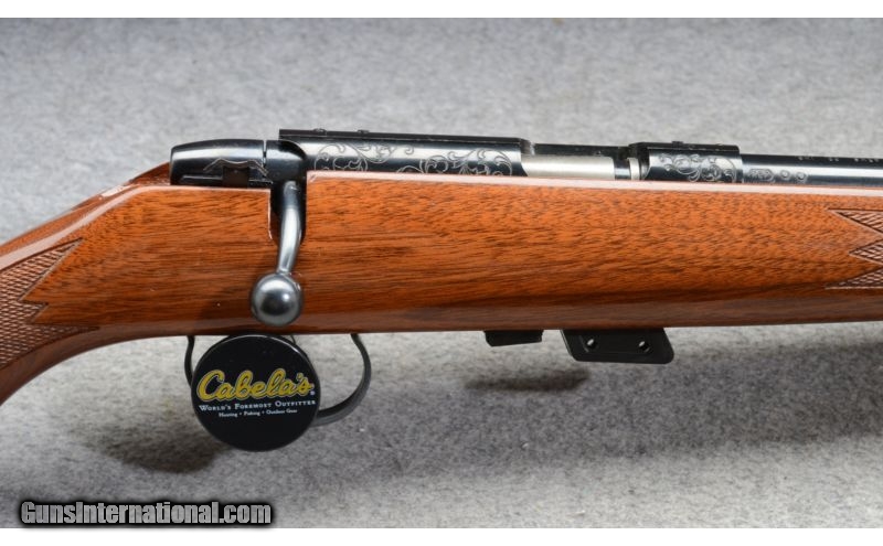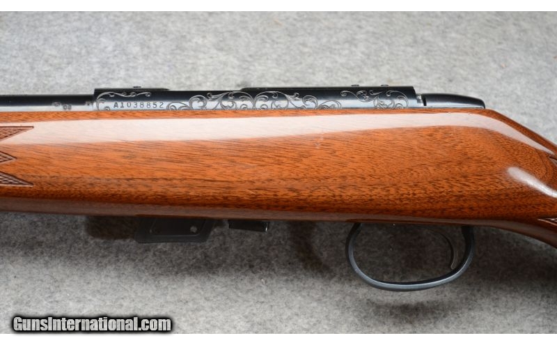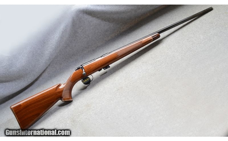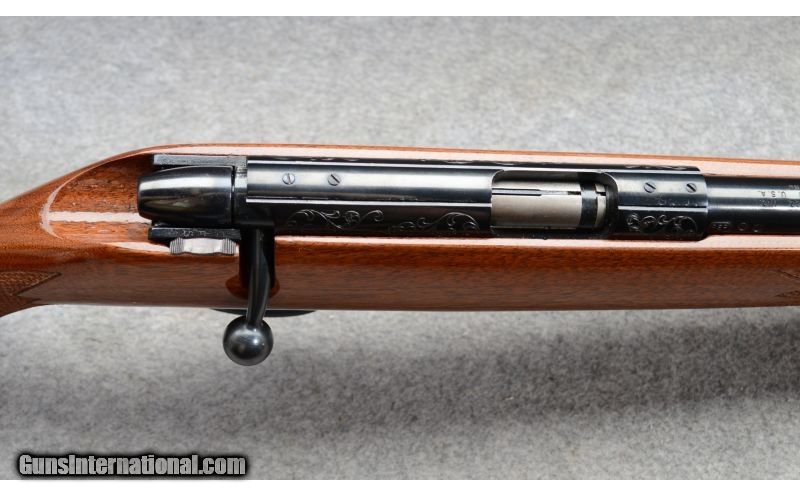 Description: SOLD Caliber Info: .22 Long rifle Chambers: 5 - shot magazine Metal Condition: Excellent. You will have to look hard for any wear marks. Wood Condition: Very good to excellent. There are a number of shallow nicks and dents distributed over all the surfaces. Bore Condition: Bright and shiny Barrels: 24 inch Stock: Checkered walnut pistol grip with contrasting Rosewood grip and forearm tip caps. Stock Dimensions: 13 - 1/4 inch LOP Butt Pad: Checkered Rosewood plate Weight: 5 lb. - 12 oz. Sights: Drilled, tapped, and grooved for your choice in Optical or open sights. Extras: One magazine Item Location: Rogers,, MN |