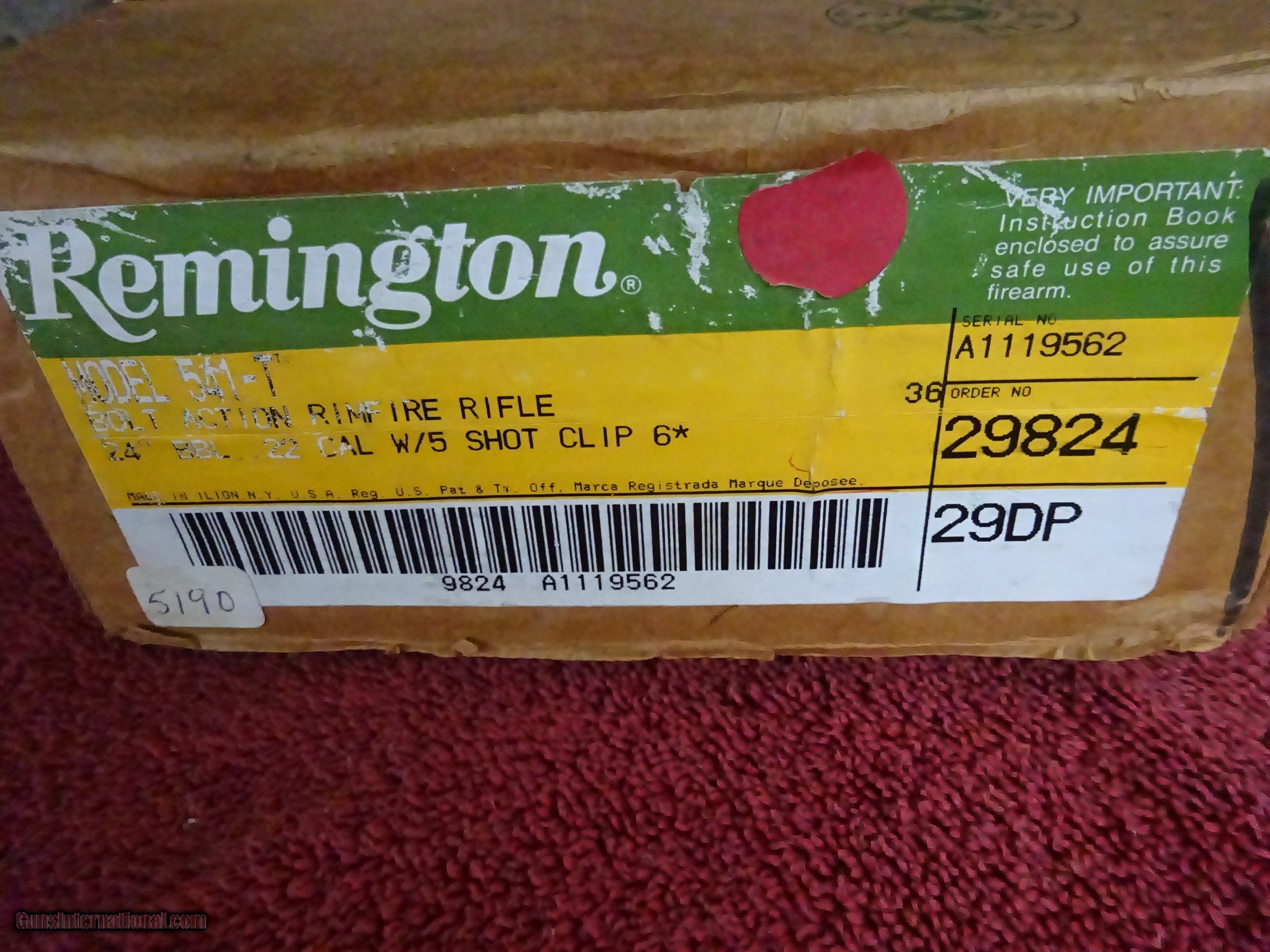 Description: REMINGTON MODEL 541-T, BOLT ACTION RIFLE, 24" STANDARD BARREL, 22 L.R., 5 SHOT CLIP MAGAZINE. PISTOL GRIP AMERICAN WALNUT STOCK, CHECKERED GRIP AND FOREND, SATIN WOOD FINISH, BLACK PLASTIC GRIP CAP, FOREND TIP AND BUTTPLATE. LIKE NEW IN ITS ORIGINAL SERIAL-NUMBERED BOX. GUN IS IN EXCELLENT CONDITION. $1750.00 + $70.00 Insured shipping to an FFL address. Layaway is available. See all Pats gun listings on this site! We also have hundreds of ORIGINAL gun company advertising & memorabilia pieces available for sale on our site SPORTINGCOLLECTIBLES. We have no reprints or reproductions. Email for more information. If you need to call, morning or evening is best, and please note the Seller's Inventory number. SOLD |