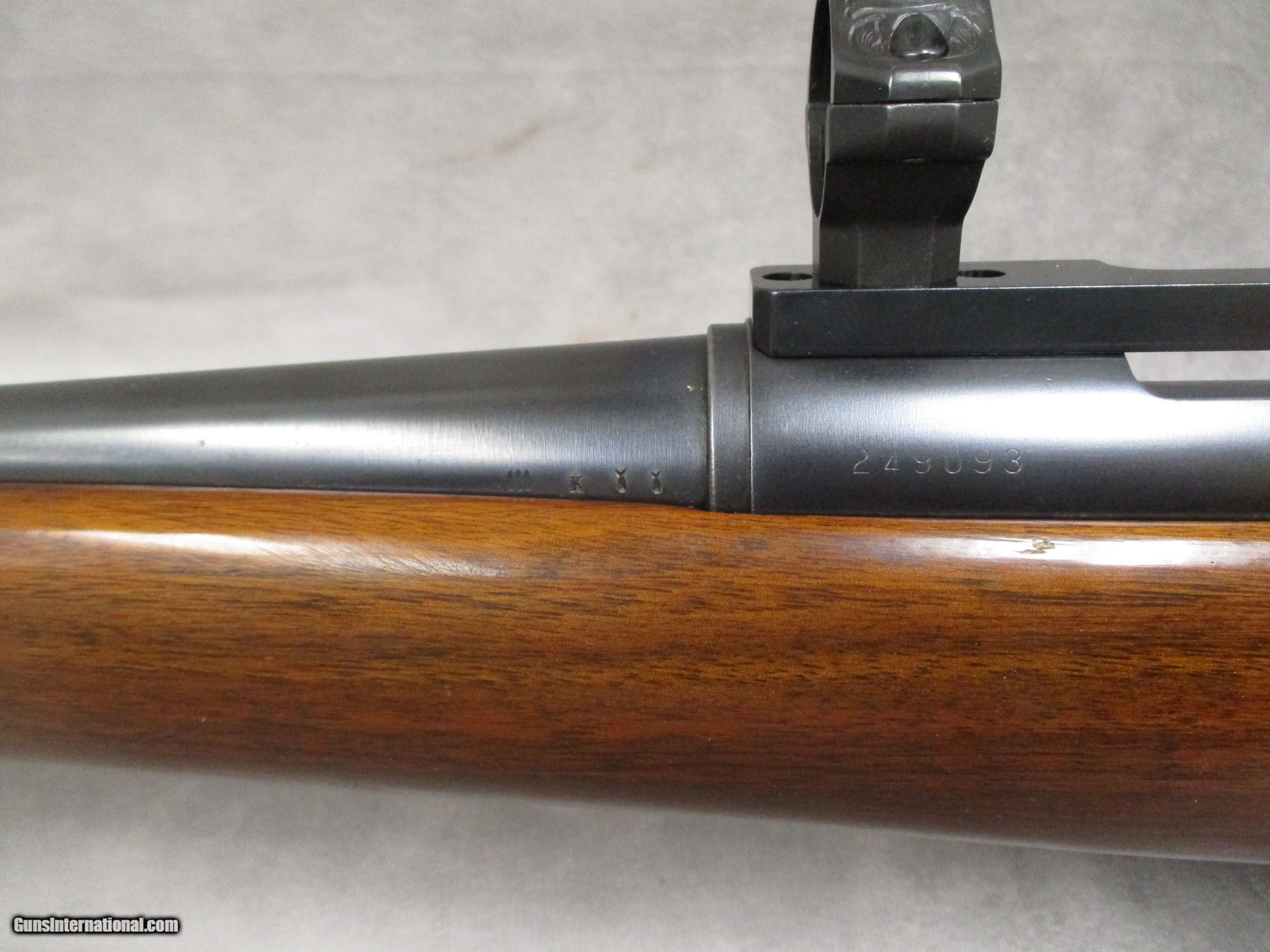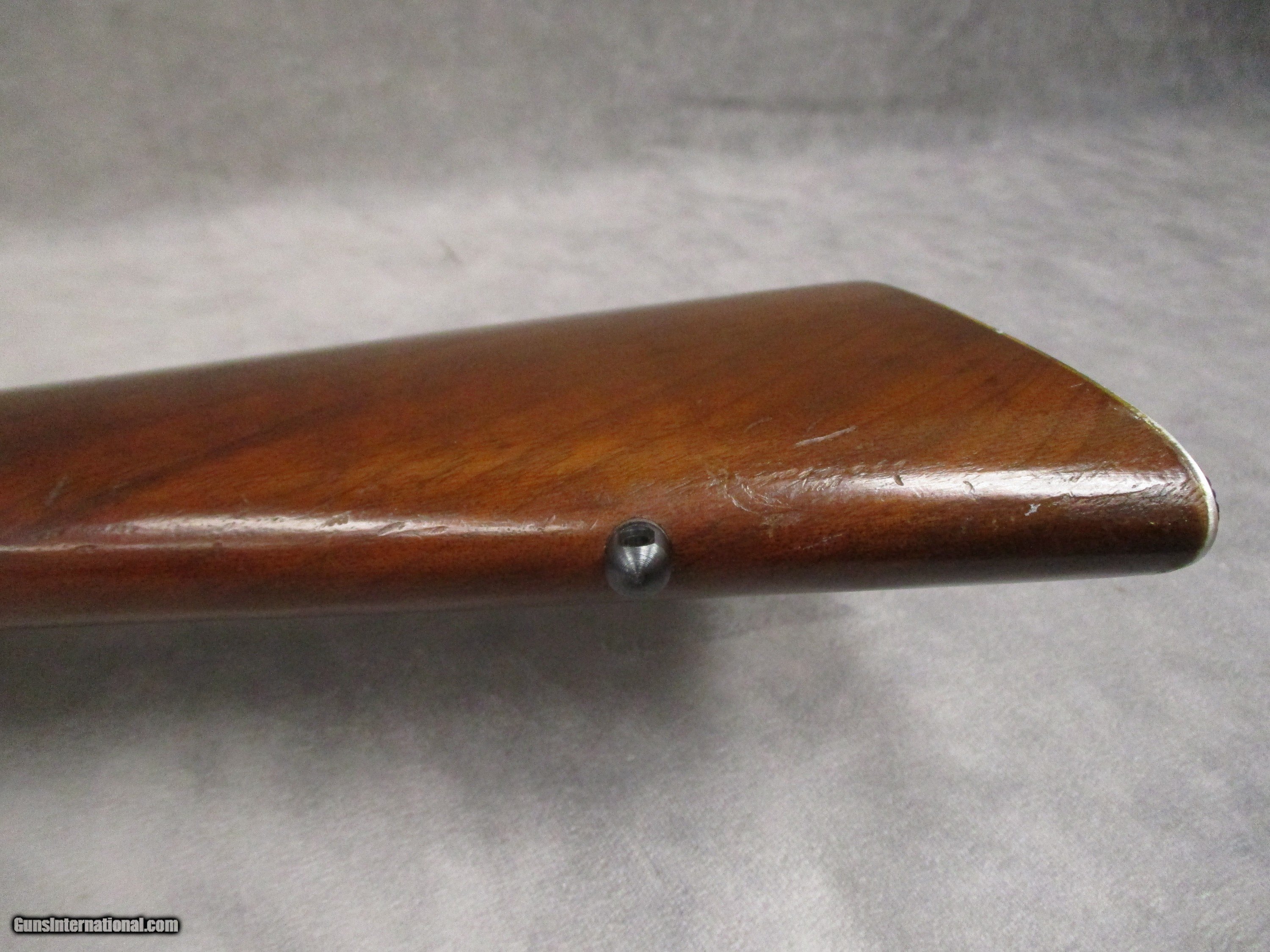 Description: The Models 721 and 722 are considered to be some of the first modern, economically produced sporting rifles, their design largely being continued with the following and highly successful Model 700. Both the 721 and 722 replaced the short-lived Model 720, a development of the Model 1917 rifle, and hence, a development of the Mauser Model 1898 rifle. Manufactured with a high level of precision, both the 721 and the 722 are known for their exceptional accuracy. Remington marketed the two rifles as having the strongest action ever built, a trait they shared with their Mauser forebearer. Unlike the Mauser, however, the 721/722 featured a new encased bolt head. The large claw extractor of the Mauser was deleted in favor of a smaller, but effective part mounted within the recessed bolt face. Examples in excellent condition have become very collectible in recent years. Both the 721 and 722 were introduced in 1948. Production of both ceased when the Model 700 was introduced in 1962. The only real difference between the 721 and 722 was that the 721 used a long-action while the 722 used a short-action. The year of manufacture of almost any Remington rifle can be determined by looking at the barrel code. This usually consists of two letters while some may have three letters. The first letter refers to the month with the code based around the phrase “B-L-A-C-K-P-O-W-D-E-R-X” where B = January, with each following letter indicating the remaining months of the year. The first letter of this rifle is the letter “K”, indicating it was manufactured in May. Starting in 1943, Remington began using double letters to indicate the year of production instead of only one. Thus, rifles manufactured in 1943 will have “MM” stamped on the barrel after the 1st letter. This practice was continued until January of 1954 with “AA.” Starting in February of that year, the second letter “A” was dropped. The year stamp for the rifle here is “YY.” The twin letters indicate the rifle was produced in 1952. The rifle is chambered for the older .222 Remington cartridge, introduced to the 722’s cartridge lineup in 1950. Originally, the 722 was only chambered for the .257 Roberts and the .300 Savage. The .222 Remington’s claim to fame is that it was the first commercial rimless .22-caliber cartridge in the U.S. It was an entirely new design and has no parent case. It was popular from its introduction in 1950 until the 1970s. It was known by such nicknames as the “triple deuce”, “triple two”, and “treble two”. The rifle is in excellent shape for its age (71 years and 8 months). The stock retains the majority of its original finish. There is the usual handling wear such a small nicks or dents in the wood, but no cracks. The barrel and receiver retain most of their original finish. The front sight and its base have been removed. The bore is, of course, in excellent shape. The bolt handle exhibits some micro-pitting which could be fixed with a little bit of Flitz metal polish. The bolt operates very smoothly. The scope rings feature laser-engraving. This 722 would make an excellent hunting rifle. SOLD Rifle Caliber: .222 Remington Manufacturer: Remington Arms Co. Model: 722 Serial Number: 249093 Bore: Rifled, 6 grooves, 1:14 inches (356 mm) RH twist Ejectors: Manual ejection via operation of the bolt Condition: Excellent Barrels: Carbon Steel Barrel Type: Sporter contour Action: Bolt-Action, push feed Triggers: Serrated Stock: Wood Fore End: Wood Butt Pad: Metal plate LOP: 13.25 inches (336.55 mm) Finish: Satin Blue Sights: None, optic ready Manufacture Date: May 1952 |
