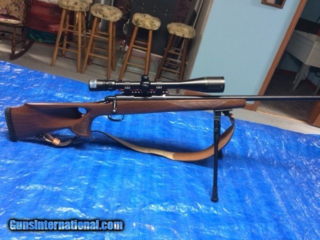 Description: Remington Model788 bolt action rifle,clip fed, in 22-250 cal ,20" bull barrel,NEW Walnut Thumb Hole Stock,Bushnell Elite 6-24x 40 scope NEW, Timney adjustable trigger set 2lbs,0 creep. Adjustable bipod and Wide Leather sling..Gun was reblued by East Coast Gun Bluing (they did a super job) I also have the Original stock with Remington Butt Plate for this gun which I will include if buyer wants it. SOLD Manufacturer: Remington Model: 788 Caliber Info: 220250 Wood Condition: excellent Bore Condition: excellent |