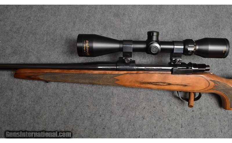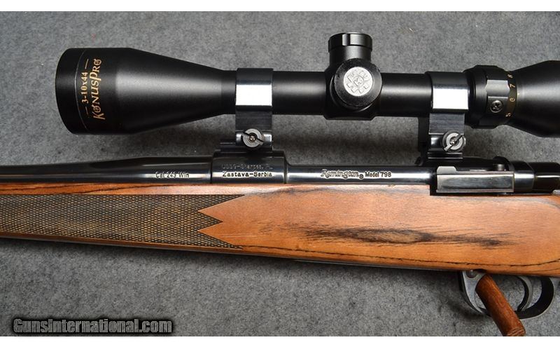 Description: This Mauser 98 bolt action rifle is a Zastava Remington Model 798 chambered in .243 Winchester. It is composed of an imported Zastava Arms barreled action assembled with a laminated stock. This is an all-steel, controlled-feed action using a flat-bottom receiver with an integral recoil lug, one-piece bolt with dual locking lugs plus a third safety lug and a bolt guide, full-length extractor, solid steel one-piece bottom iron/magazine box/trigger guard, hinged magazine floor plate, and all of the usual Mauser 98 deluxe features. Two position Sporter style safety. Includes detachable sling swivel bases and 1" black recoil pad. It is in excellent condition furniture and steel, with only very minor noticeable handling wear. It comes with a KonusPro 3 - 10 X 44 scope. .243 Winchester SOLD Metal Condition: High gloss bluing in excellent condition Wood Condition: Laminated wood is in excellent condition Bore Condition: "Bright and shiny bore, crisp rifling Barrels: 22 inch barrel Stock Dimensions: "13¾ LOP, 42¼ inches overall length Fore End: Checkered Laminated wood stock Butt Pad: Original Remington hard rubber butt pad Weight: 9 lb 0 oz Sights: KonusPro 3 - 10 X 44 scope Item Location: Wichita, KS |