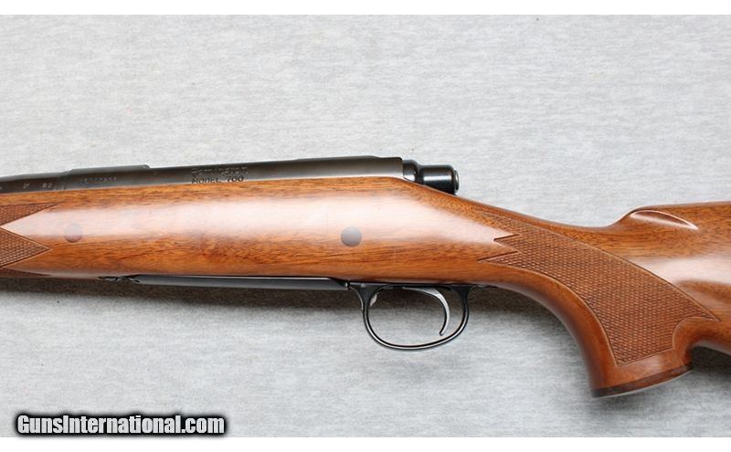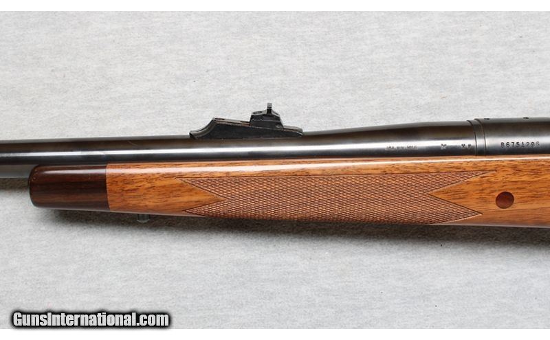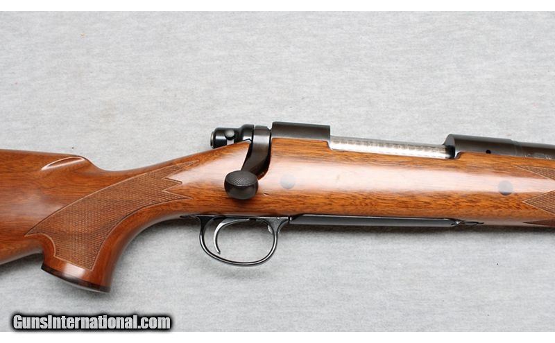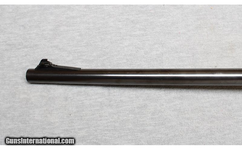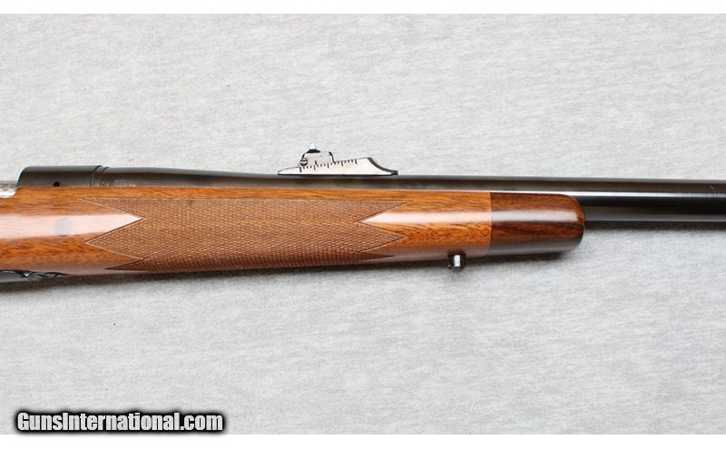 Description: Remington 700 custom shop rifle chambered in 458 Winchester. Bolt Action Rifle with Hinged Floorplate. Stock has rose tips and a 24" barrel. The left side of the receiver is marked with the serial number at the breech and "Remington / MODEL 700" at the midsection. The left side of the barrel is marked "458 WIN MAG", with an inspection mark. The right side of the barrel is marked with magnaflux and proof marks at the breech. There are iron sights on this rifle. The front and rear of the barrel are both drilled, tapped, and filled. The top of the receiver has two pairs of drilled and tapped holes. The stock is checkered wood with a fluted straight comb, wood capped reinforcing screws, a rubber buttpad. The LOP measures 13 1/2". The bore is bright, and the rifling is sharp. There is no erosion in the bore. .458 Winchester Magnum SOLD Metal Condition: Verty Good Wood Condition: Very good with minor handling marks Bore Condition: Bright Barrels: 24 Inches Triggers: Factory Stock Dimensions: LOP 13 1/2 Inches Fore End: Checkered Walnut Butt Pad: Rubber Pad Sights: Ramp adjustable rear sight and drilled and tapped for scope bases Item Location: La Vista, NE |